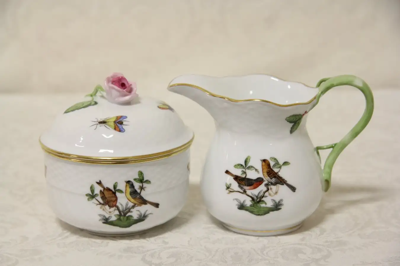 Famous hand painted and signed "Herend" china, this "Rothschild Bird" pattern covered sugar with rose and bird creamer measure 4" tall and 3 3/4" tall.