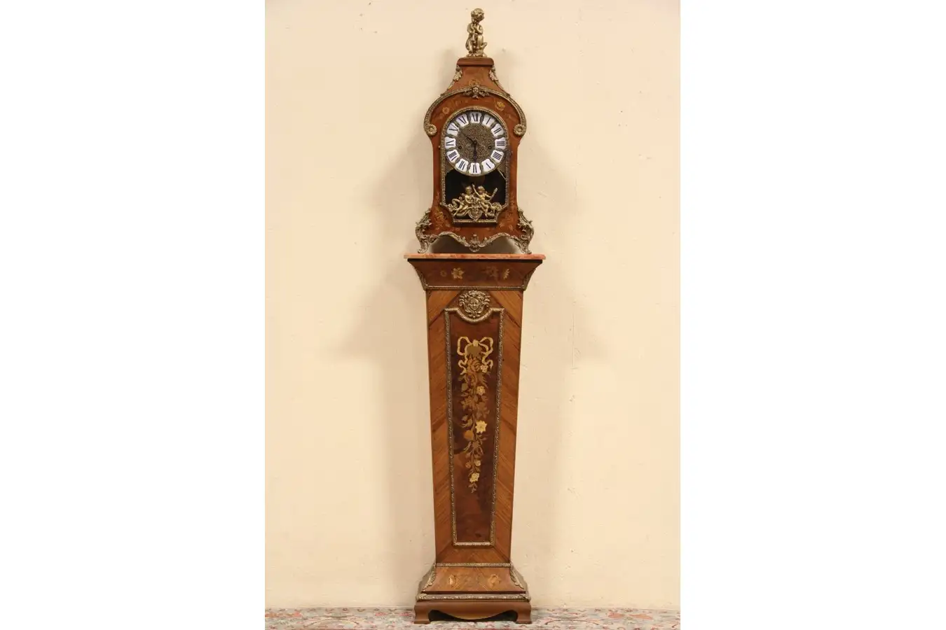 The original hand rubbed satiny finish is in excellent condition. Exquisite floral marquetry is masterful, even inside the clock case. The embossed dial has porcelain hour makers. Salmon marble on the base has a shaped edge and bright polish.