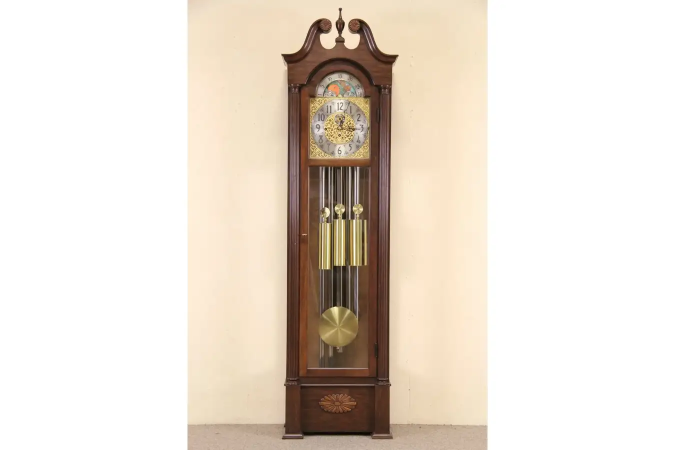 Around 40 years old, this grandfather or tall case clock is signed by famous maker, "Herschede of Starkville, Miss." All original, the mahogany case has a very fine finish with only minor mars, see photos.