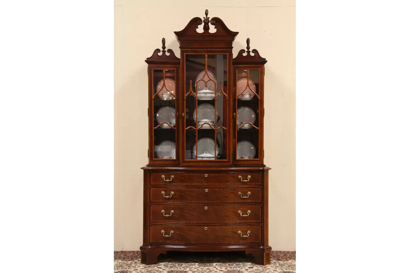 Two separate pieces for easier moving, the upper section is lighted and has traditional carved grillwork. The pediments at the crown have flame shaped finials. Adjustable plate glass shelves have a carved plate groove for display.