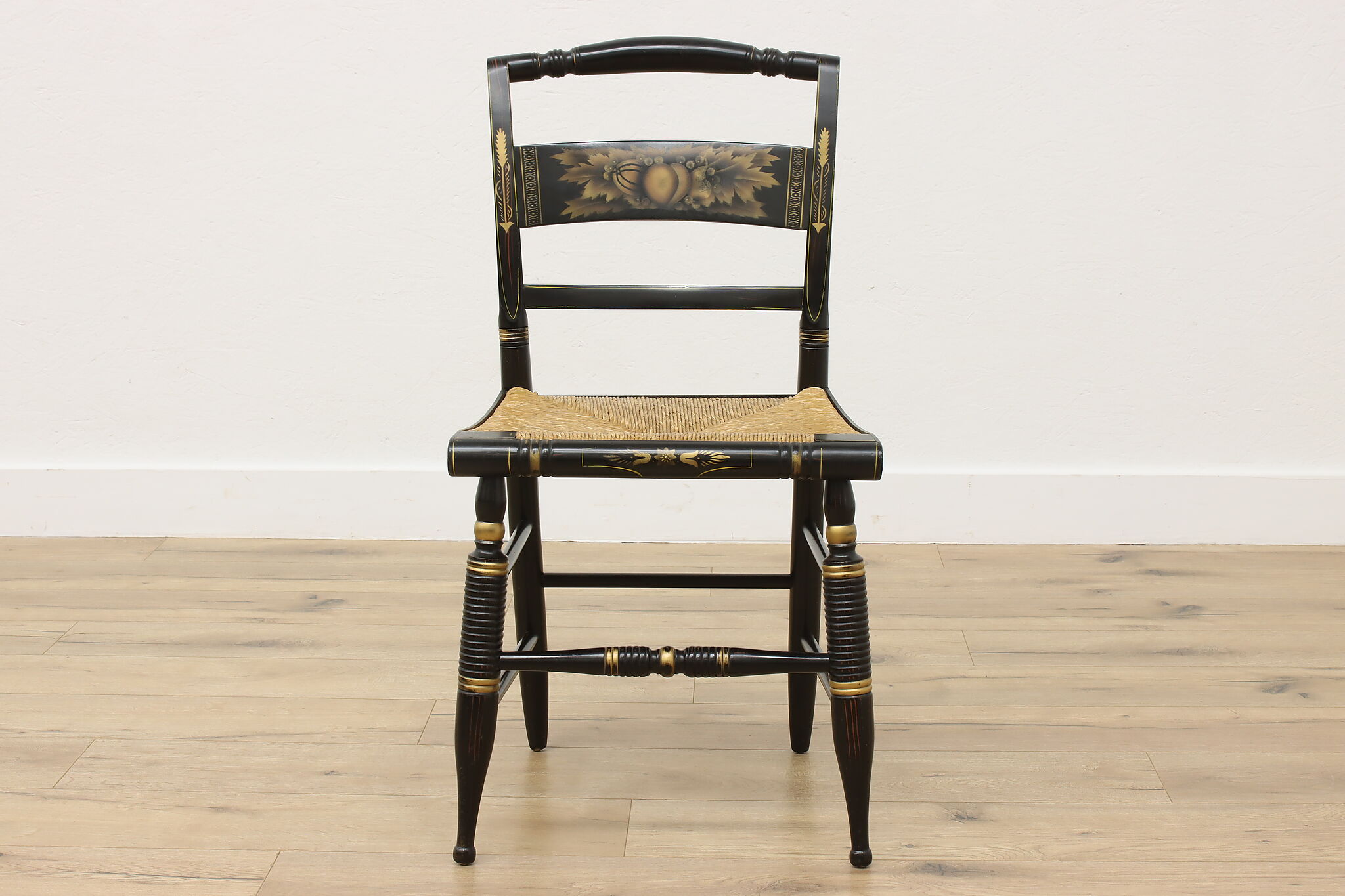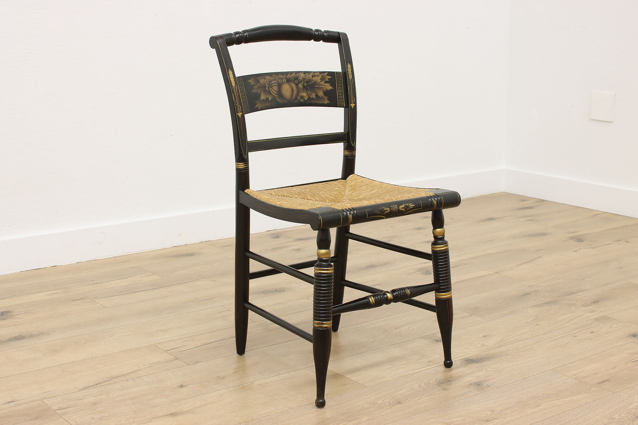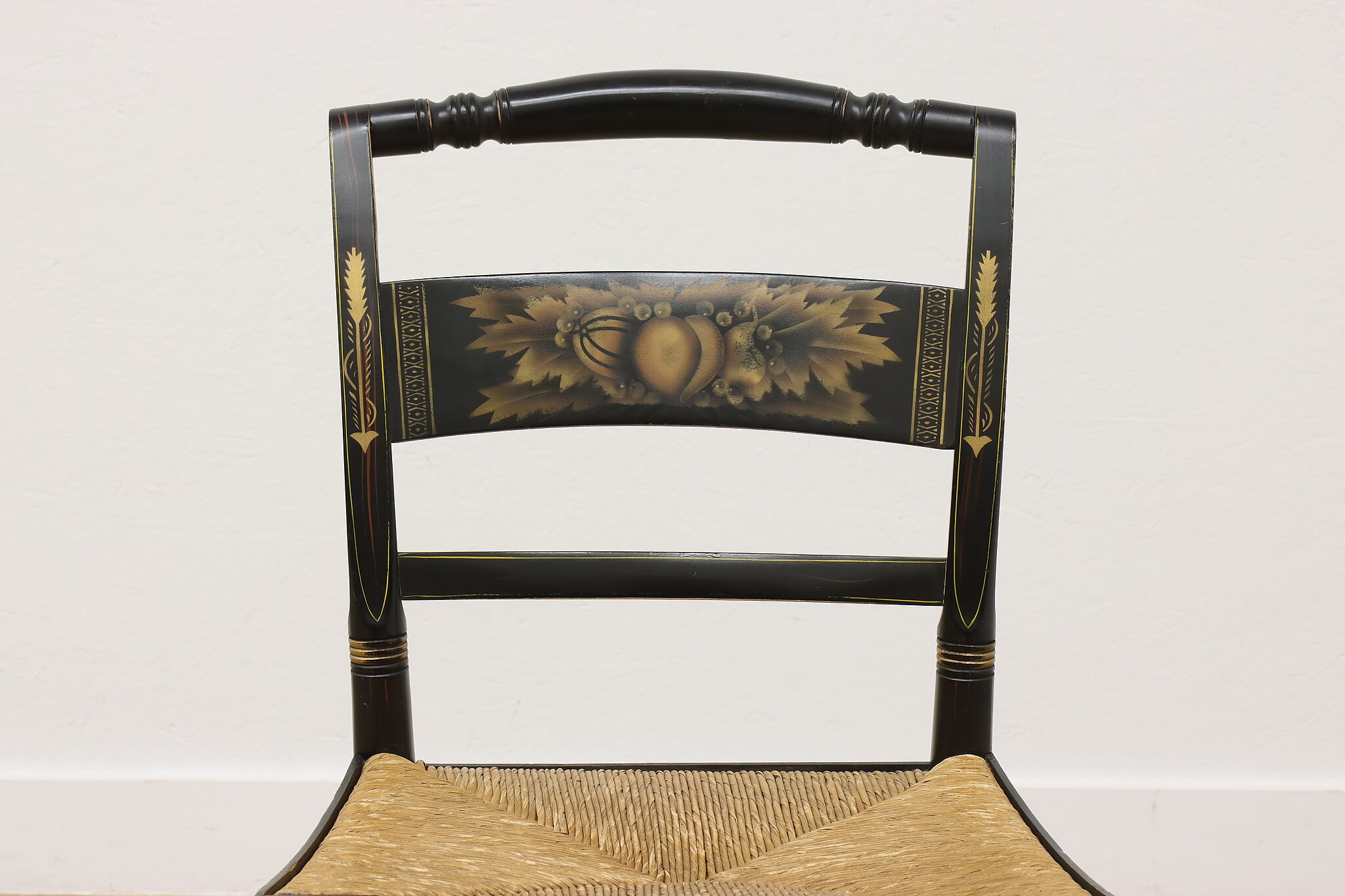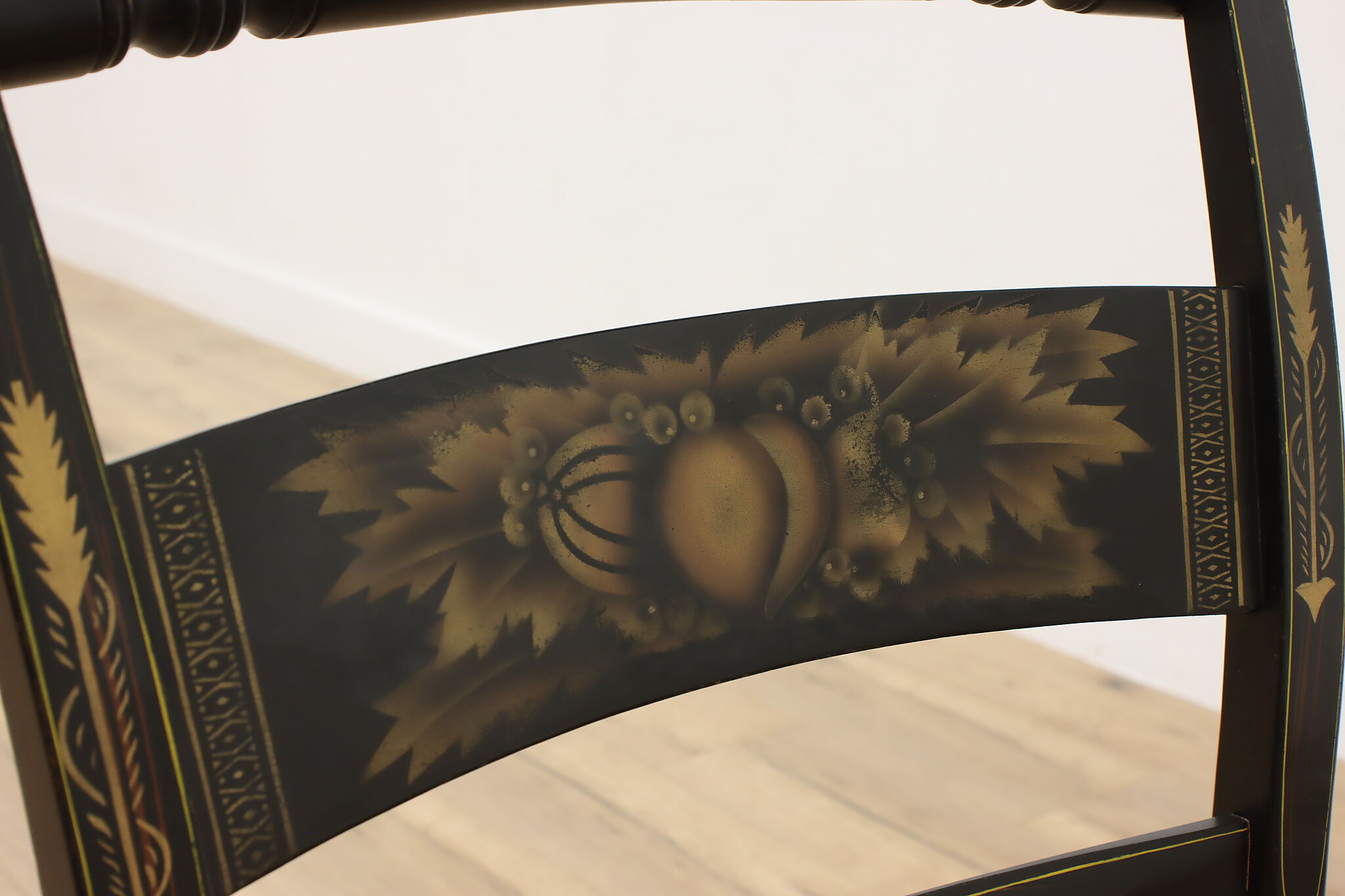 A fantastic Hitchcock side or desk chair has charmingly painted fruit motifs.