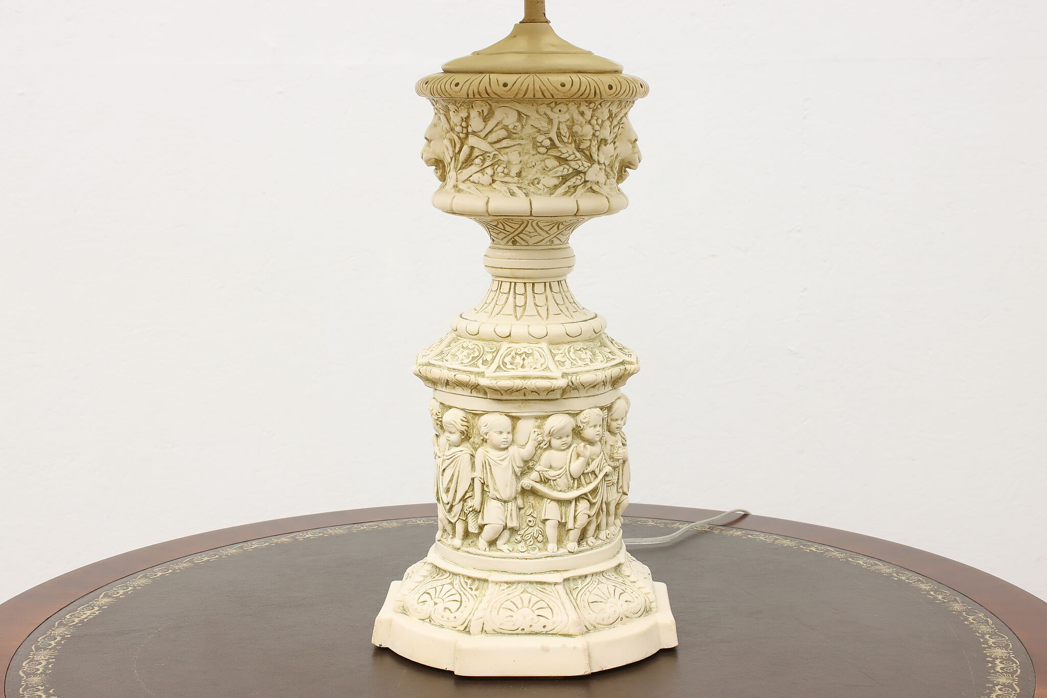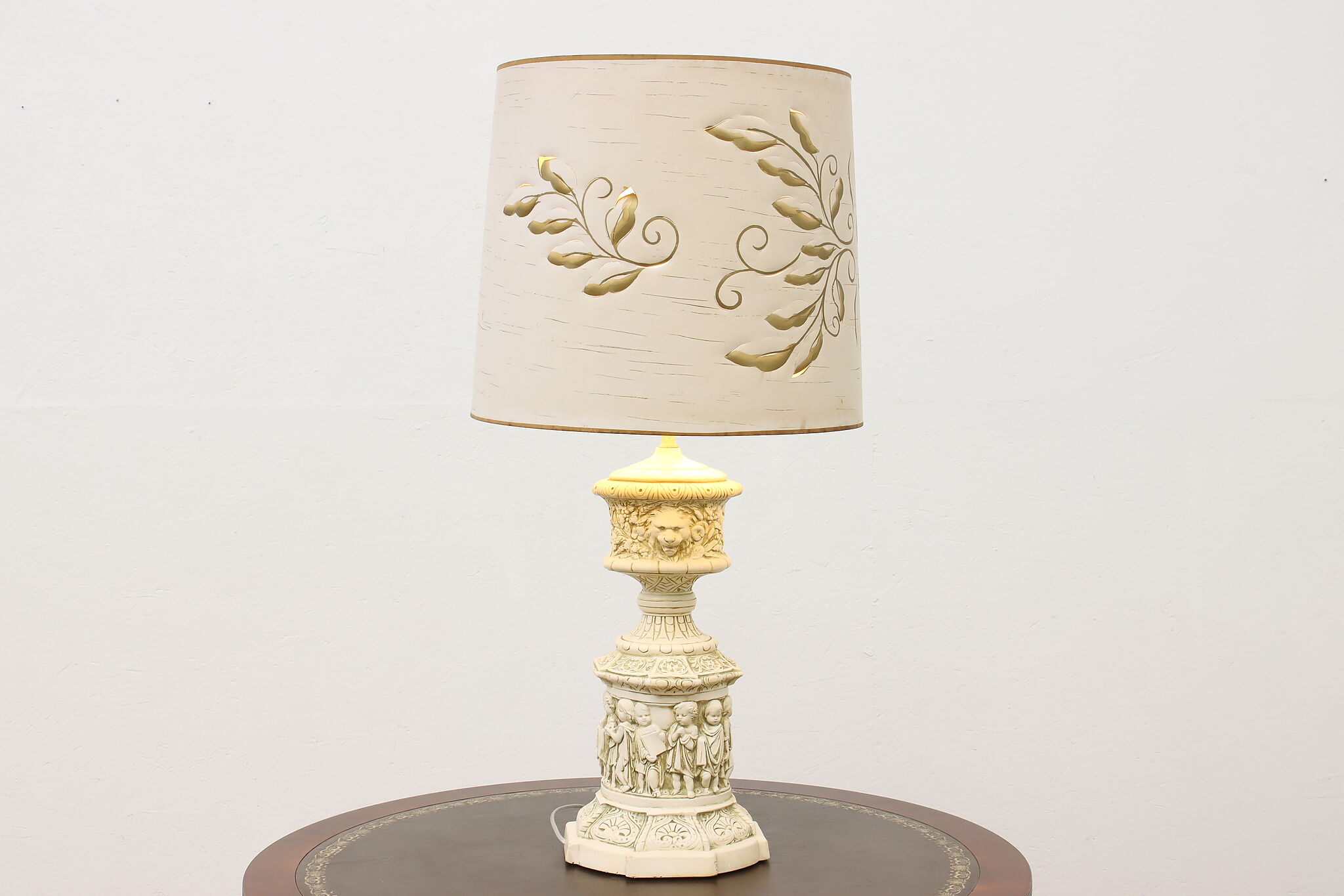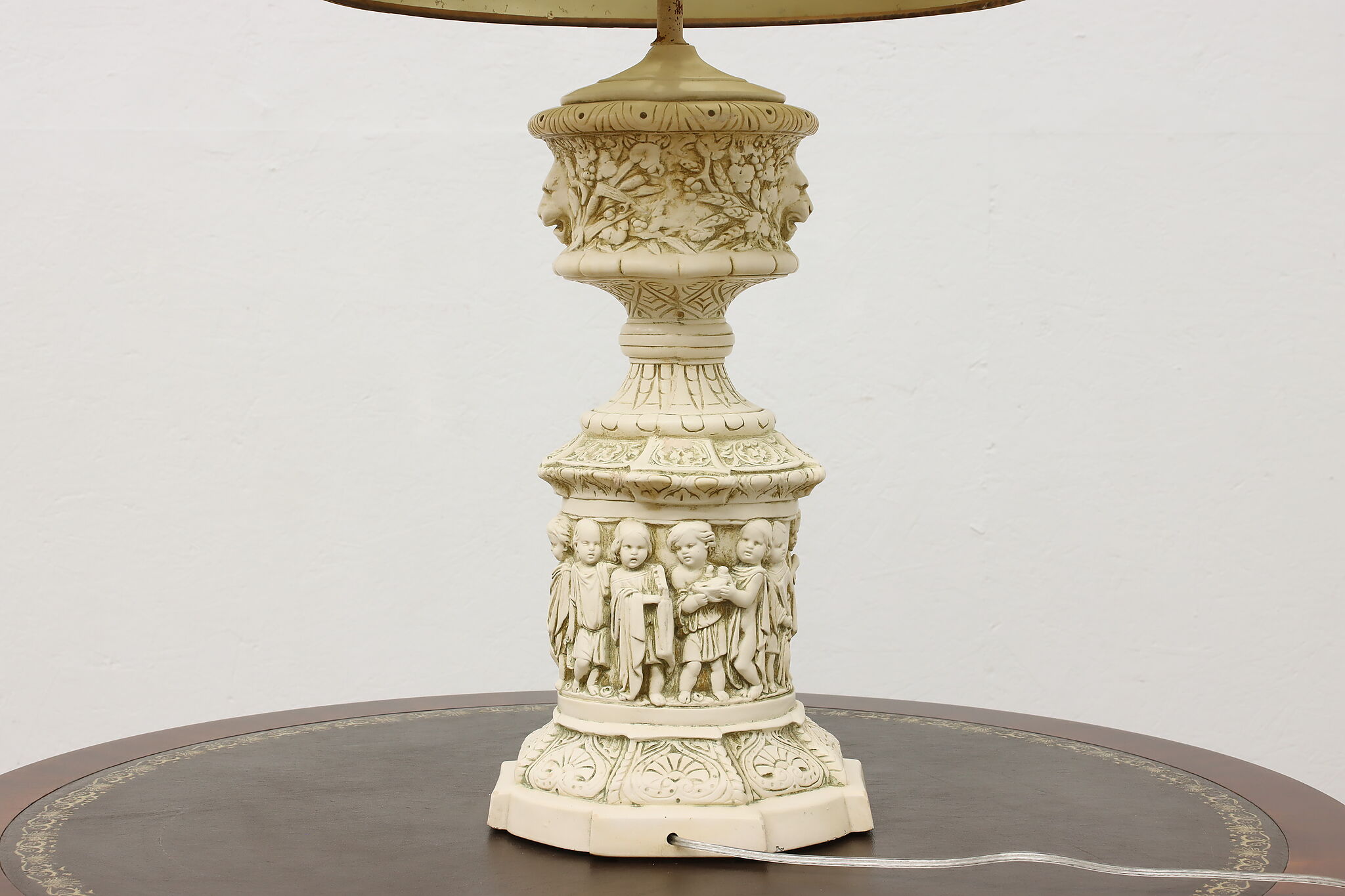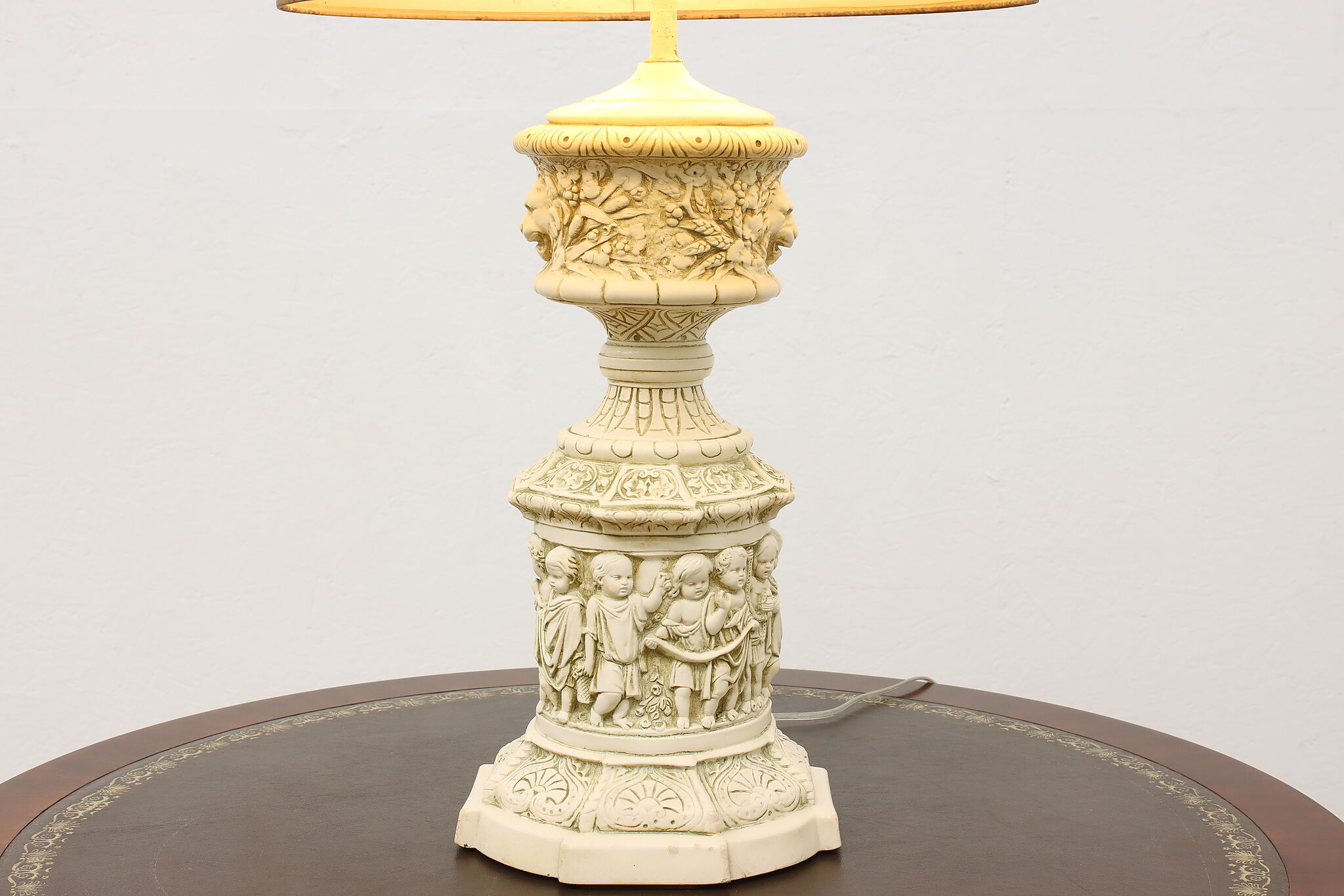 A Hollywood Regency table or desk lamp has beautiful cherub figures with lion head motifs.