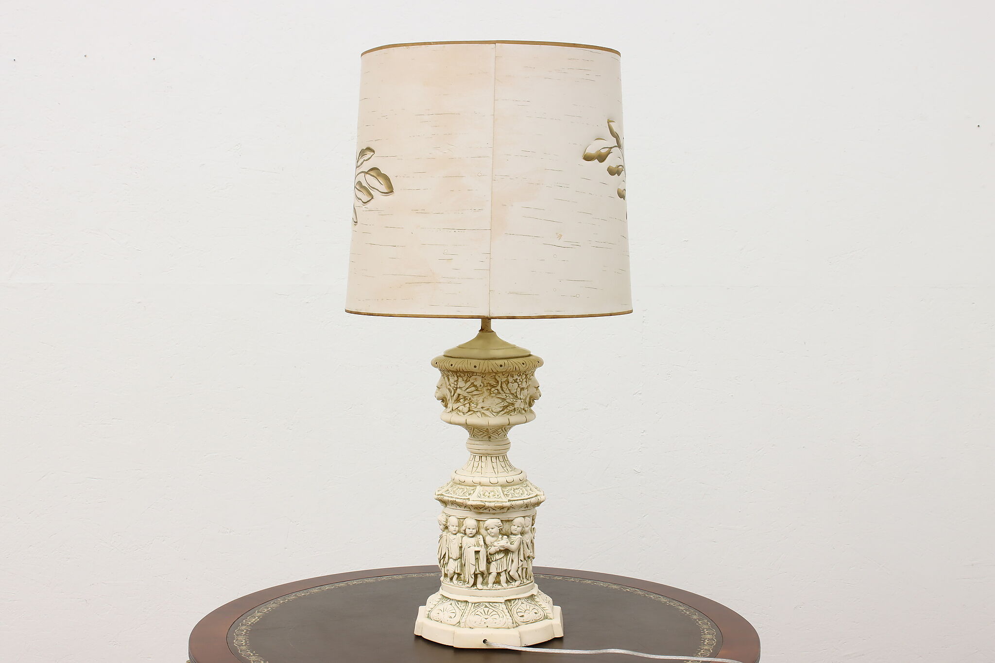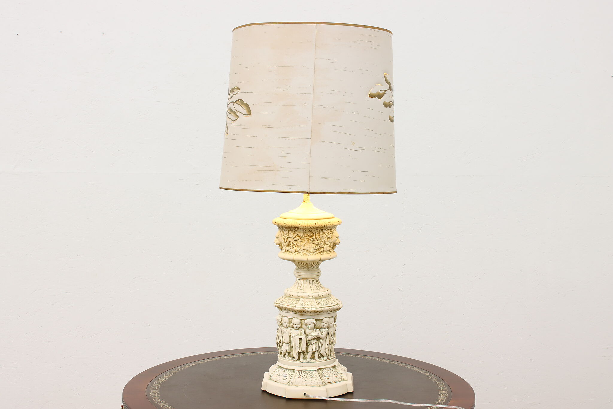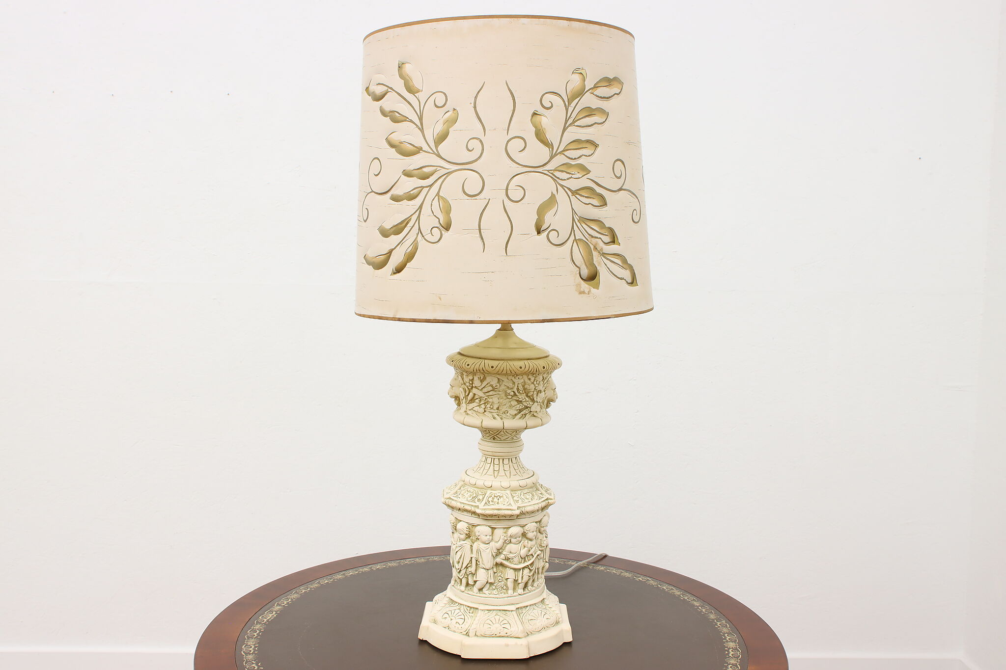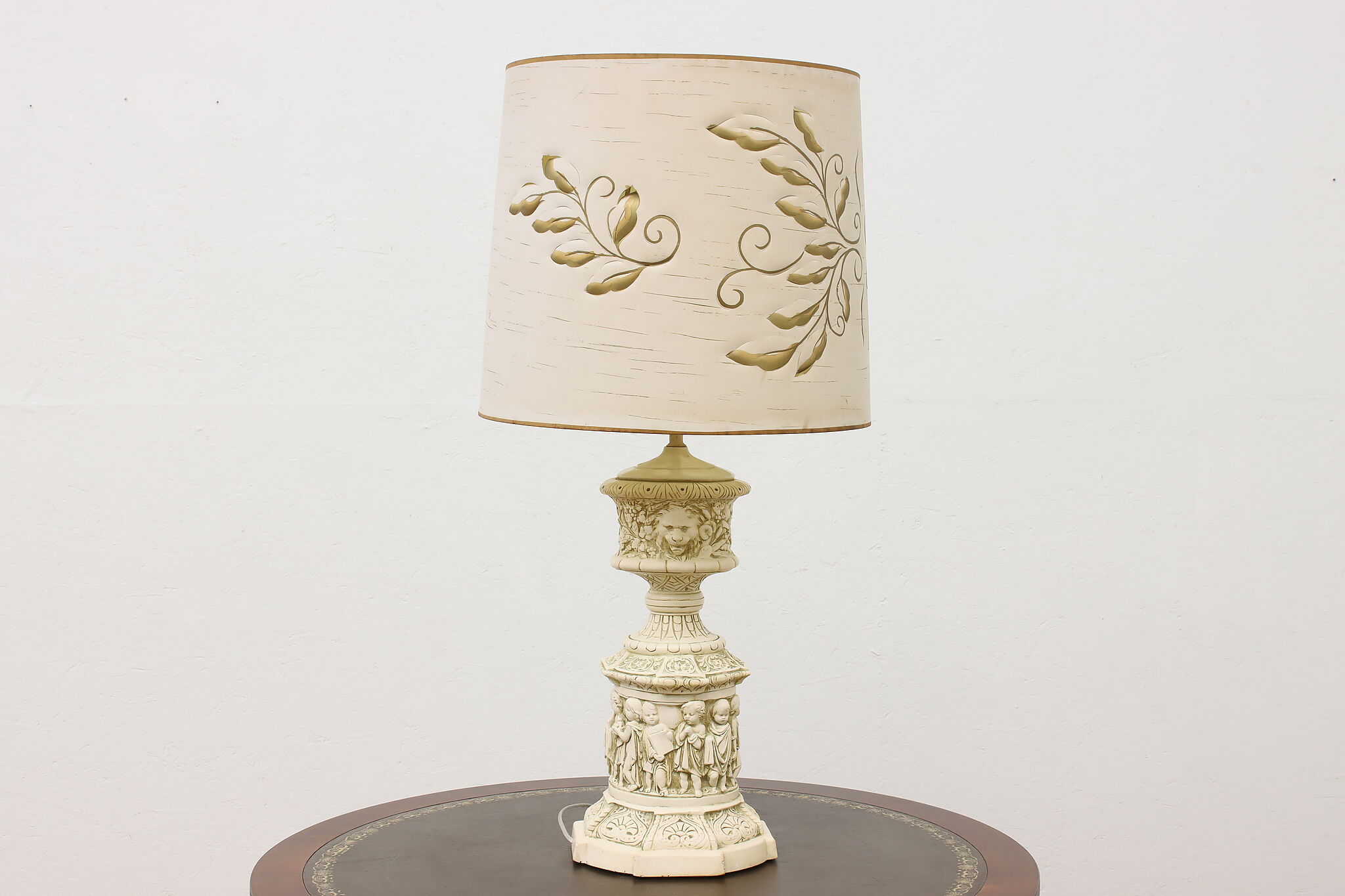 A Hollywood Regency table or desk lamp has beautiful cherub figures with lion head motifs.