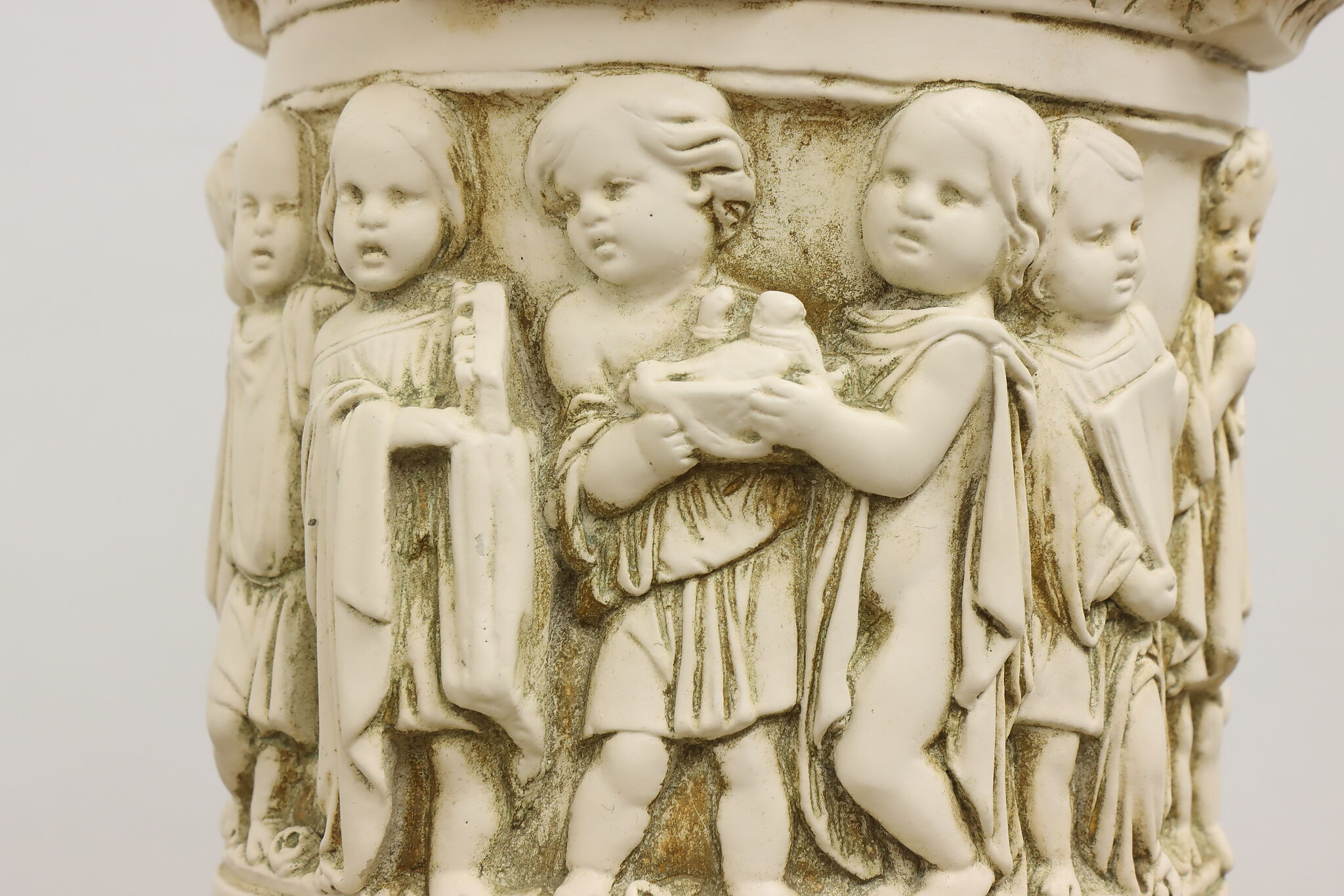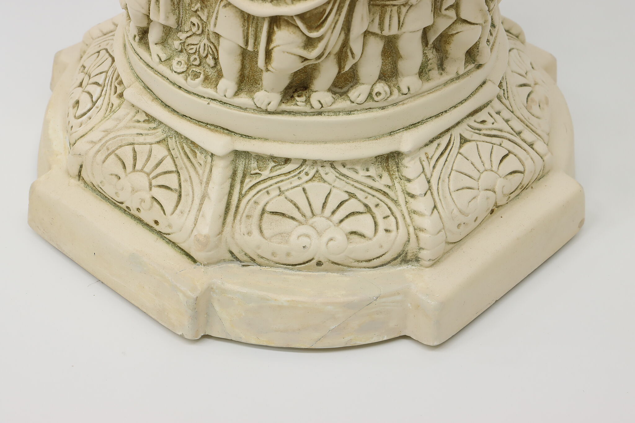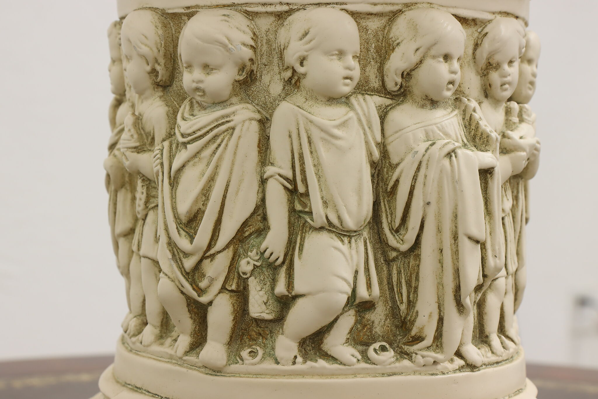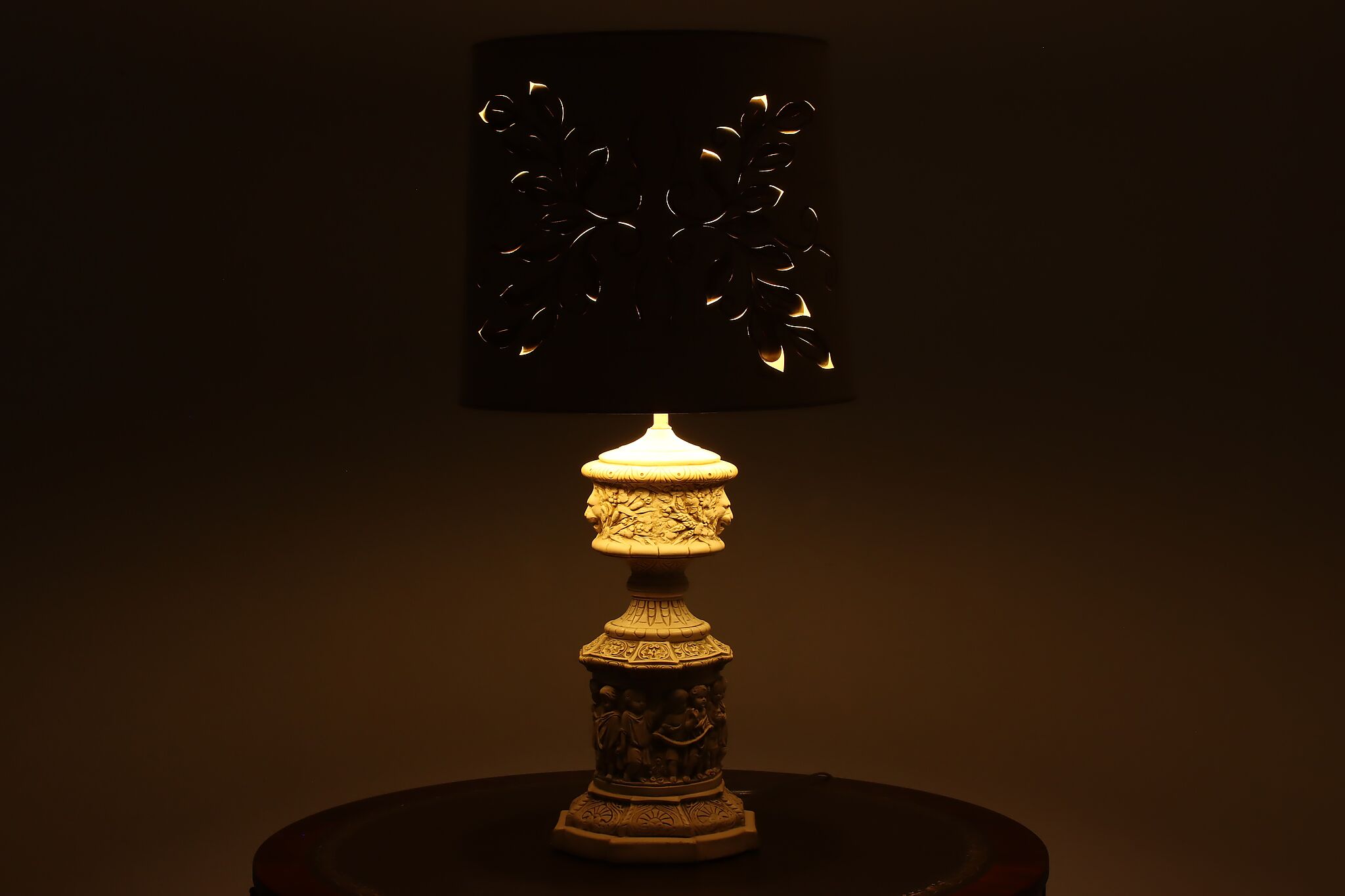 A Hollywood Regency table or desk lamp has beautiful cherub figures with lion head motifs.