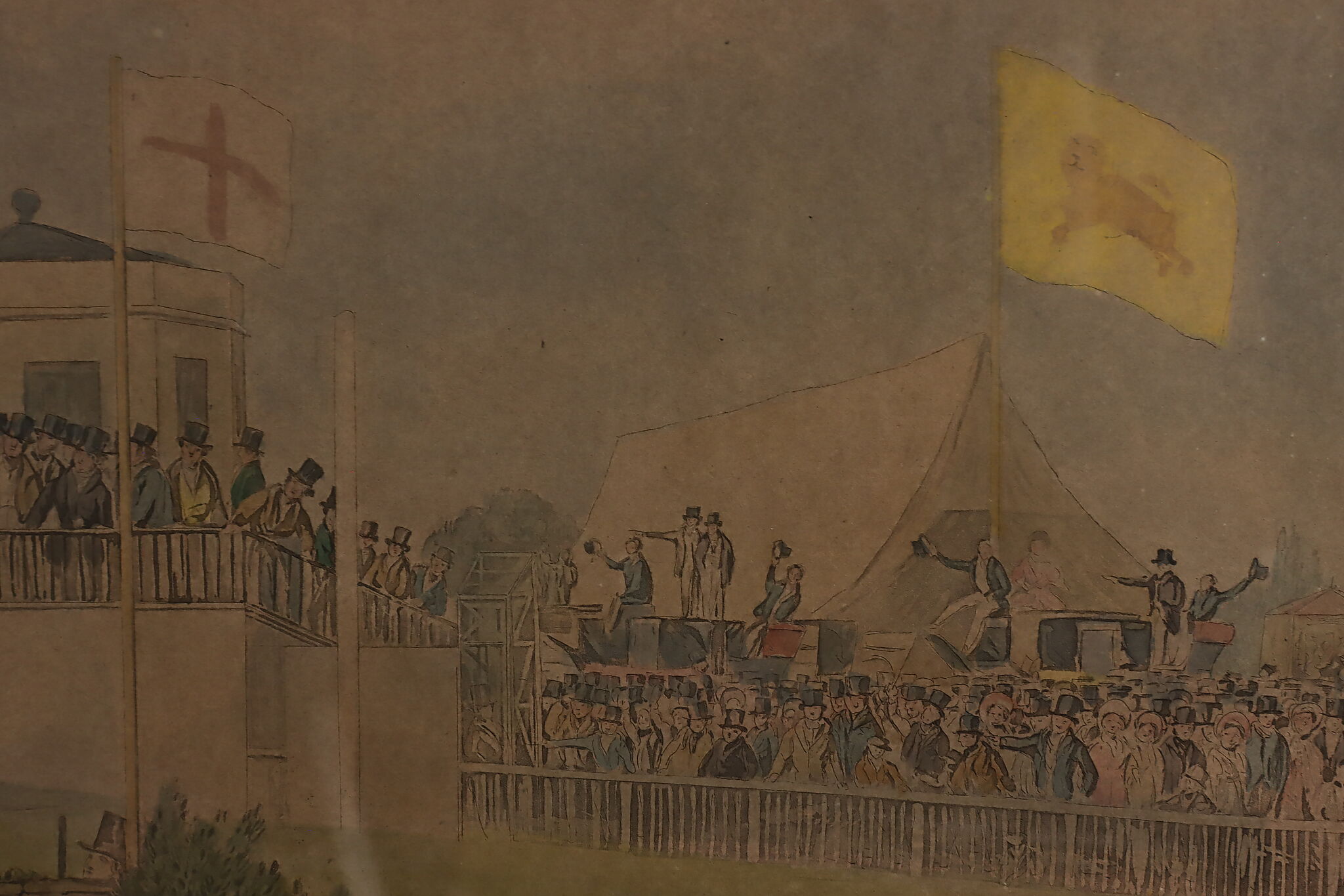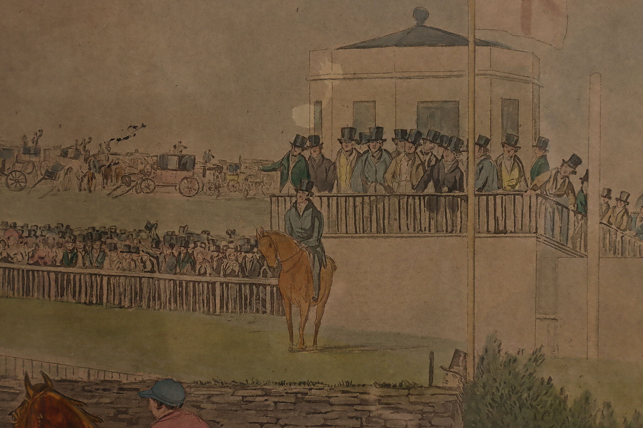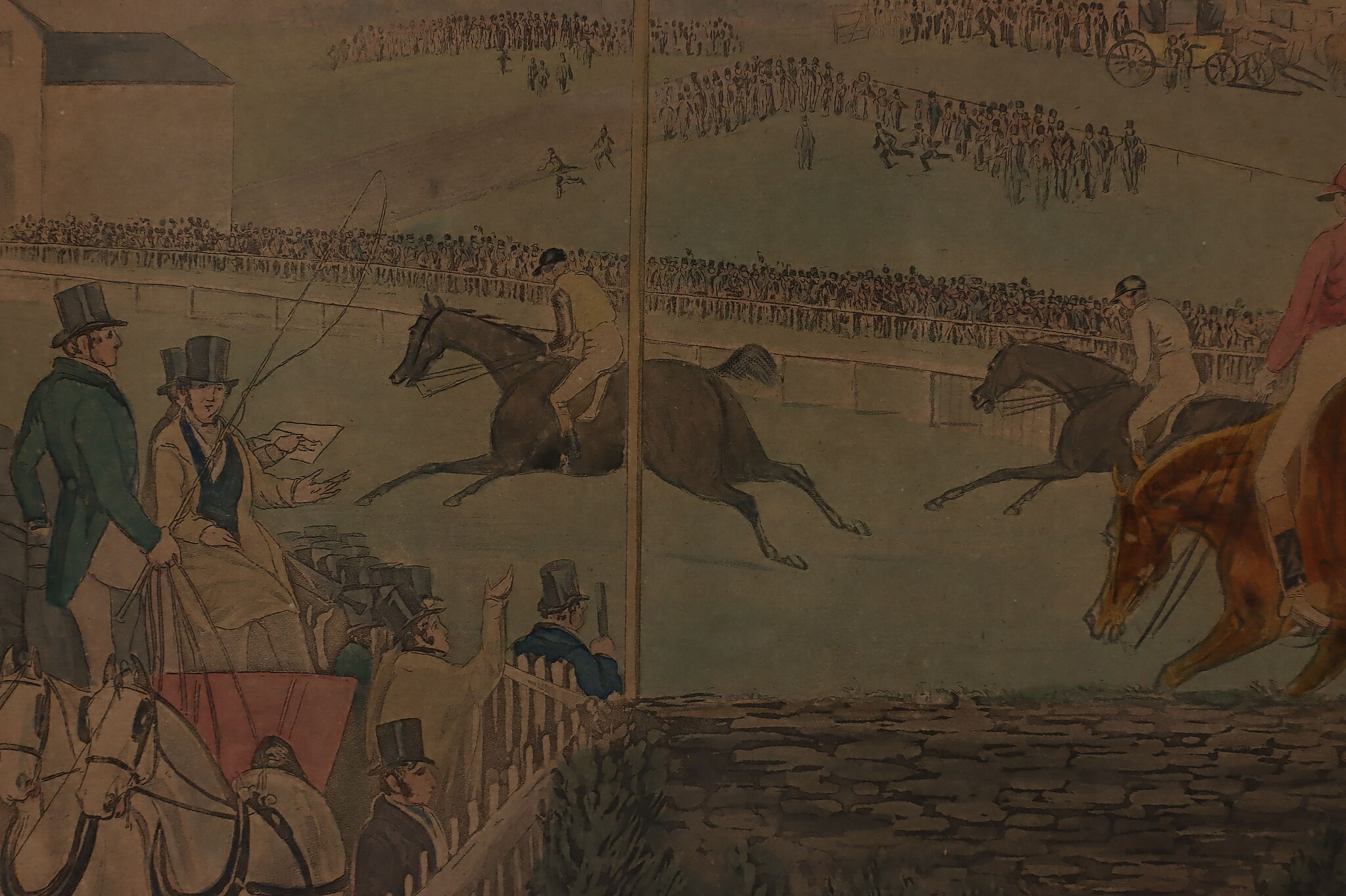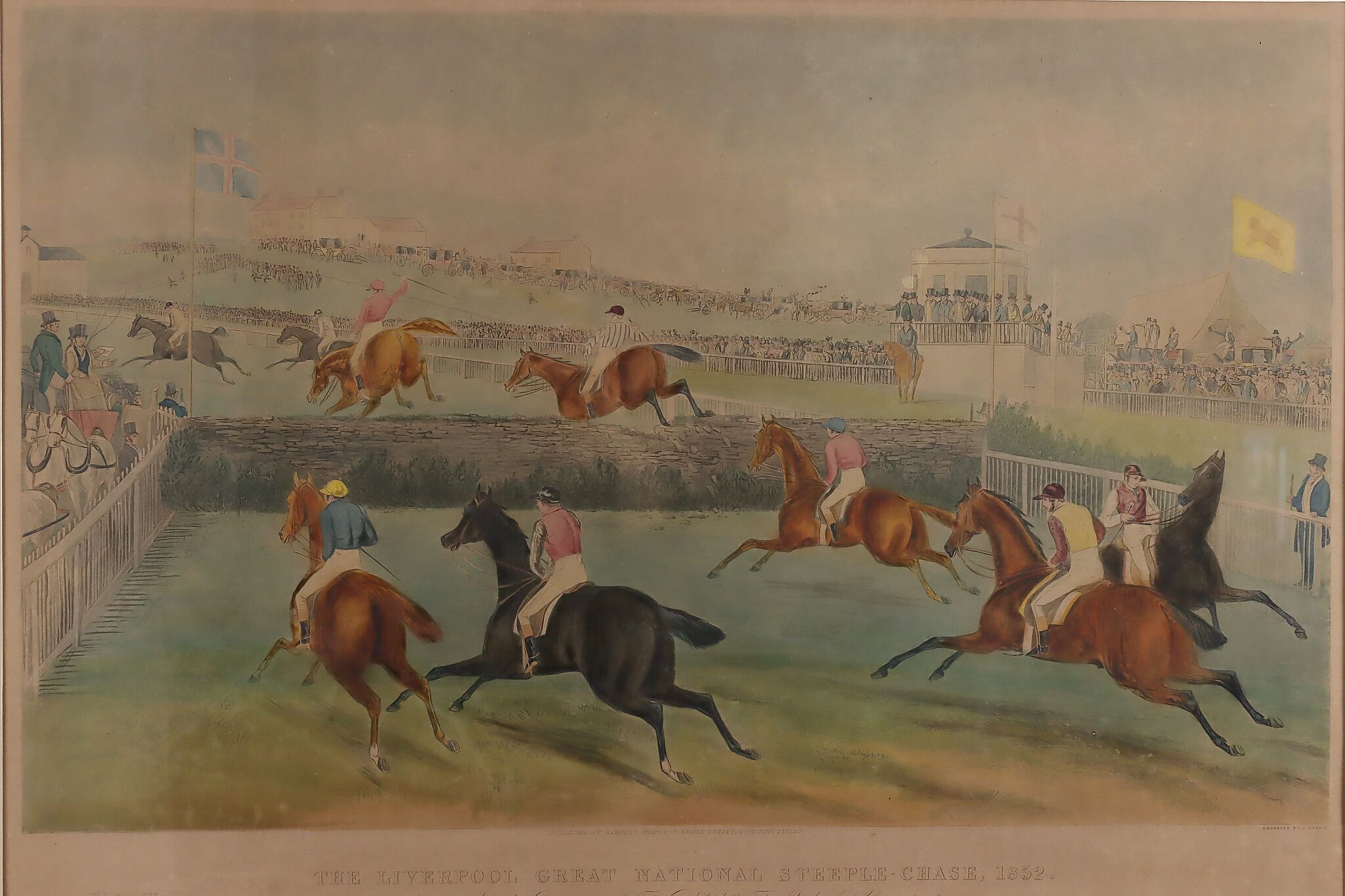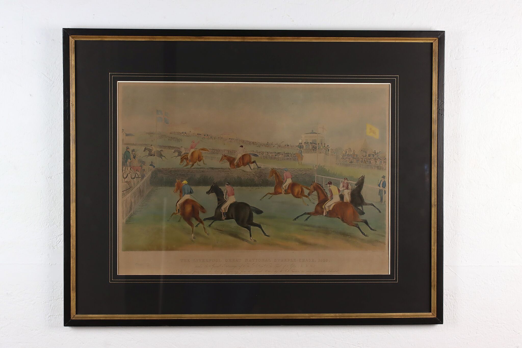 This engraving is plate three of Francis Calcraft Turner's original "The Liverpool Great National Steeple Chase" series of four paintings. Turner was known for his realistic animal and sport paintings.