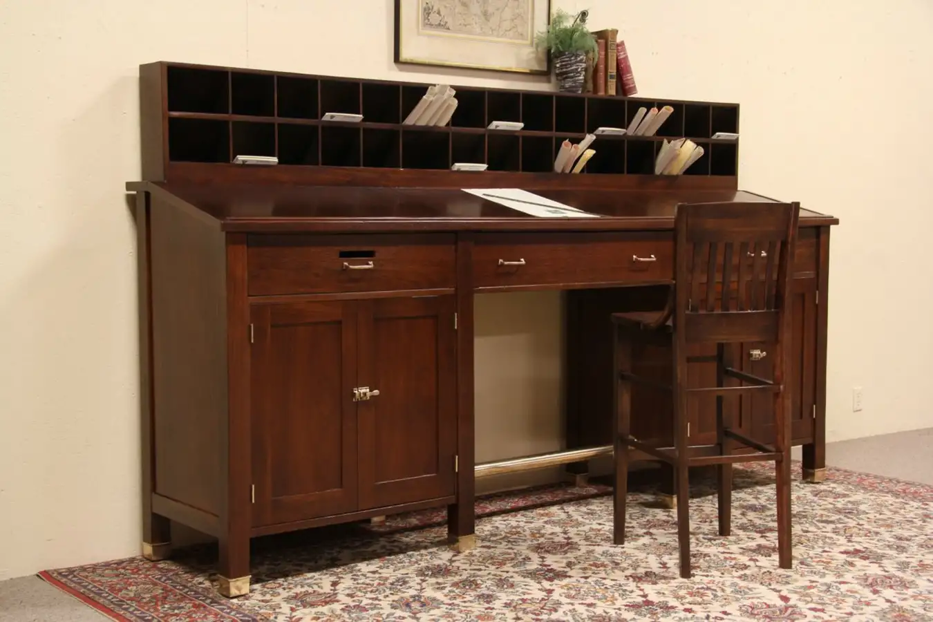This wonderful stool height or stand up desk was said to have been custom made for a 30 room hotel in St. Paul MN about 1900, there are 30 angled mailboxes along the top.