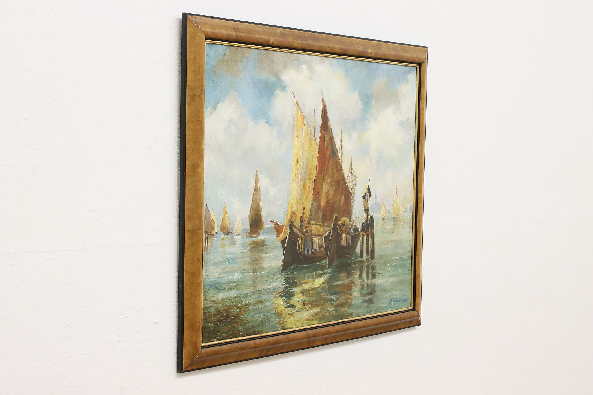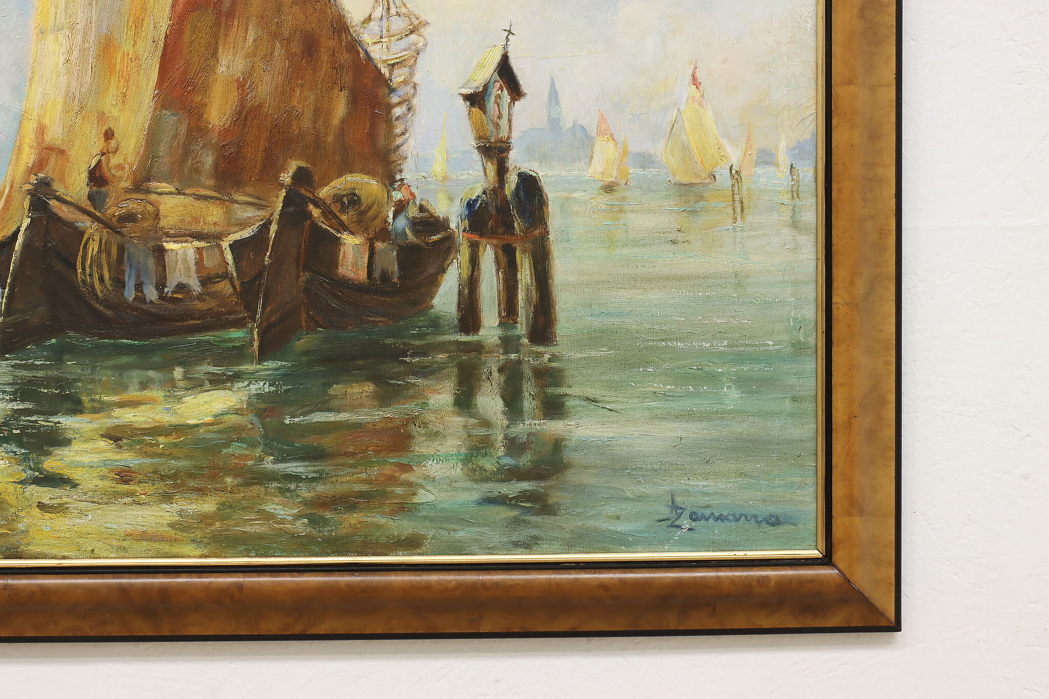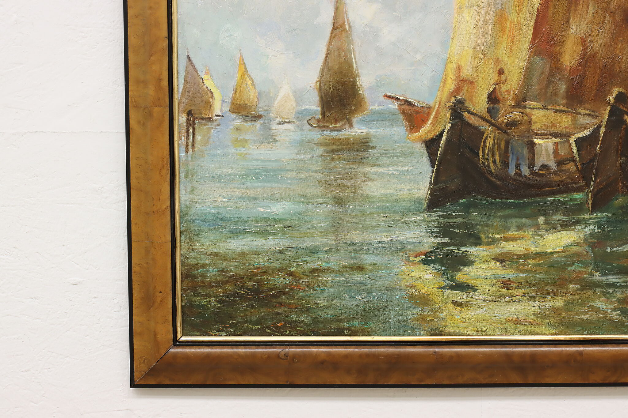 The gold and red hues of this painting perfectly compliment the blue water of the harbor, where houseboats are coming to port.