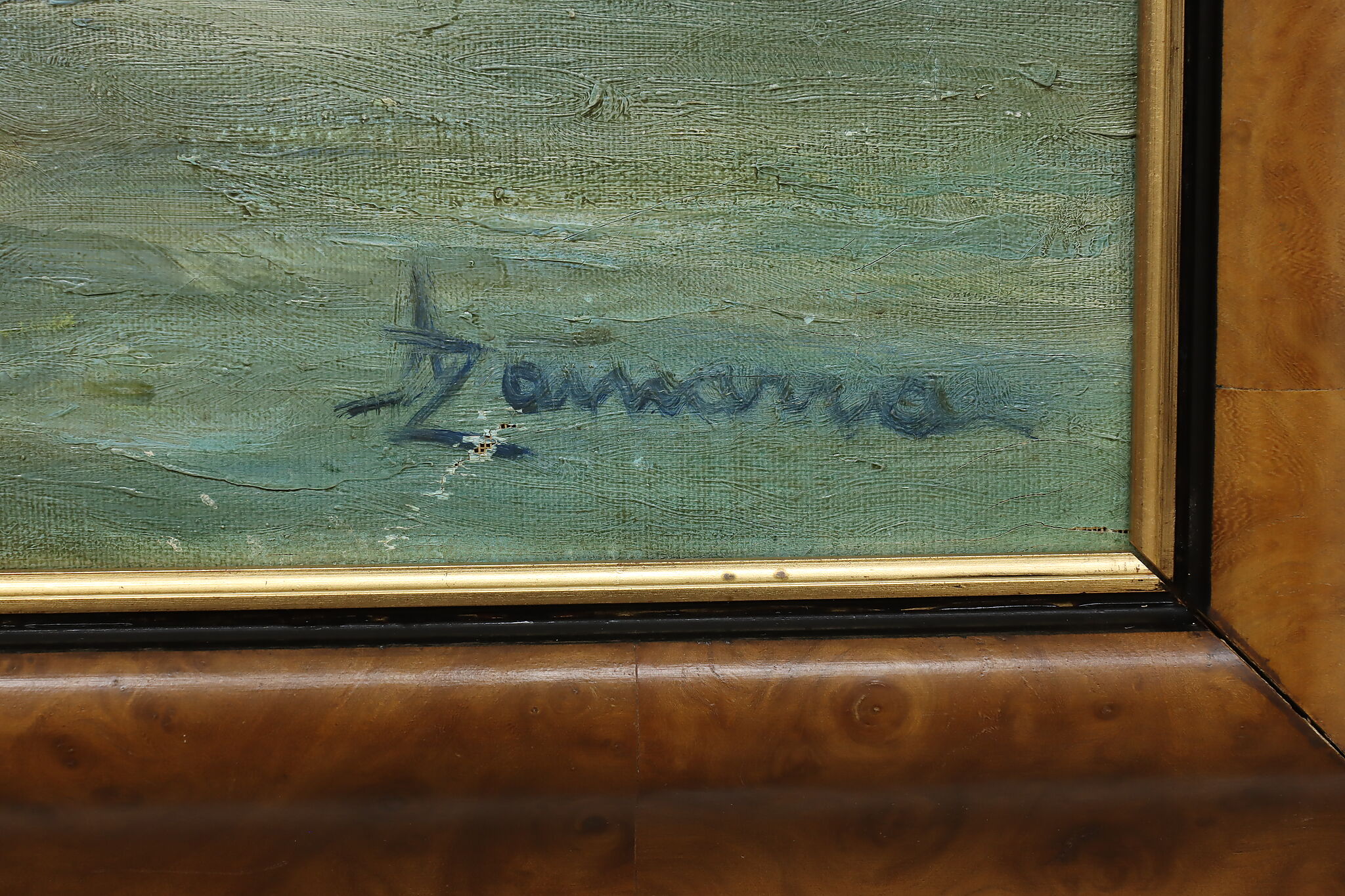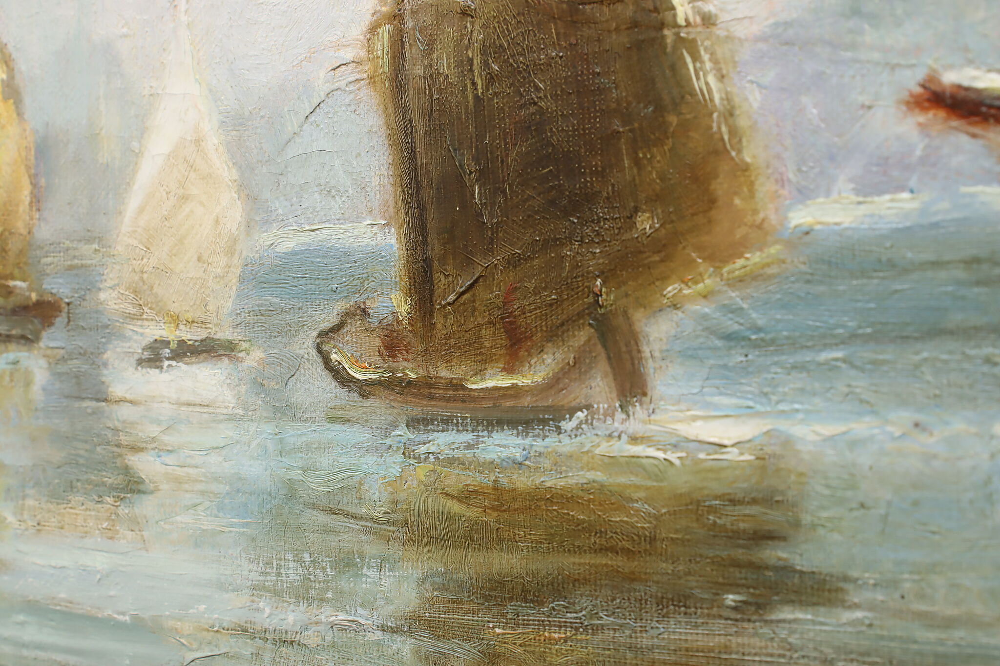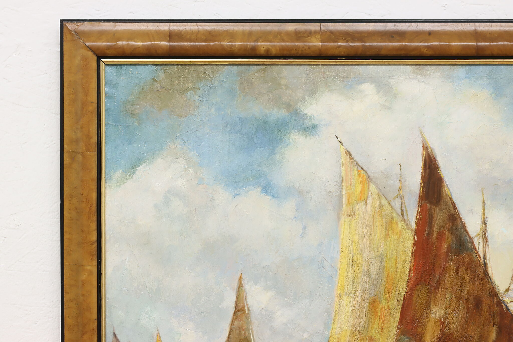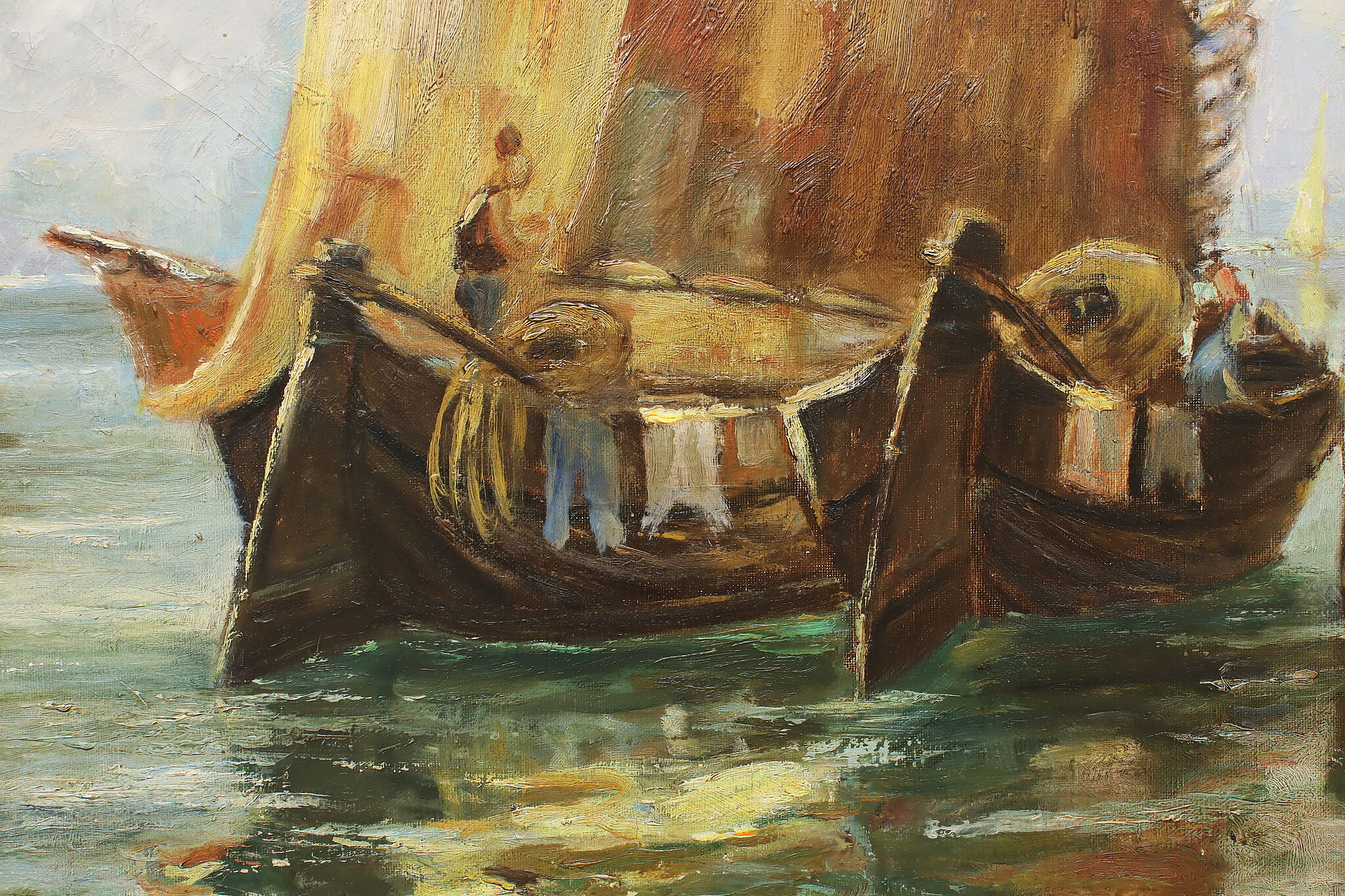 The gold and red hues of this painting perfectly compliment the blue water of the harbor, where houseboats are coming to port.