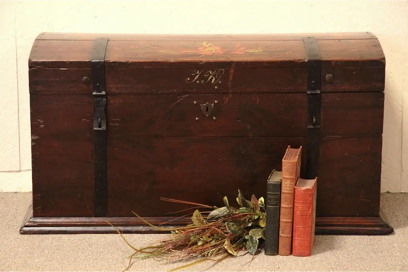 A lovely immigrant trunk or chest has a curved or dome top and original folk "rosemal" painting on the top. The stenciled address is worn and hard to read, see photo.