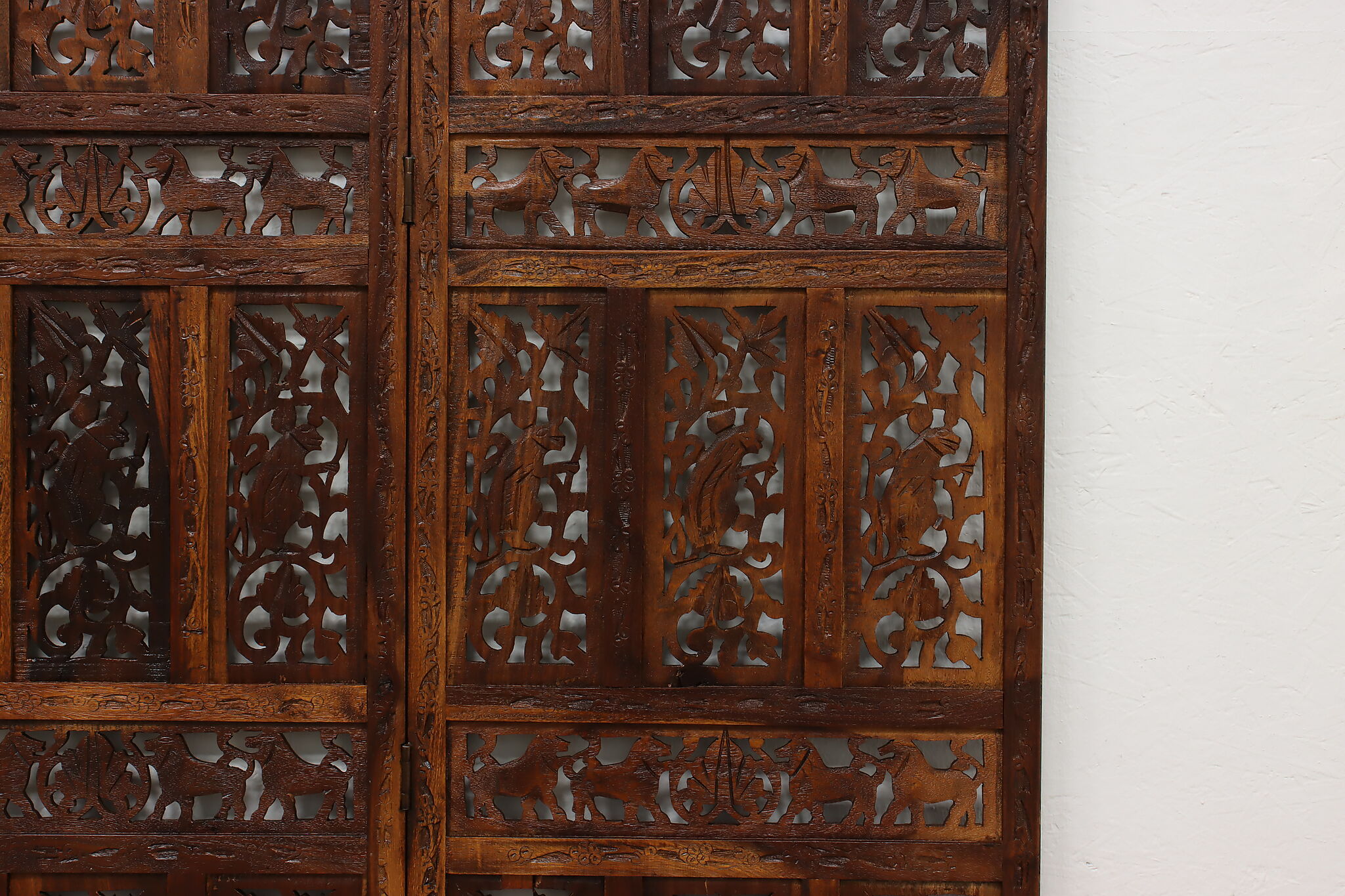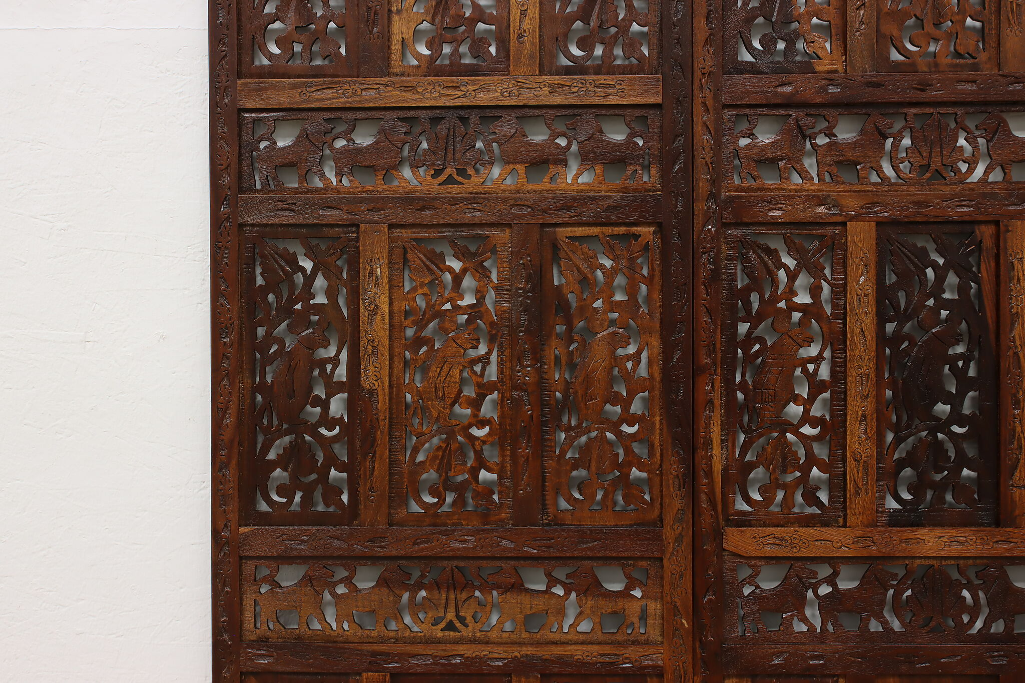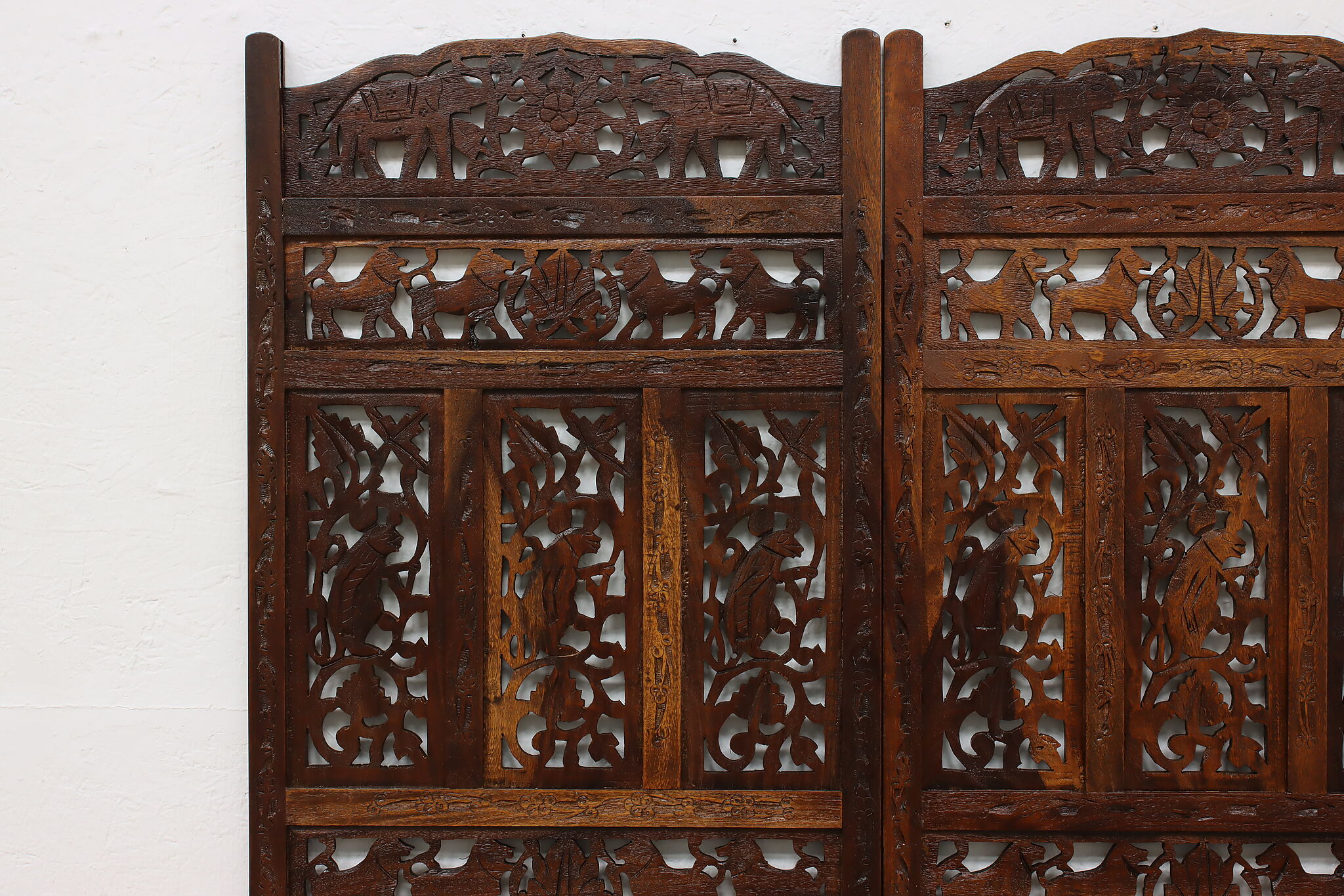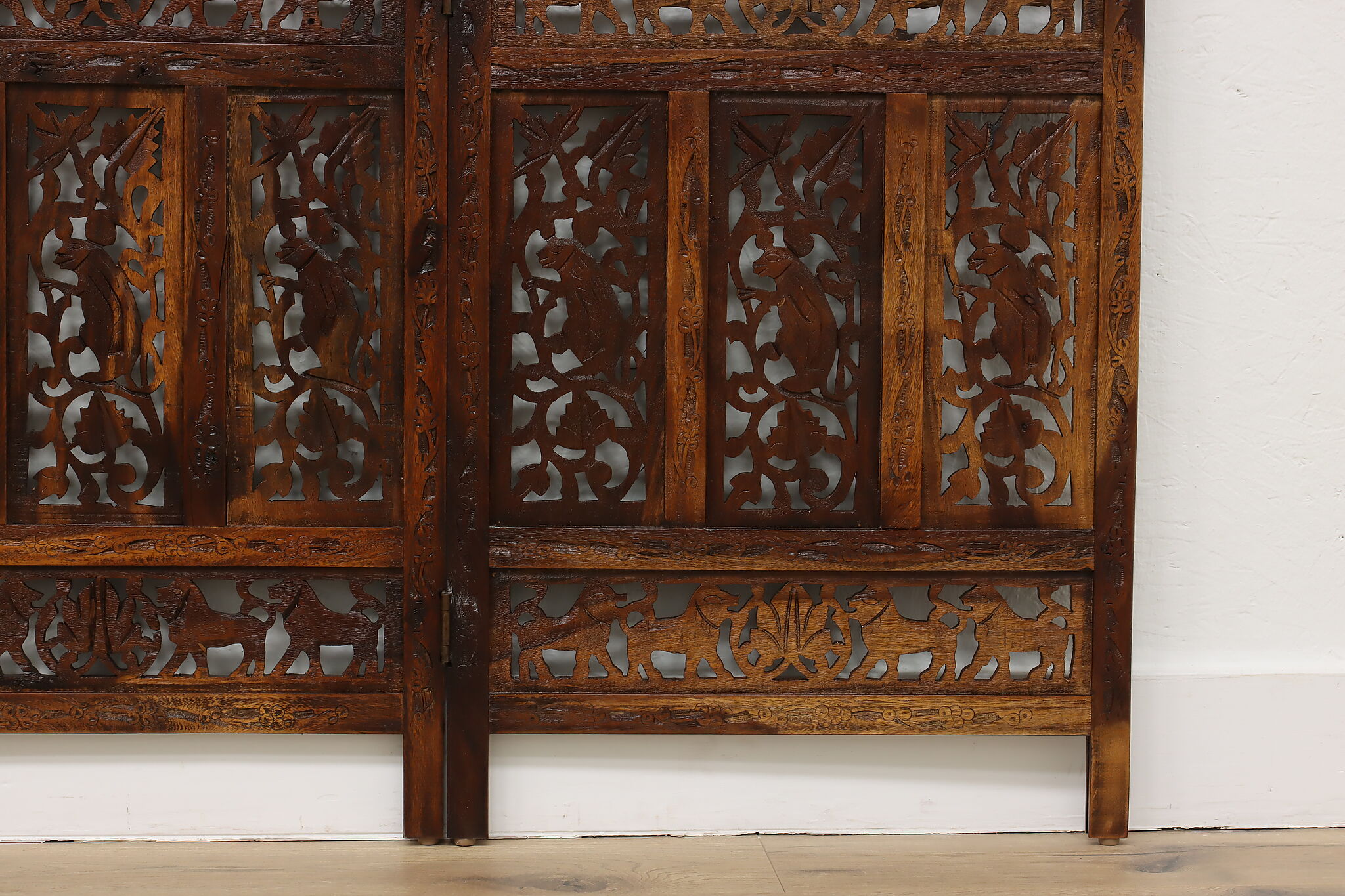 Divide a living space or create a private area in your home with this folding screen from India! The hand carved and pierced elephants, lions, and monkeys make it a perfect gift for a nature enthusiast.