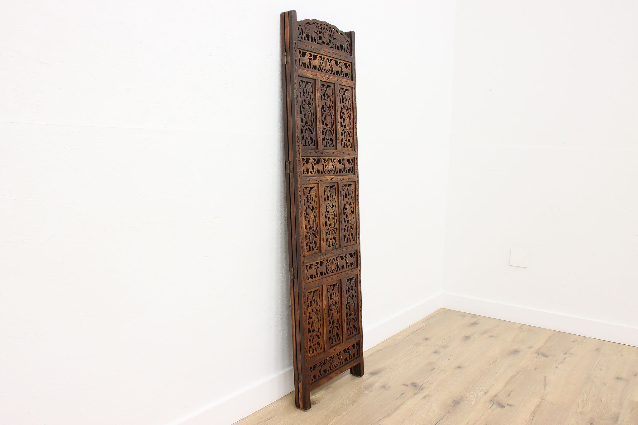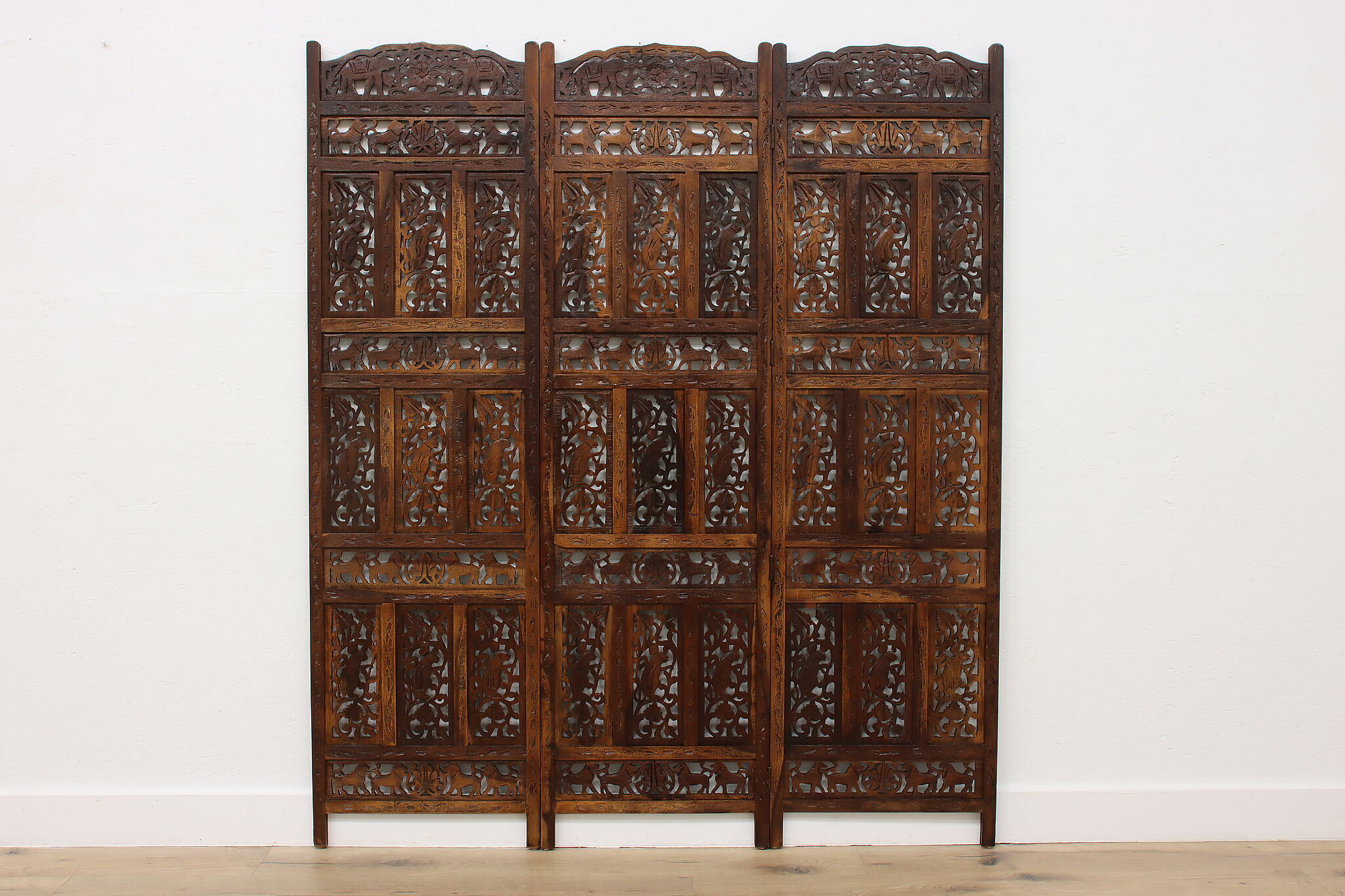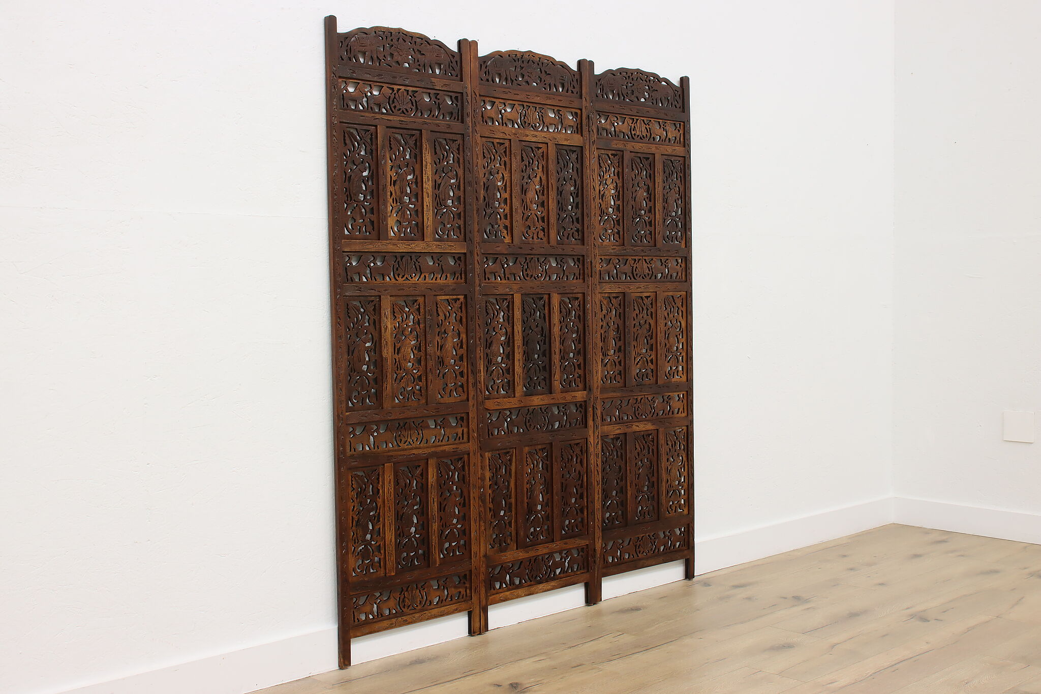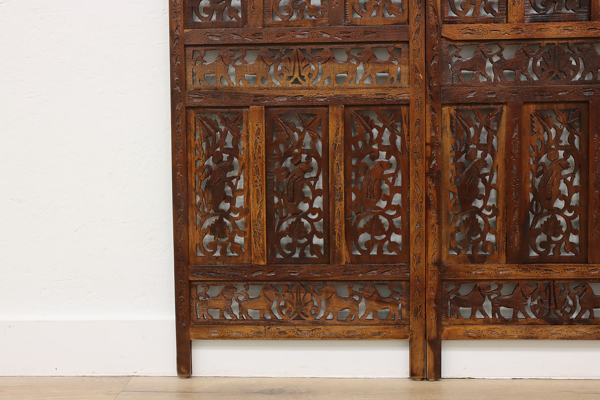 Divide a living space or create a private area in your home with this folding screen from India! The hand carved and pierced elephants, lions, and monkeys make it a perfect gift for a nature enthusiast.