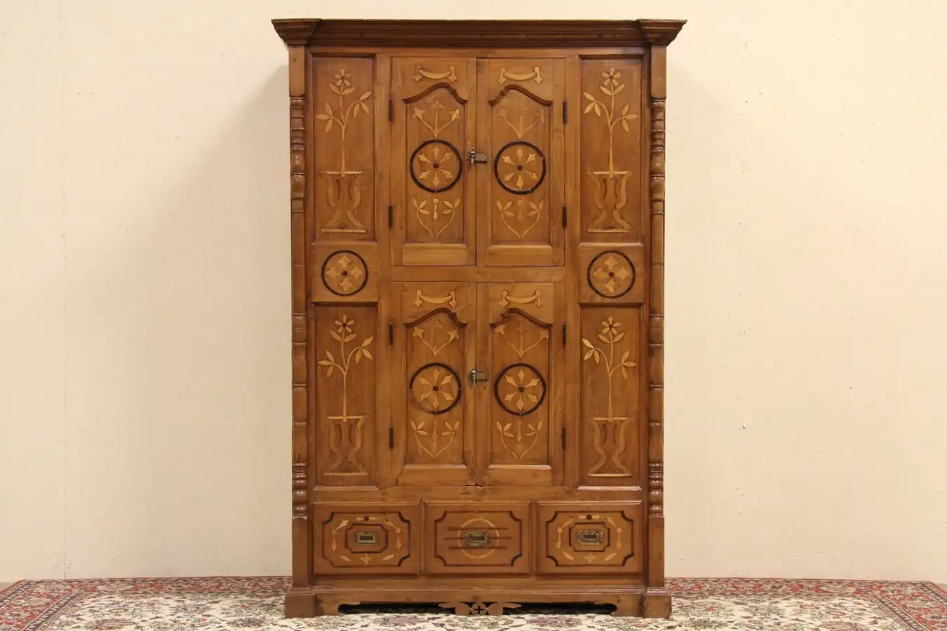 An intriguing dowry cabinet was hand made in India, the design is a colonial hybrid of English country furniture and Indian workmanship.