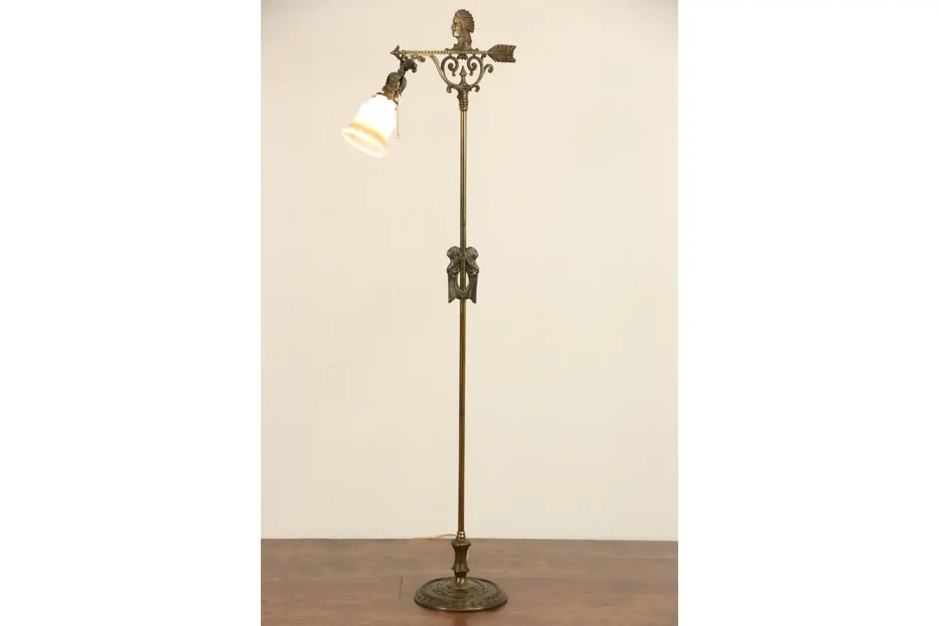 A "bridge" or floor reading lamp with an arm to use behind a chair dates from about 1915, and has American Indian motifs. Cast brass, iron and white metal, this American made antique light is richly detailed.