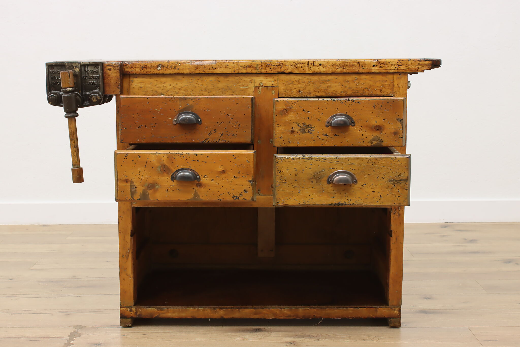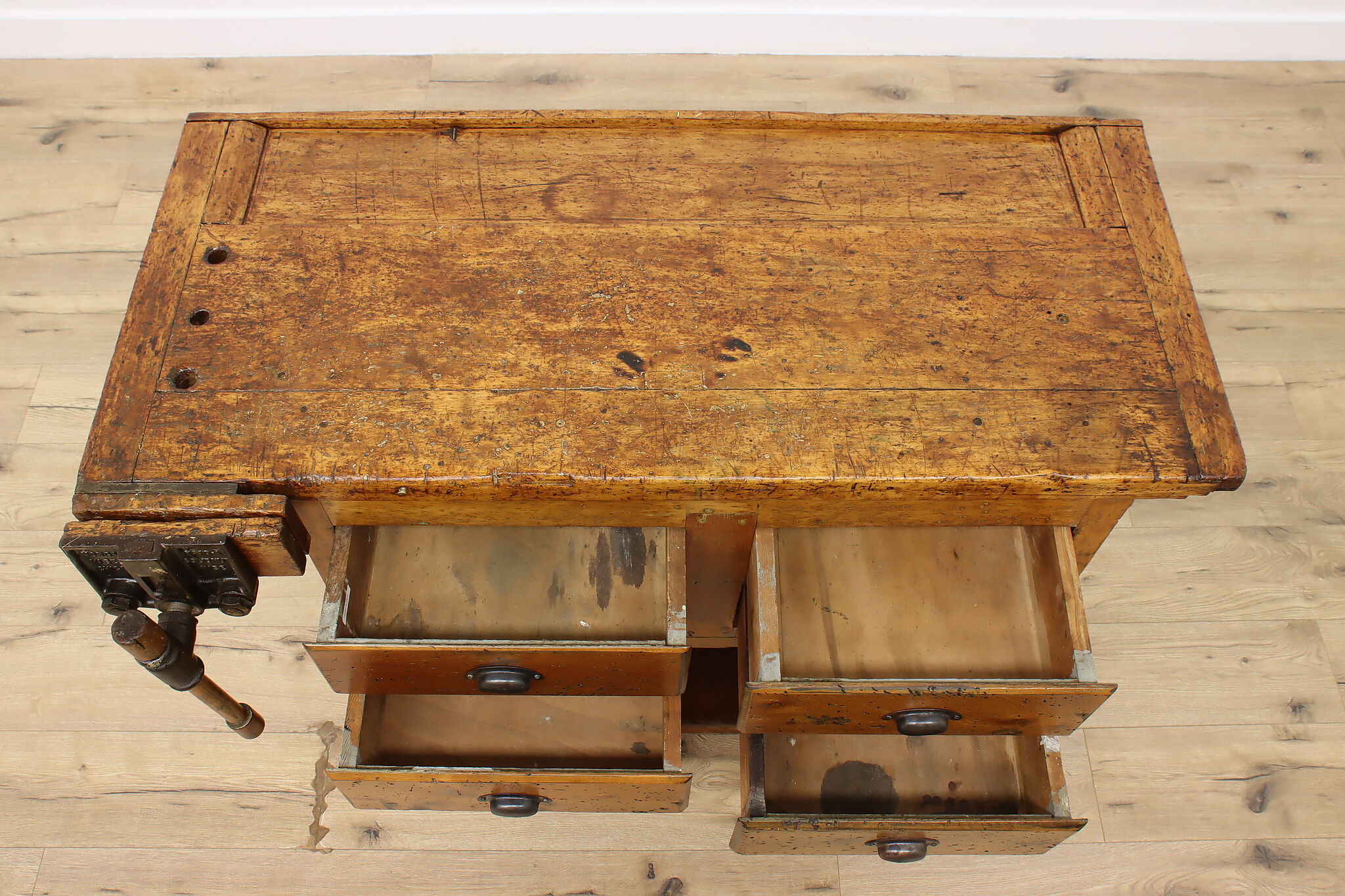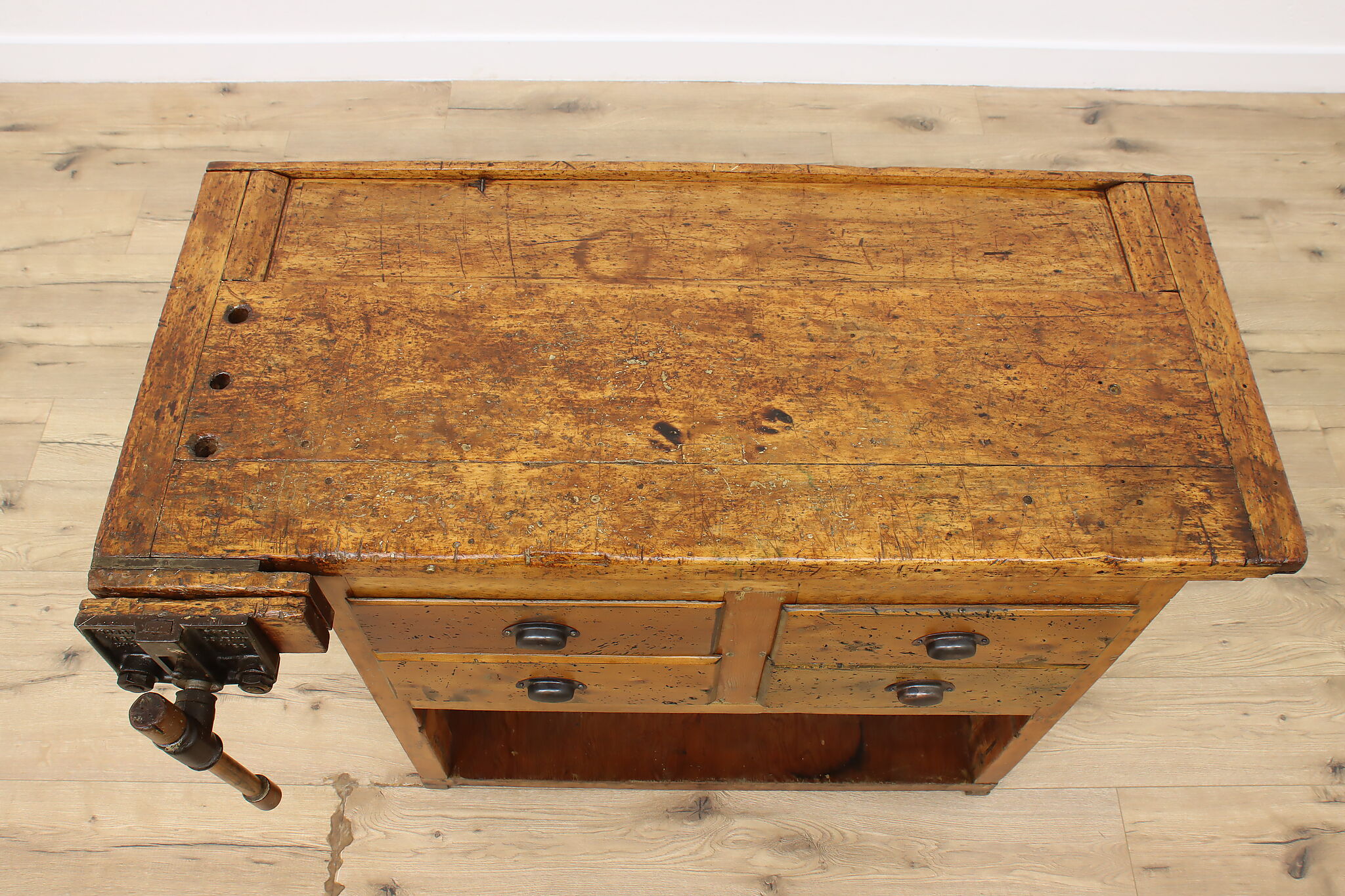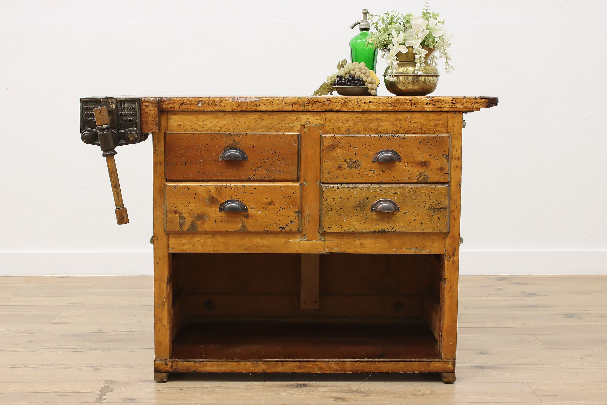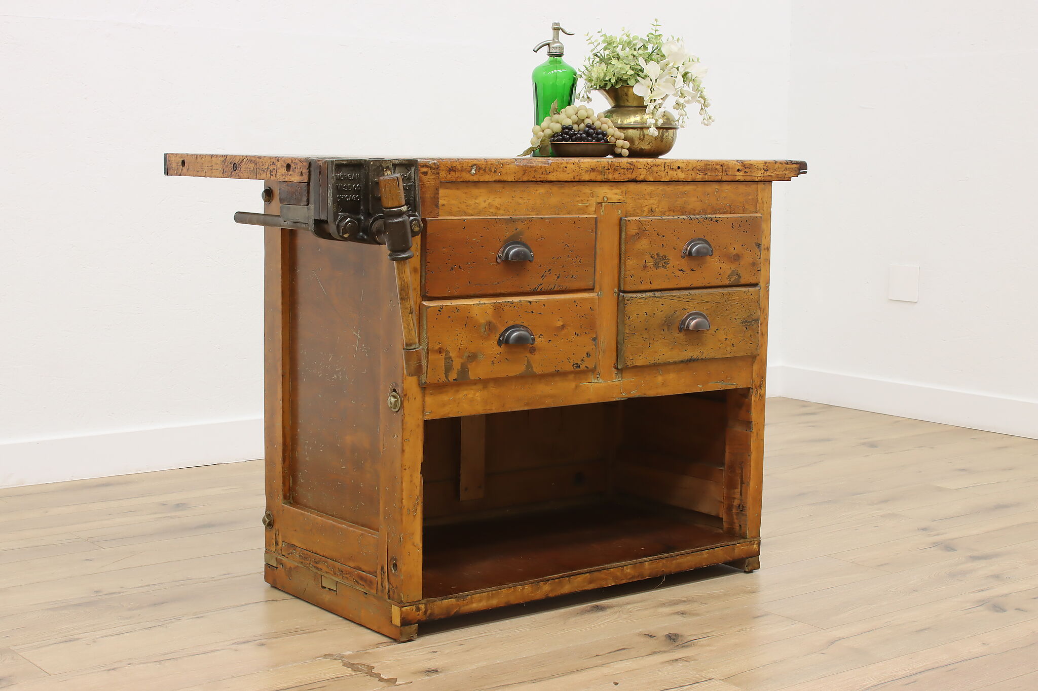 A wonderfully rustic workbench from a carpenter's shop is a surprisingly excellent option as a kitchen island, wine and cheese or crafting table!