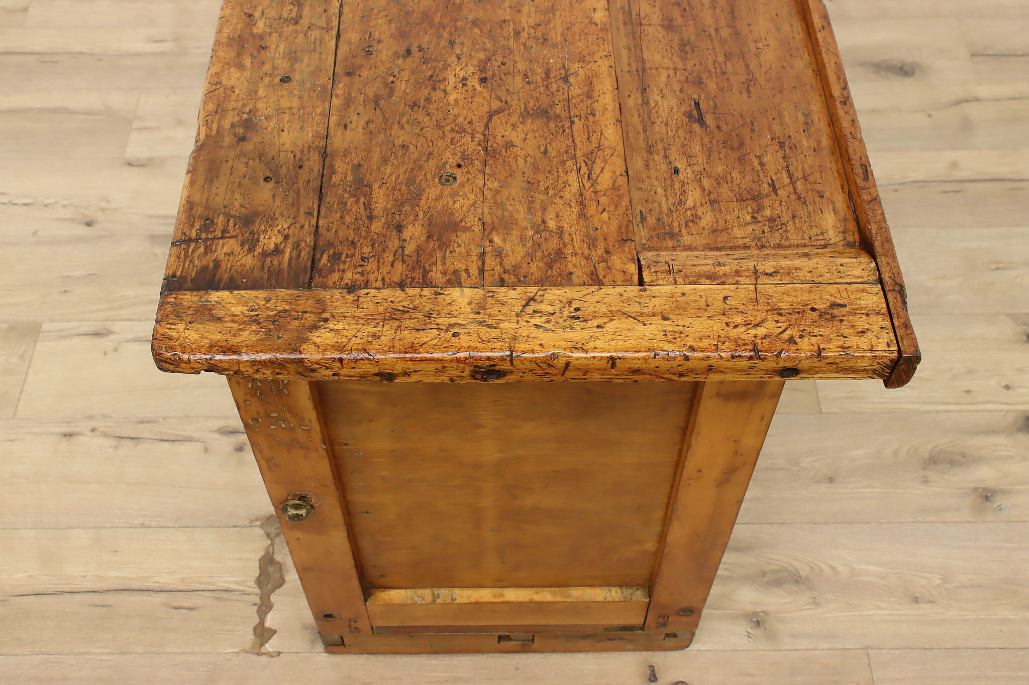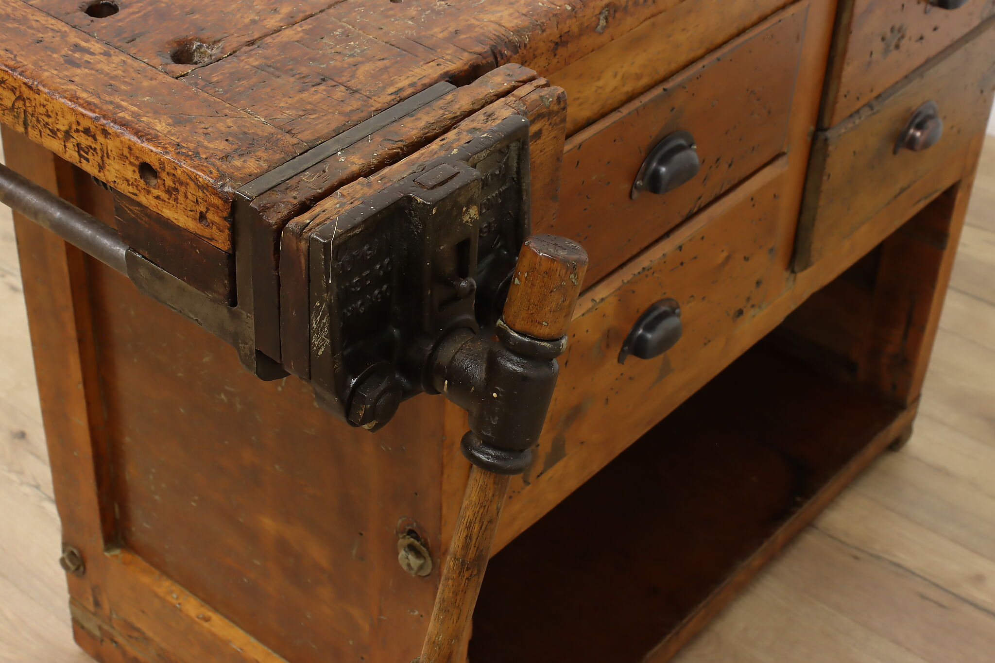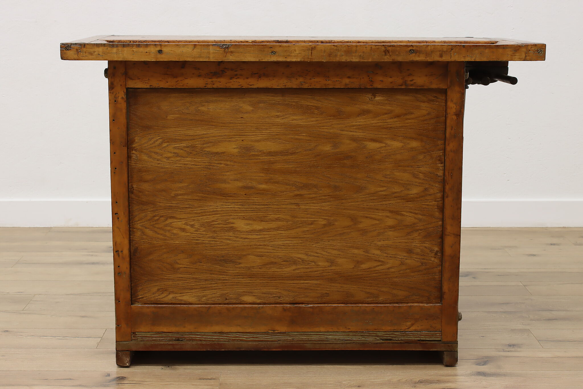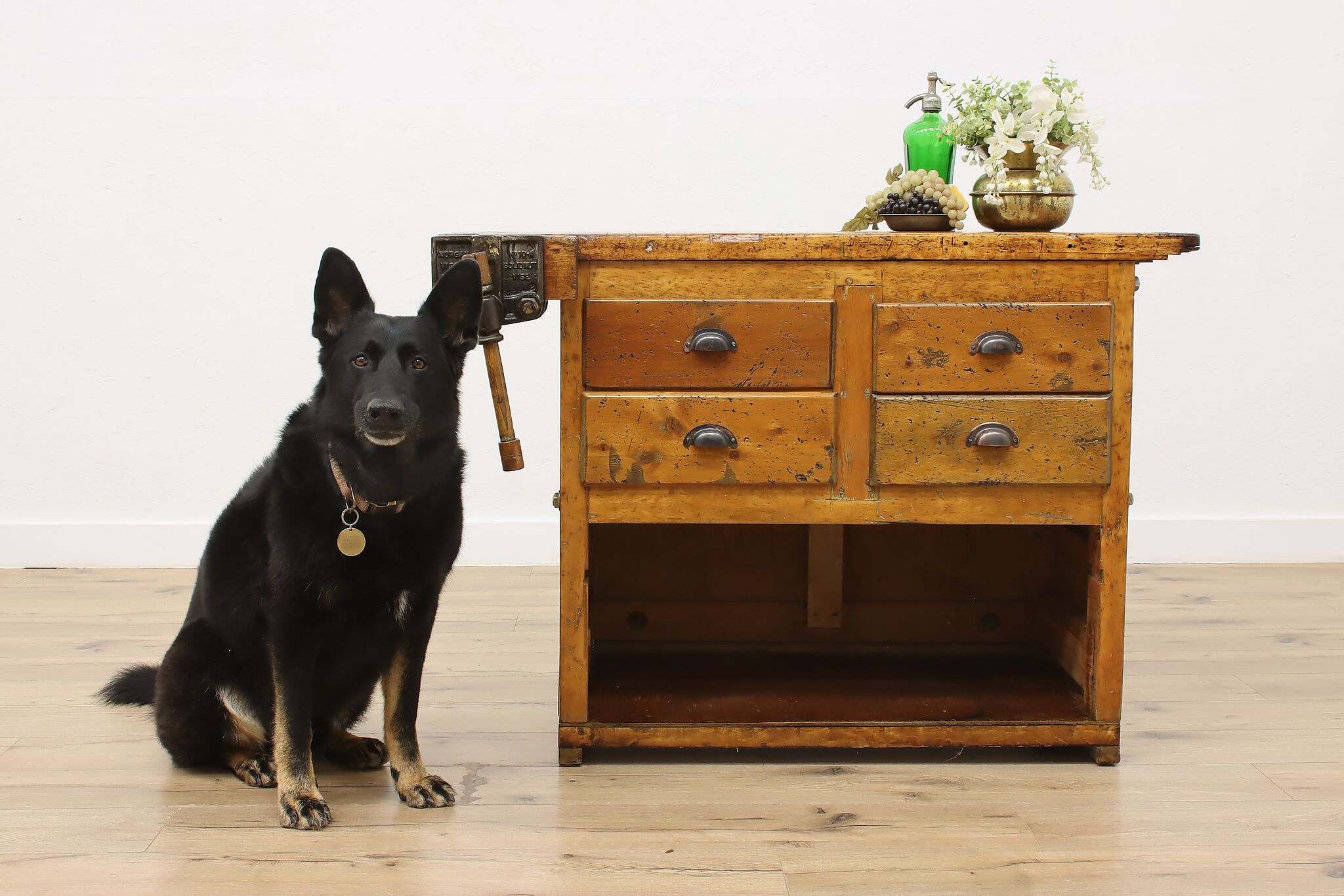 A wonderfully rustic workbench from a carpenter's shop is a surprisingly excellent option as a kitchen island, wine and cheese or crafting table!