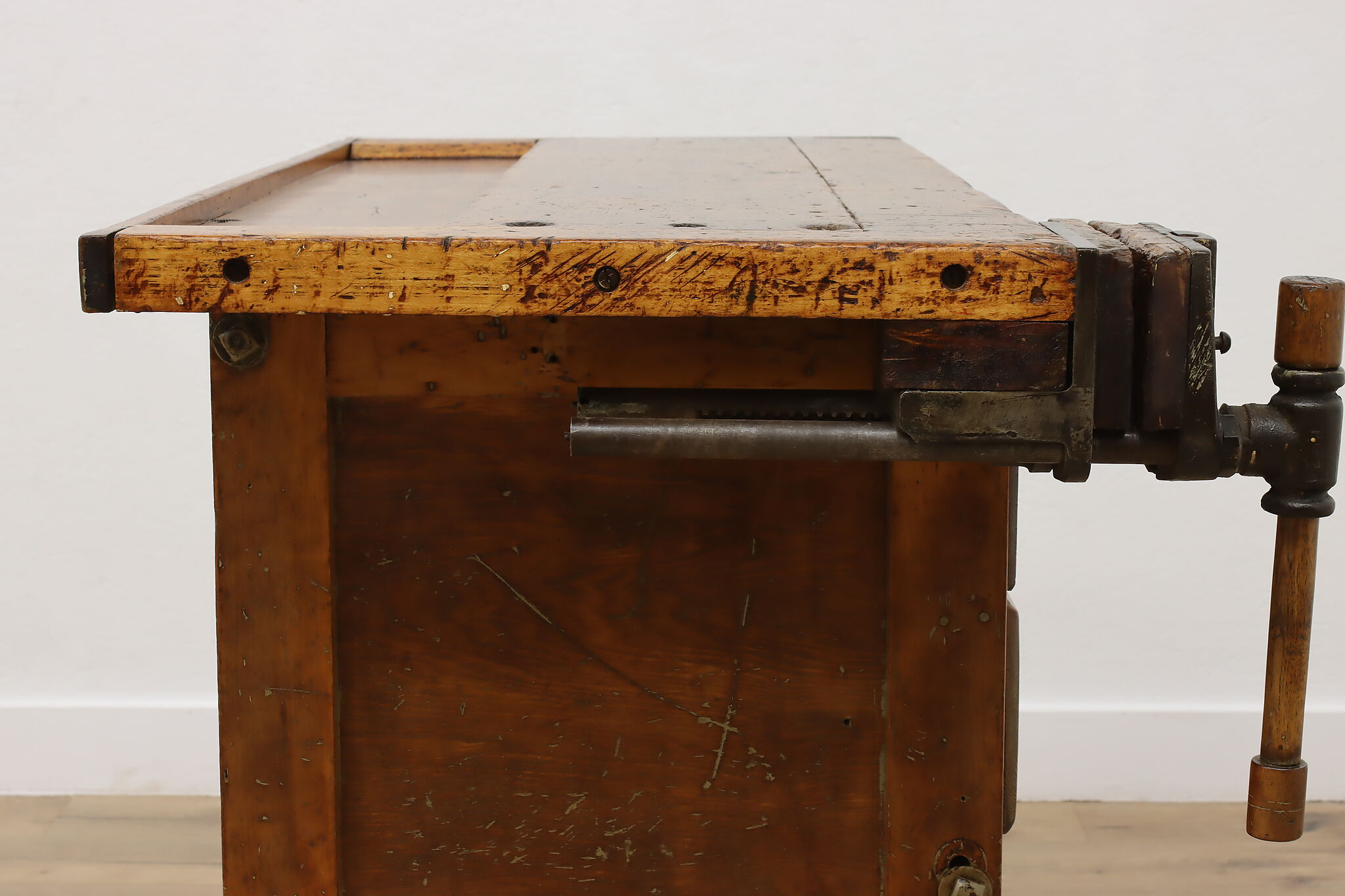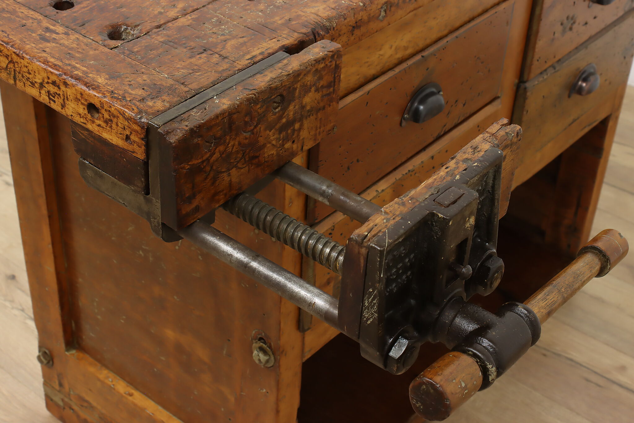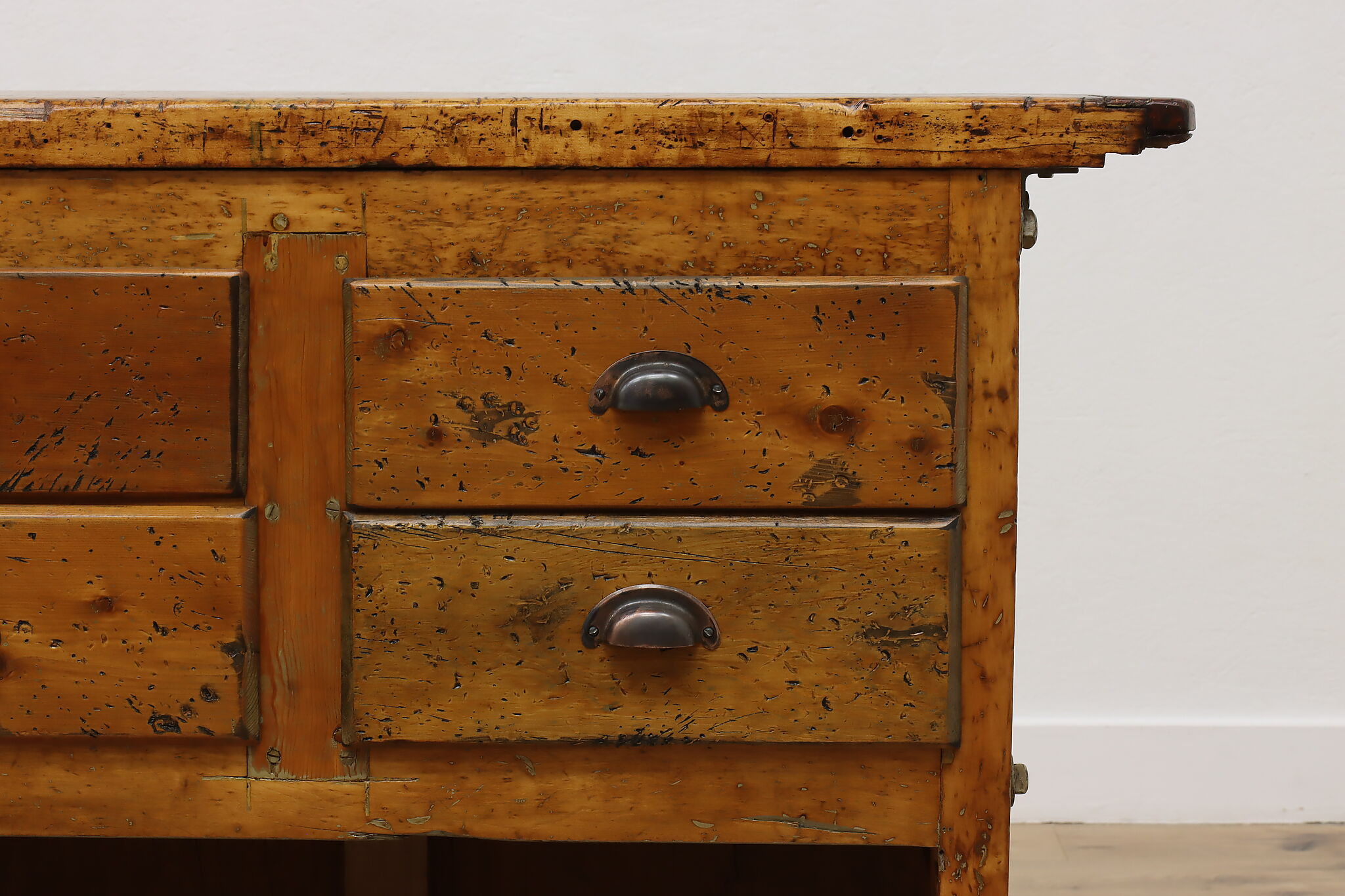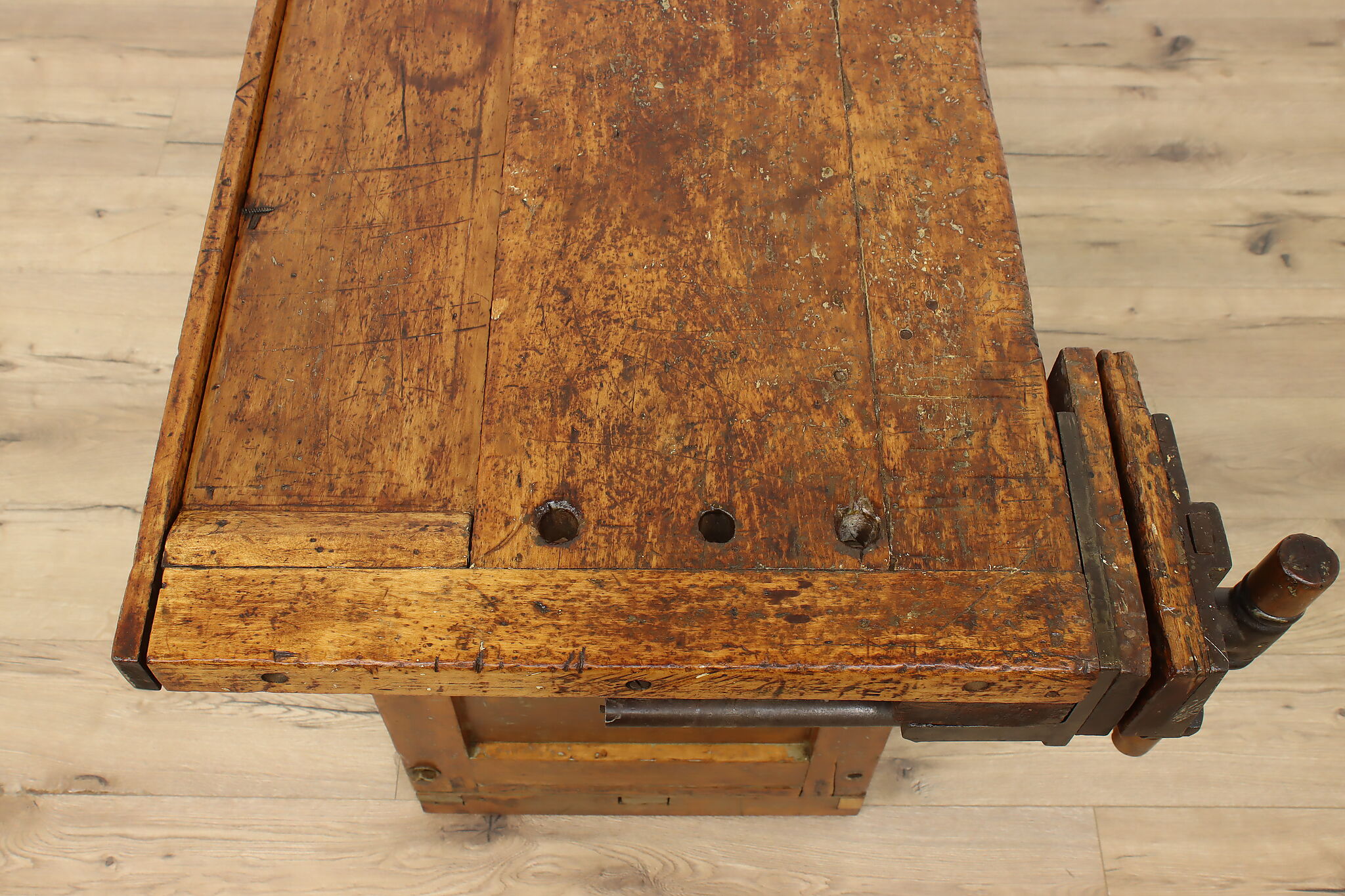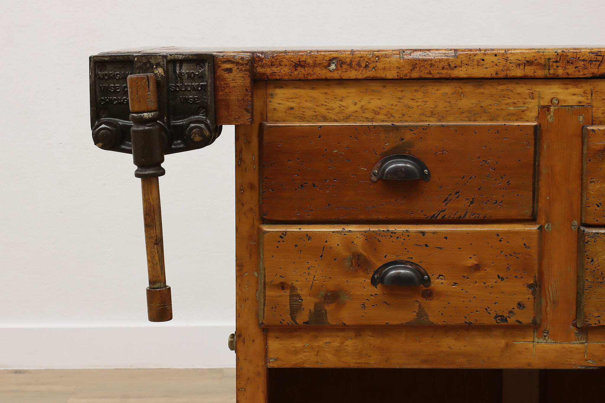 A wonderfully rustic workbench from a carpenter's shop is a surprisingly excellent option as a kitchen island, wine and cheese or crafting table!