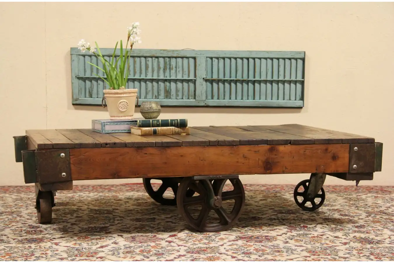 Made for a Wisconsin factory in the early 1900's, this well used cart or dolly would make a fascinating coffee table.