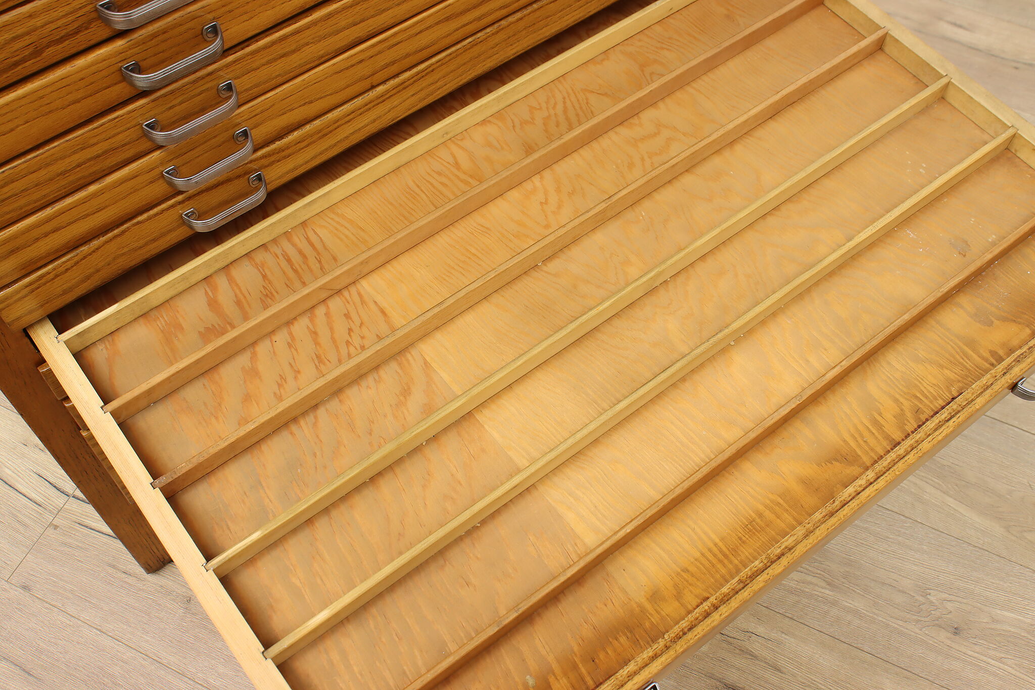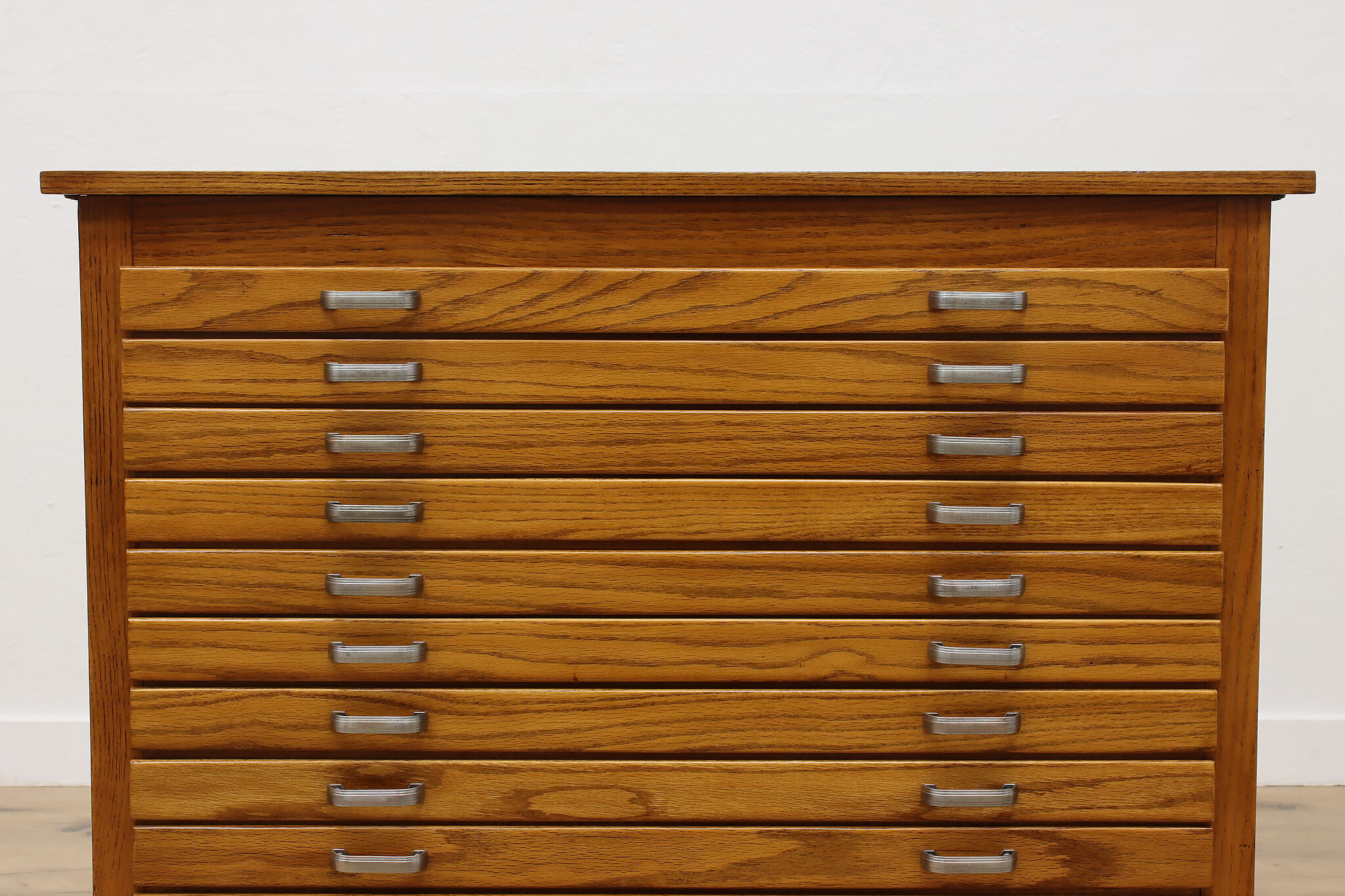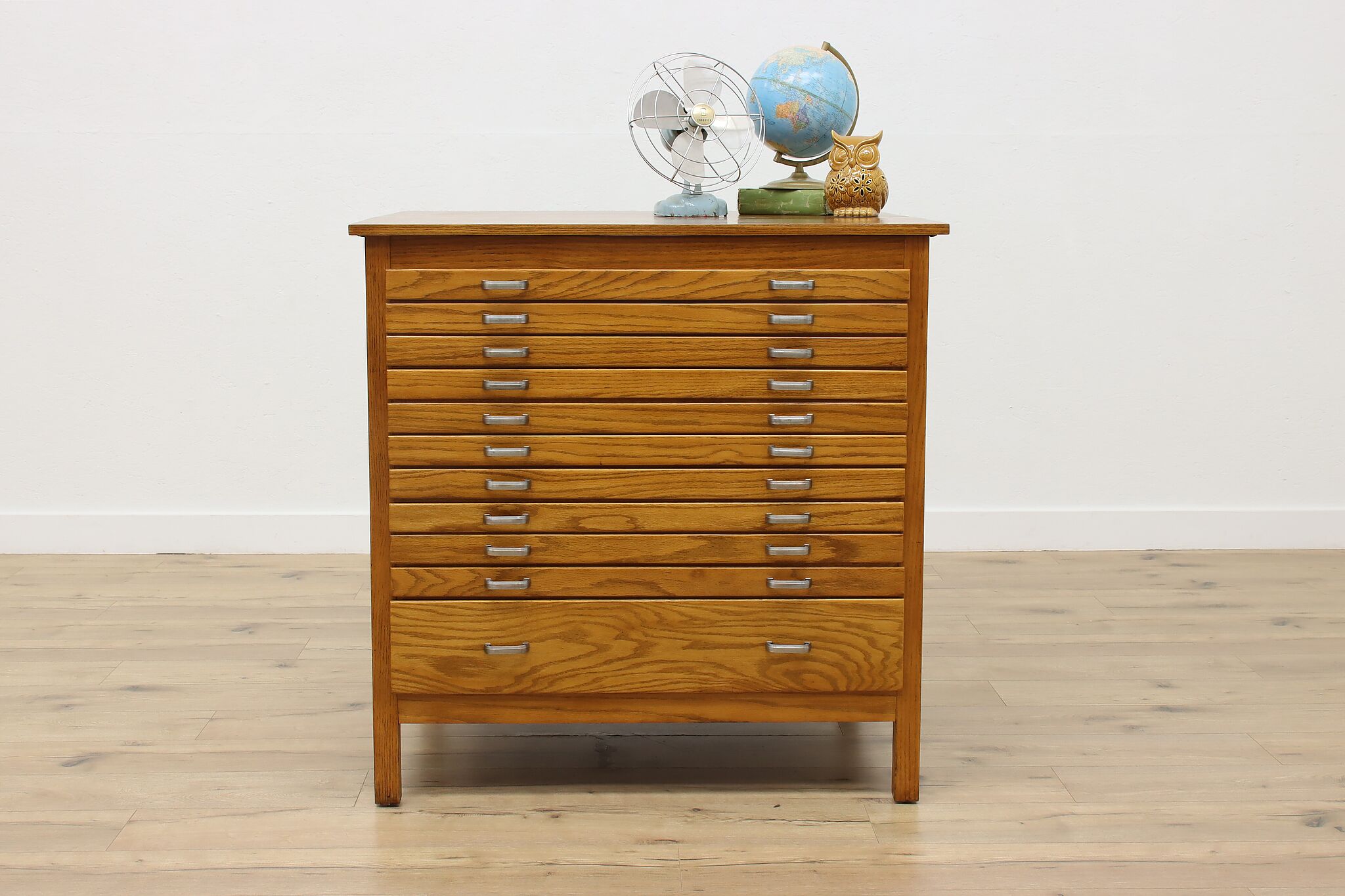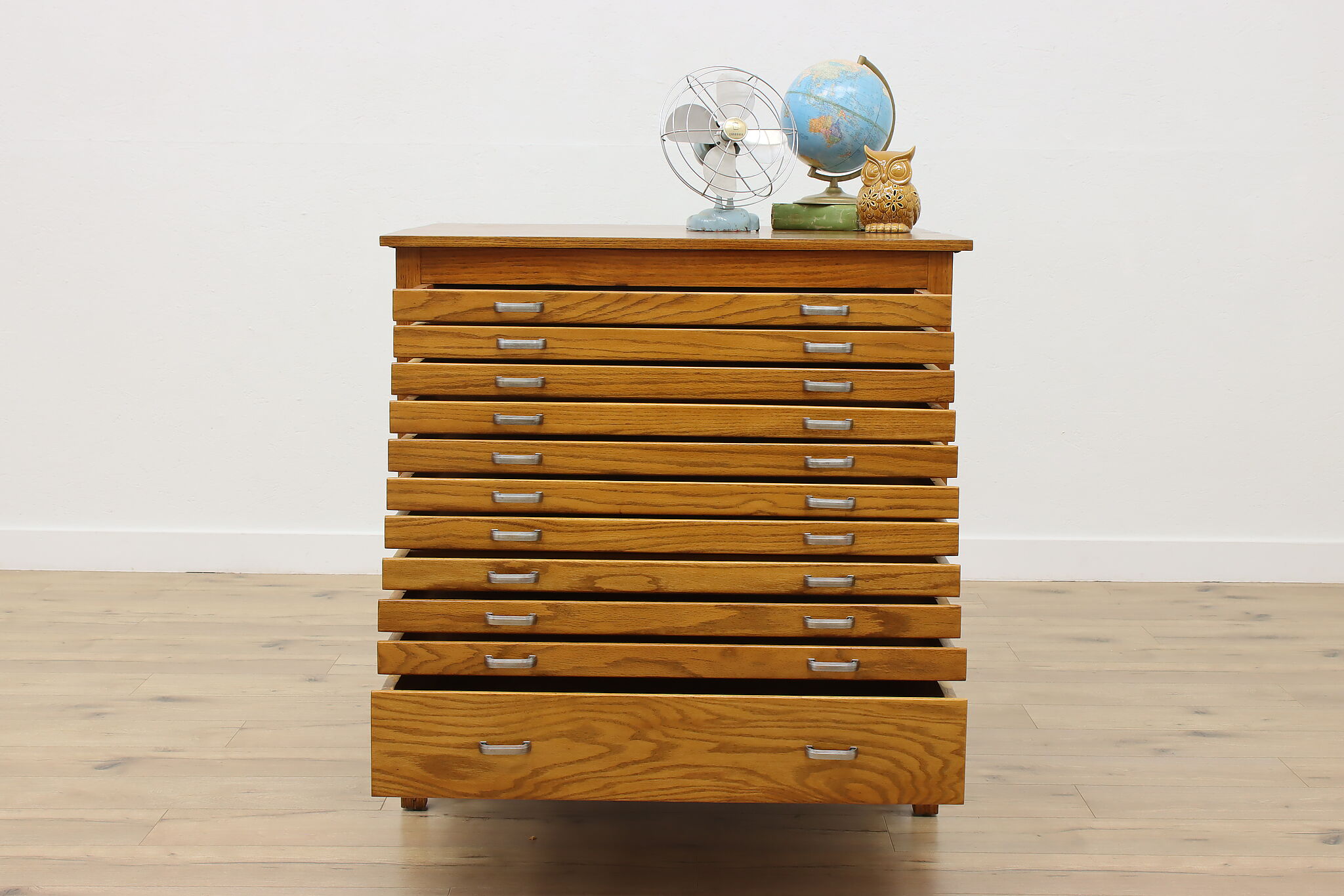 Size is 40.5" wide, 33.5" deep and 41" tall. Ten drawers are 33" wide, 26" deep and 1.5" tall. Bottom drawer is 33" wide, 26" deep and 5.5" tall.