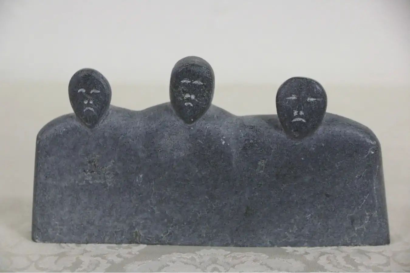 A traditional soapstone abstract sculpture with three heads was hand carved and engraved by an "Inuit" artist, of the Native American people of Canada and Alaska formerly known as Eskimos. There are minor scuffs to this work of folk art, see photos. On the bottom are artist's inscriptions.