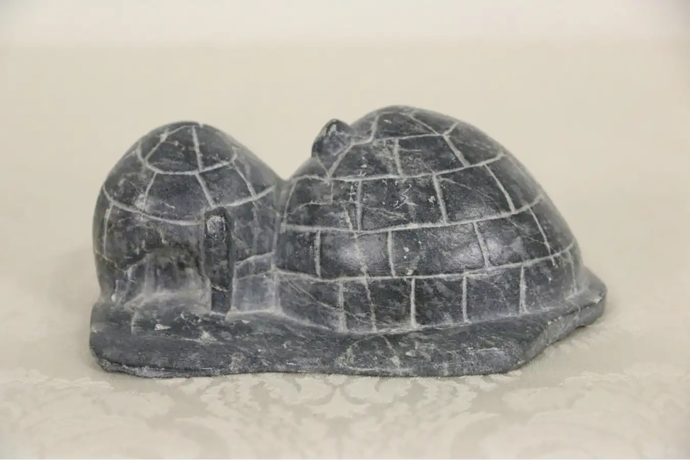 A traditional soapstone sculpture of adjoining igloos was hand carved and engraved by an "Inuit" artist, of the Native American people of Canada and Alaska formerly known as Eskimos.