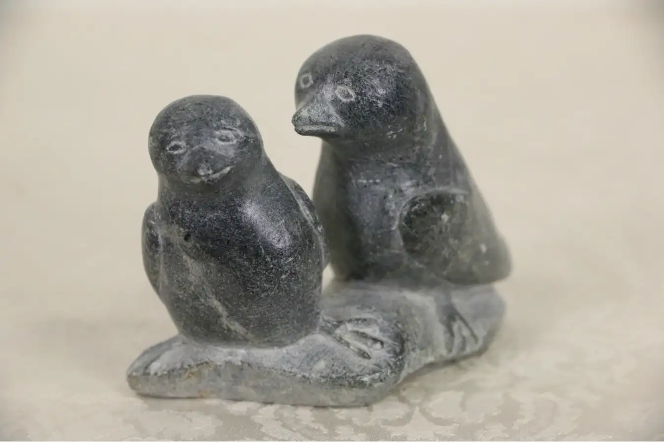 A traditional soapstone sculpture of a pair of Arctic birds was hand carved and engraved by an "Inuit" artist, of the Native American people of Canada and Alaska formerly known as Eskimos. There are minor scuffs to this work of folk art, see photos.