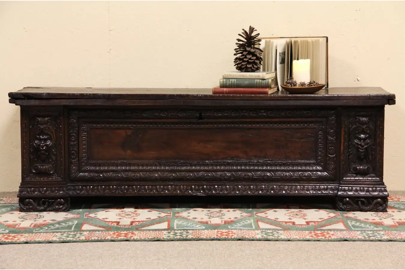 A "Cassone" or large chest was the most important family piece of furniture in an Italian "palazzo" or family palace. Rich and showy trophy furniture, this coffer, trunk or armor chest was filled with family treasures as the bride's dowry present.