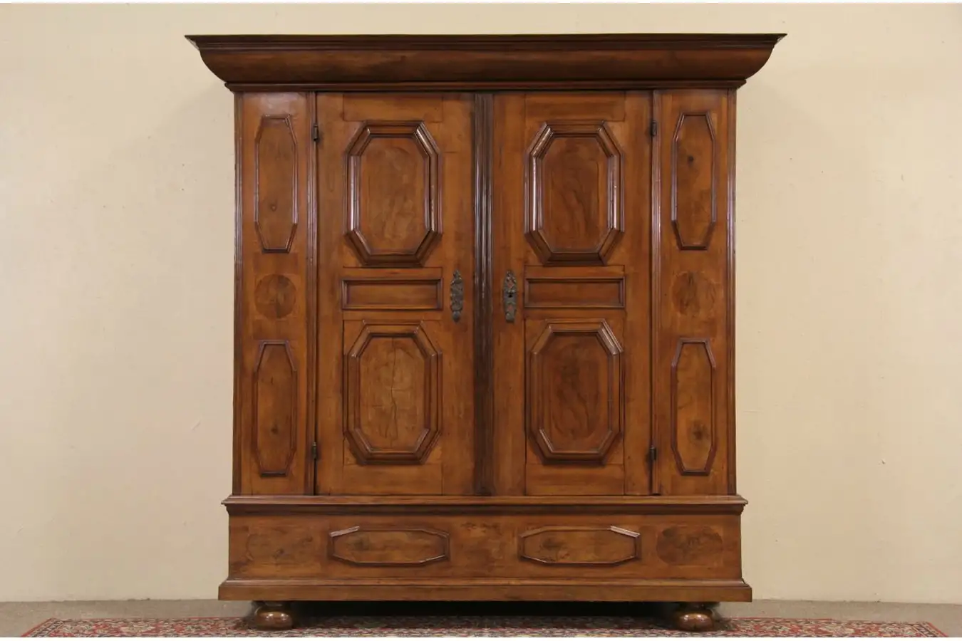 This European furniture can be disassembled for moving. Removable pine shelves inside are later, interior depth is 21," functional for a closet. The shaped crown, deep moldings and bun feet are very well proportioned.