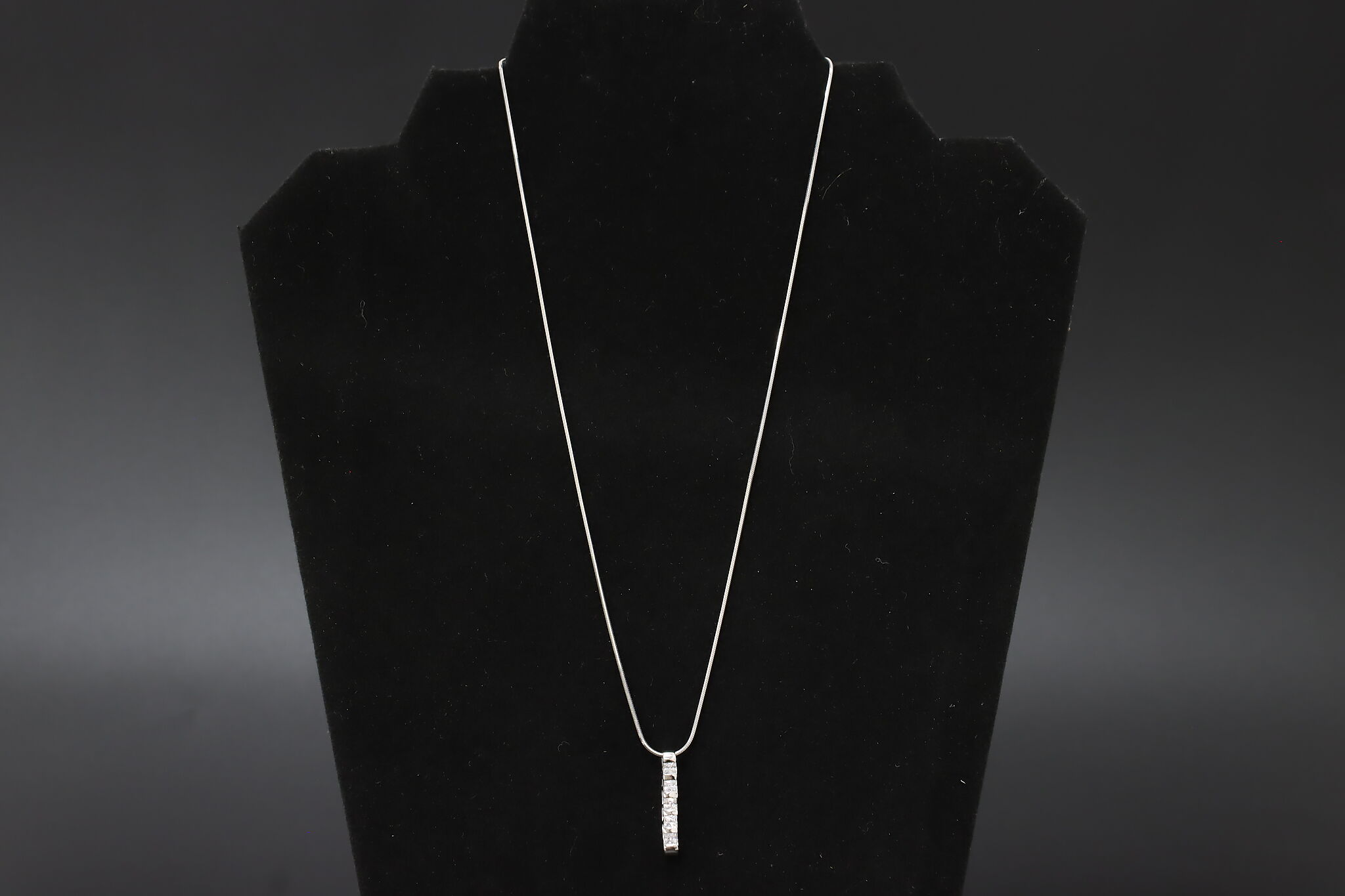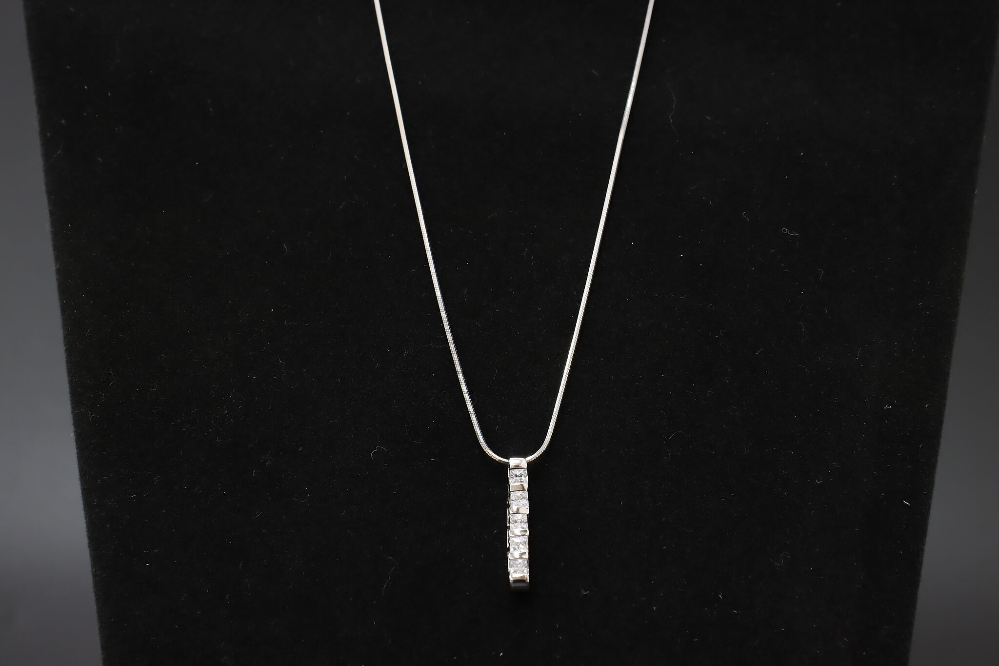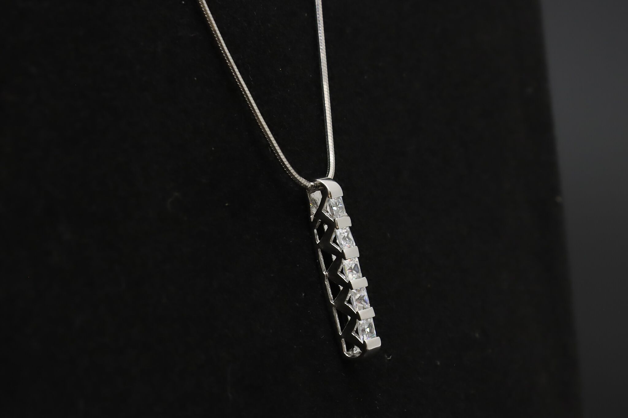 A beautiful five cubic zirconia gemstone pendant hangs on a silky smooth chain.