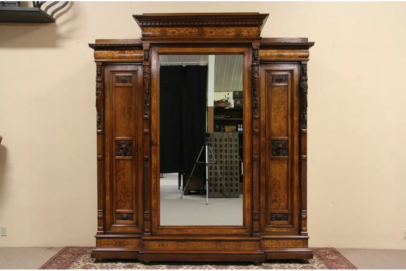 A monumental armoire has sculpted figures and heads, and was hand carved in Italy about 1880. Splendid moldings and engraved marquetry are stunning on this historic furniture.