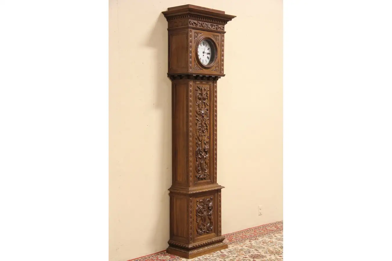 A magnificently hand carved Italian tall case or grandfather clock from about 1890 has griffins and richly detailed moldings, the brass movement keeps excellent time.