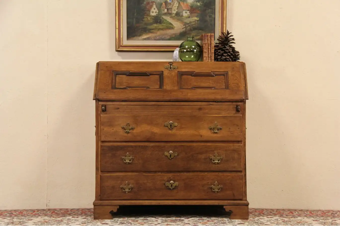 There are various restorations over the years, and size is 39" wide, 19" deep, 39 1/2" tall and the desktop is 30" high.
