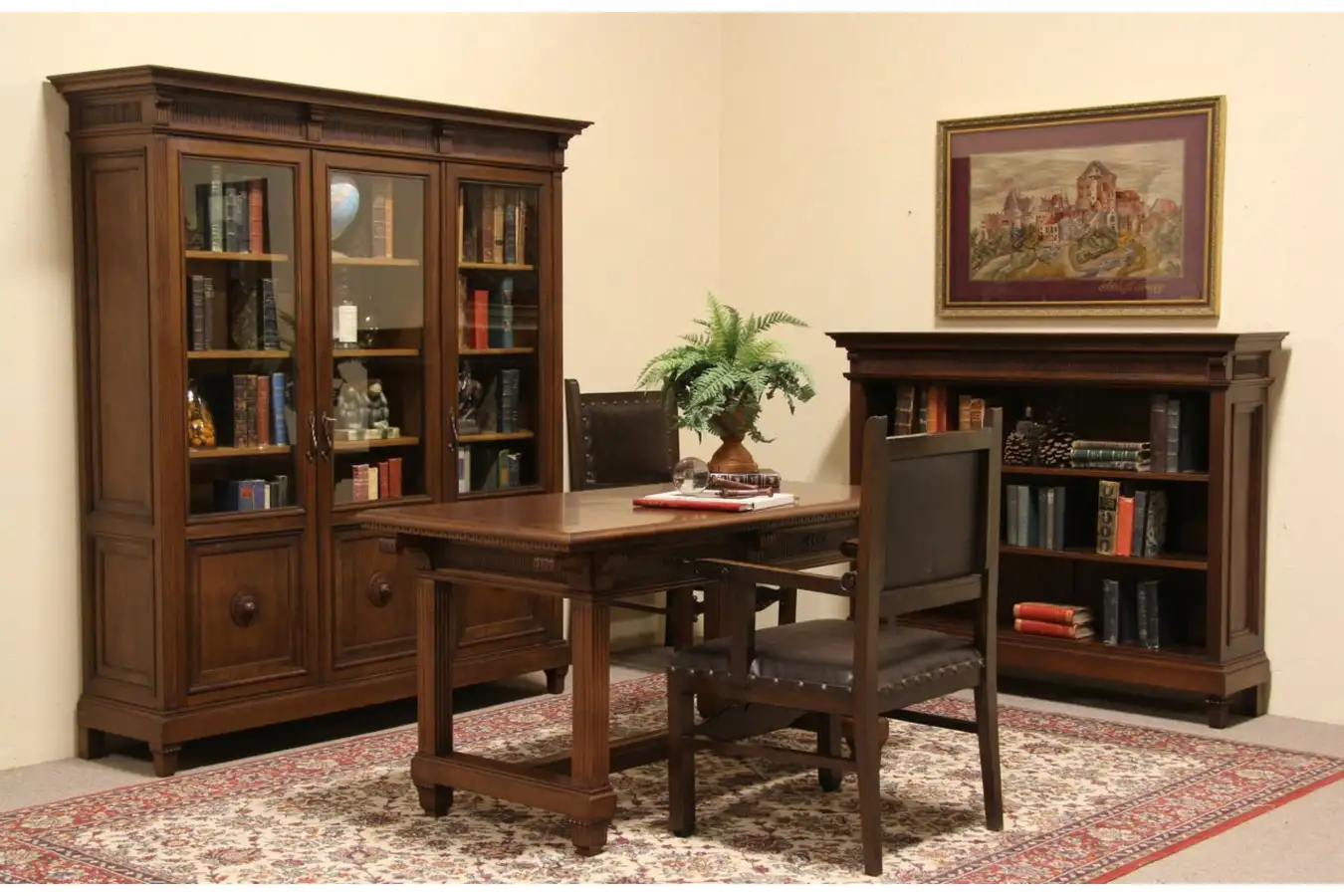 Carved of walnut about 1910 in northern Italy, a library set includes a table or writing desk, triple bookcase, open bookcase and two leather armchairs.