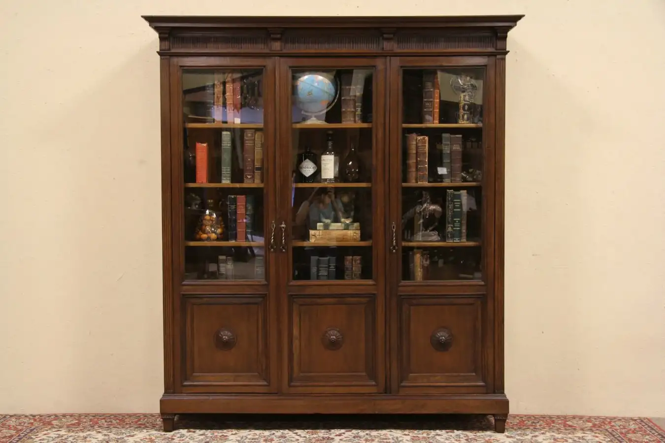 Carved of of wormy walnut about 1910 in northern Italy, a triple library bookcase is in beautiful condition. Three doors with glass panes have original working locks and hardware. The original finish is in very fine condition with minor mars at the edges. Waxed and buffed, only an occasional wipe with a soft dry cloth is needed to maintain its warm antique patina.