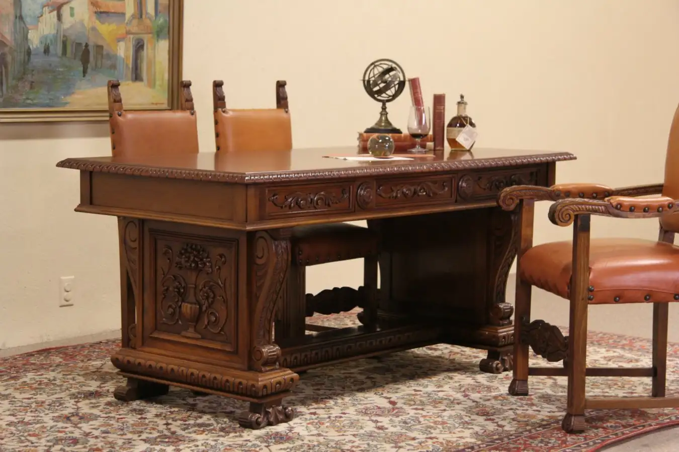 A magnificent library desk or writing table from the north of Italy has sculpted three dimensional classical panels, dating from about 1915.