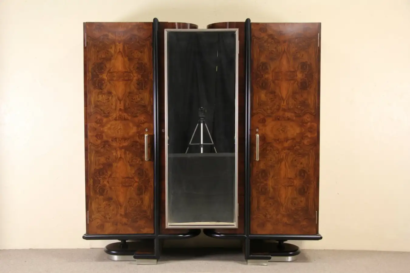 A magnificent Art Deco period triple armoire was expertly crafted in northern Italy about 1935. Matched rosewood and walnut burl has a superb satiny finish with ebonized accents. There are minor mars at the edges for antique character, see photos.