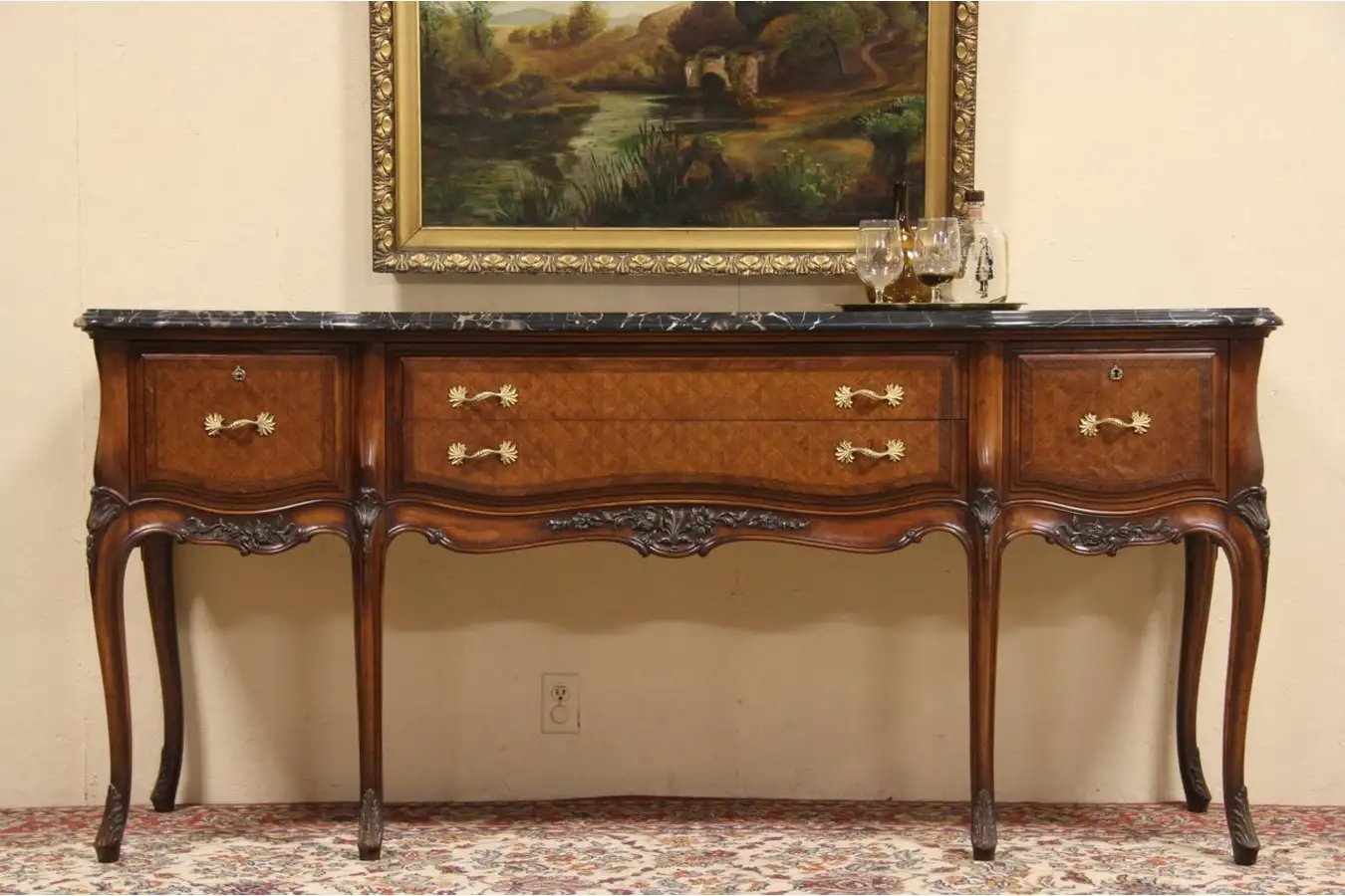 An exquisite sideboard or server was artistically hand crafted in northern Italy about 1930. The famous black "Nero Porturo" marble top has a shaped rim, and has been polished and sealed to resist stains. The graceful walnut frame has hand carved detailing and subtly painted bronze highlights.
