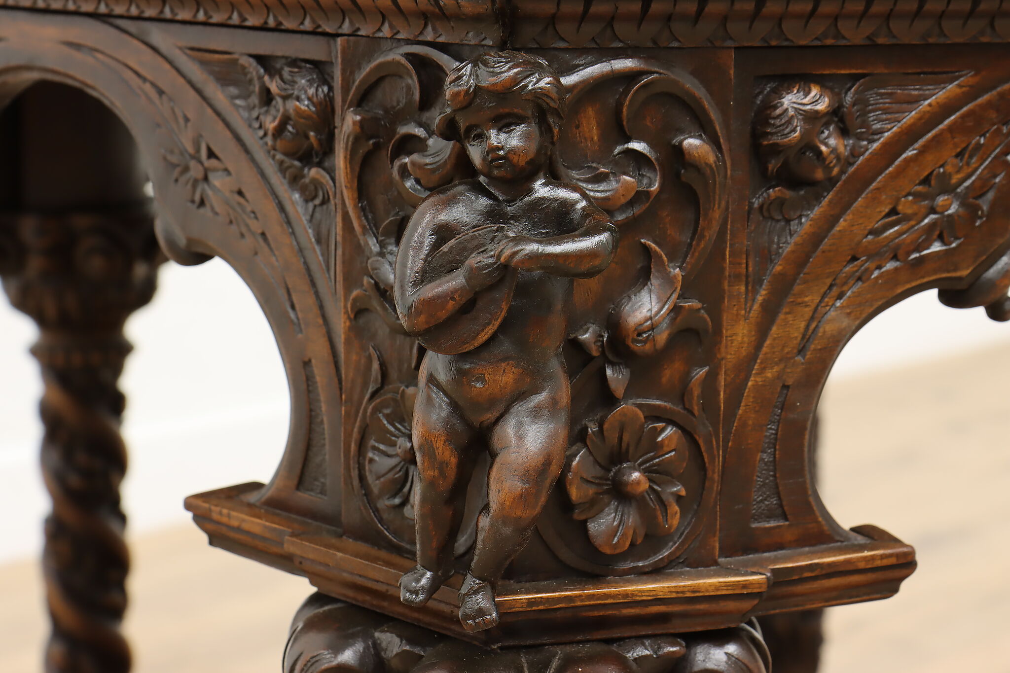 A spectacular center table was hand carved in Italy with angels and lions supporting the columns.