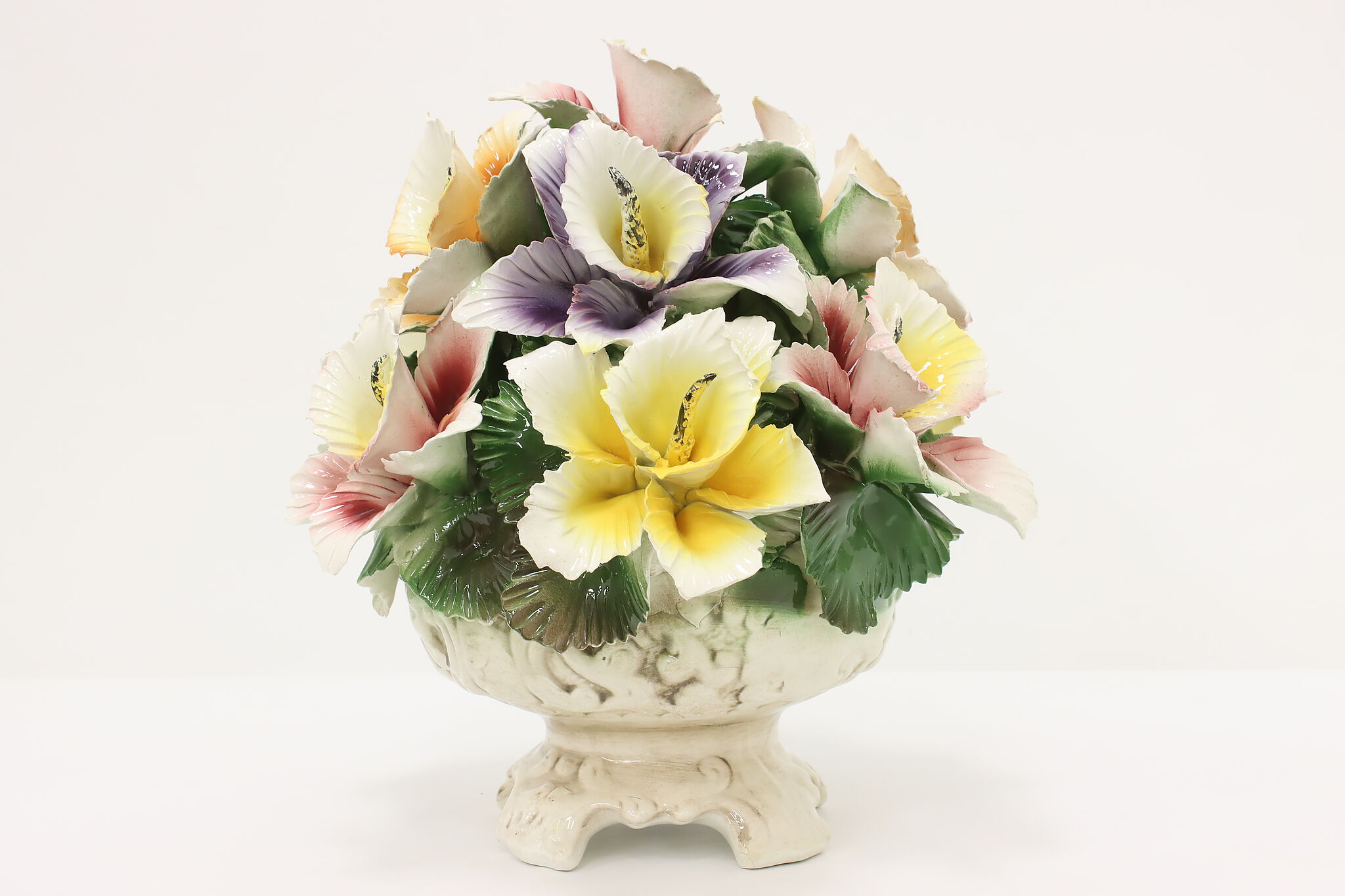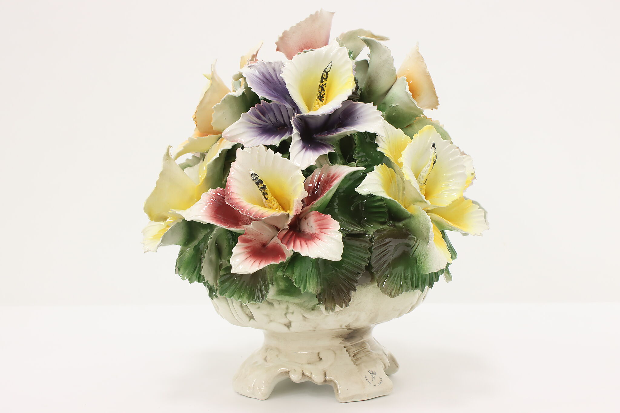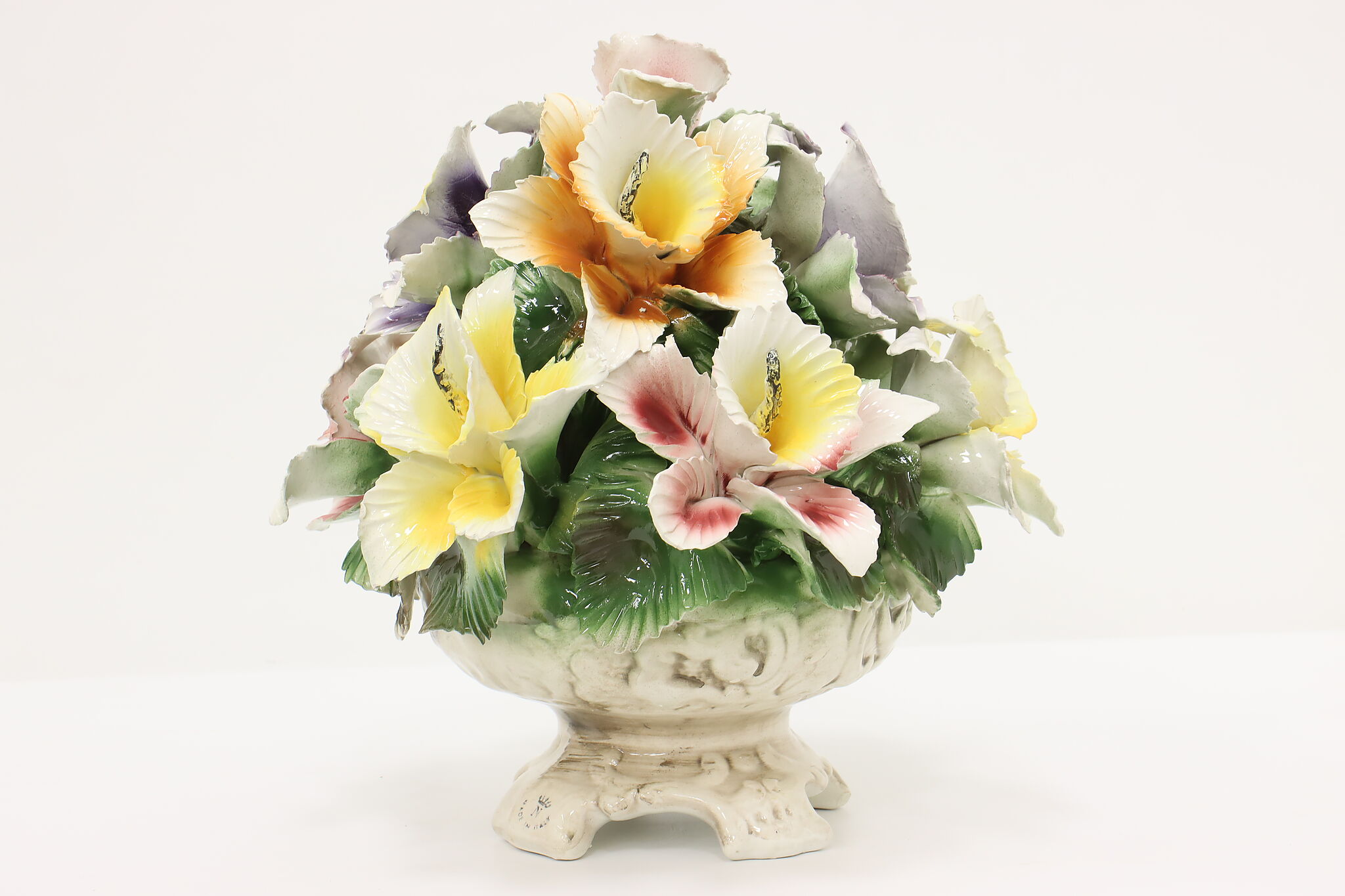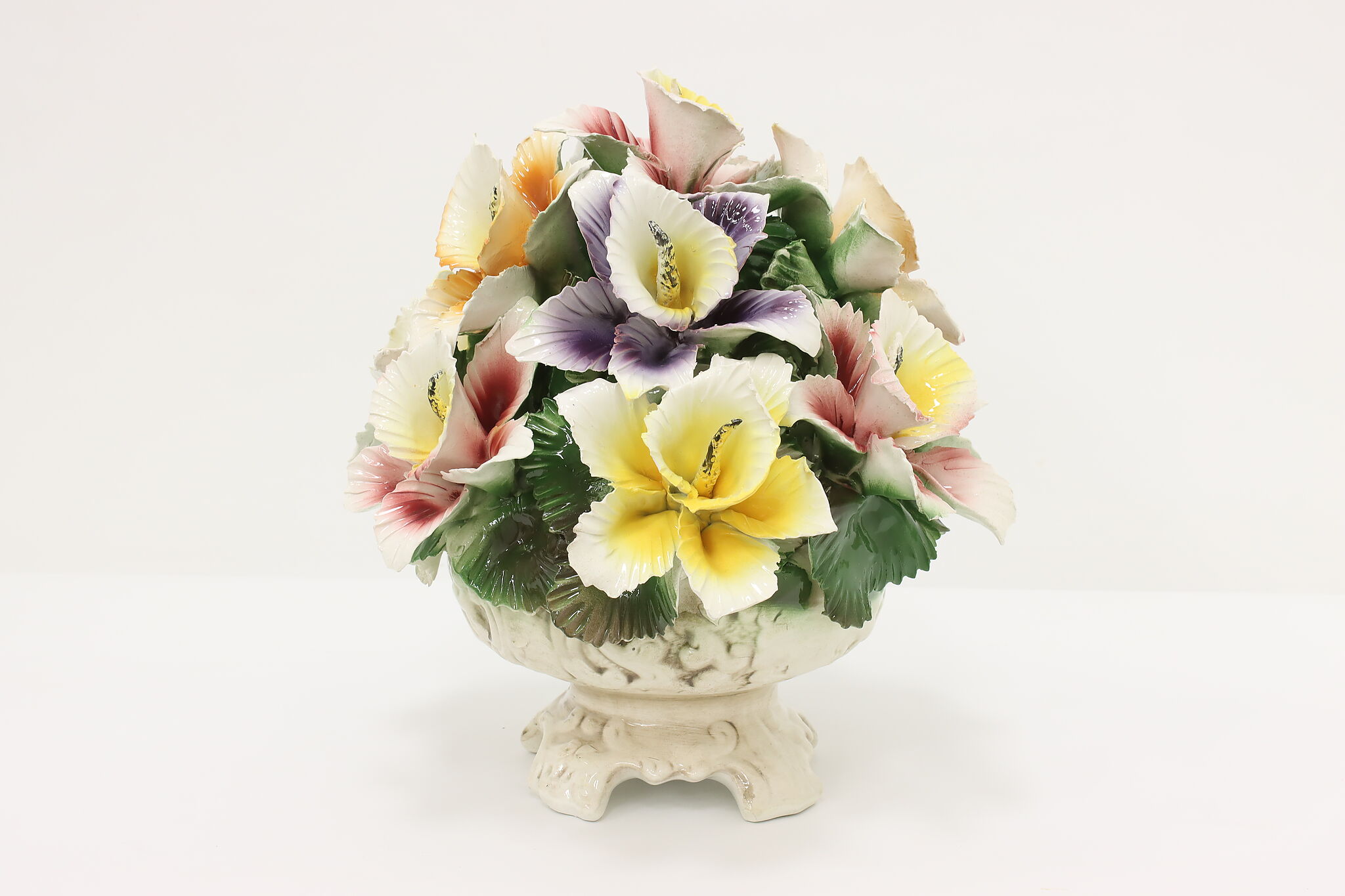This beautifully detailed and hand painted flower basket sculpture is traditional Italian Capodimonte porcelain.