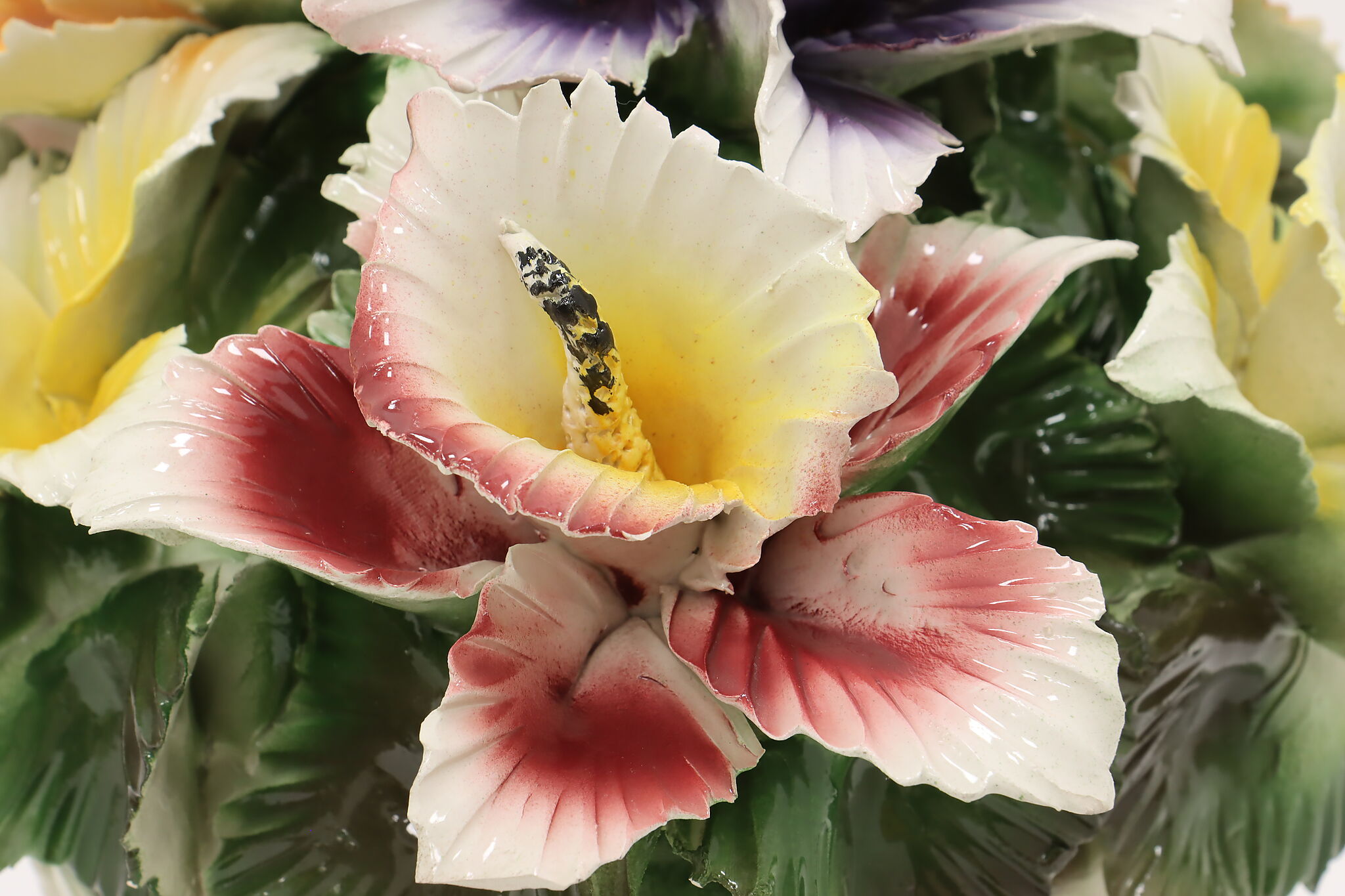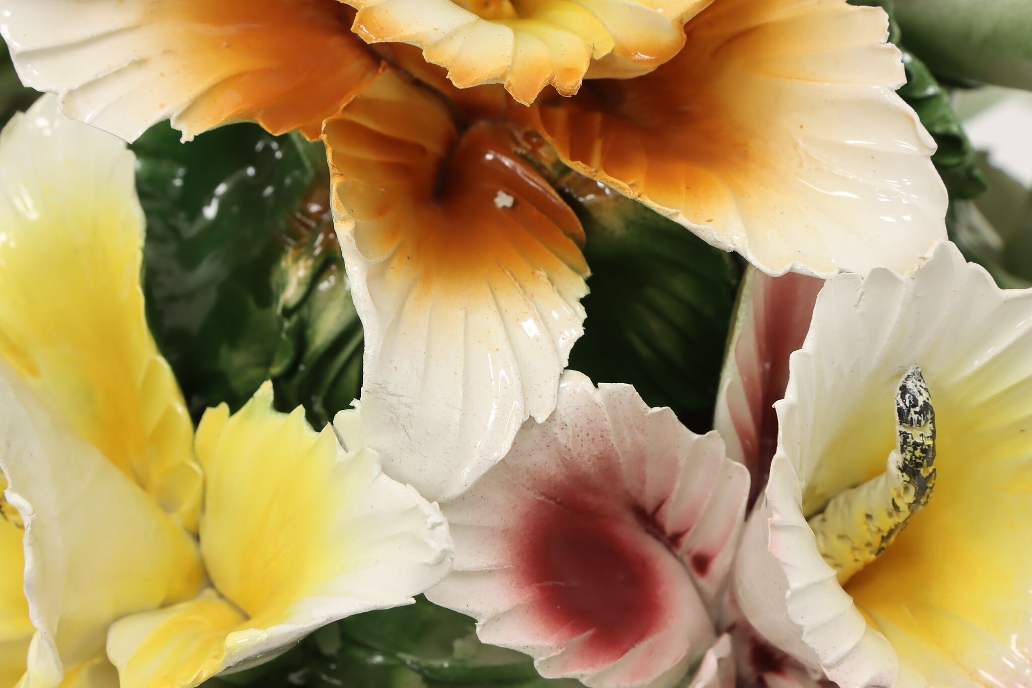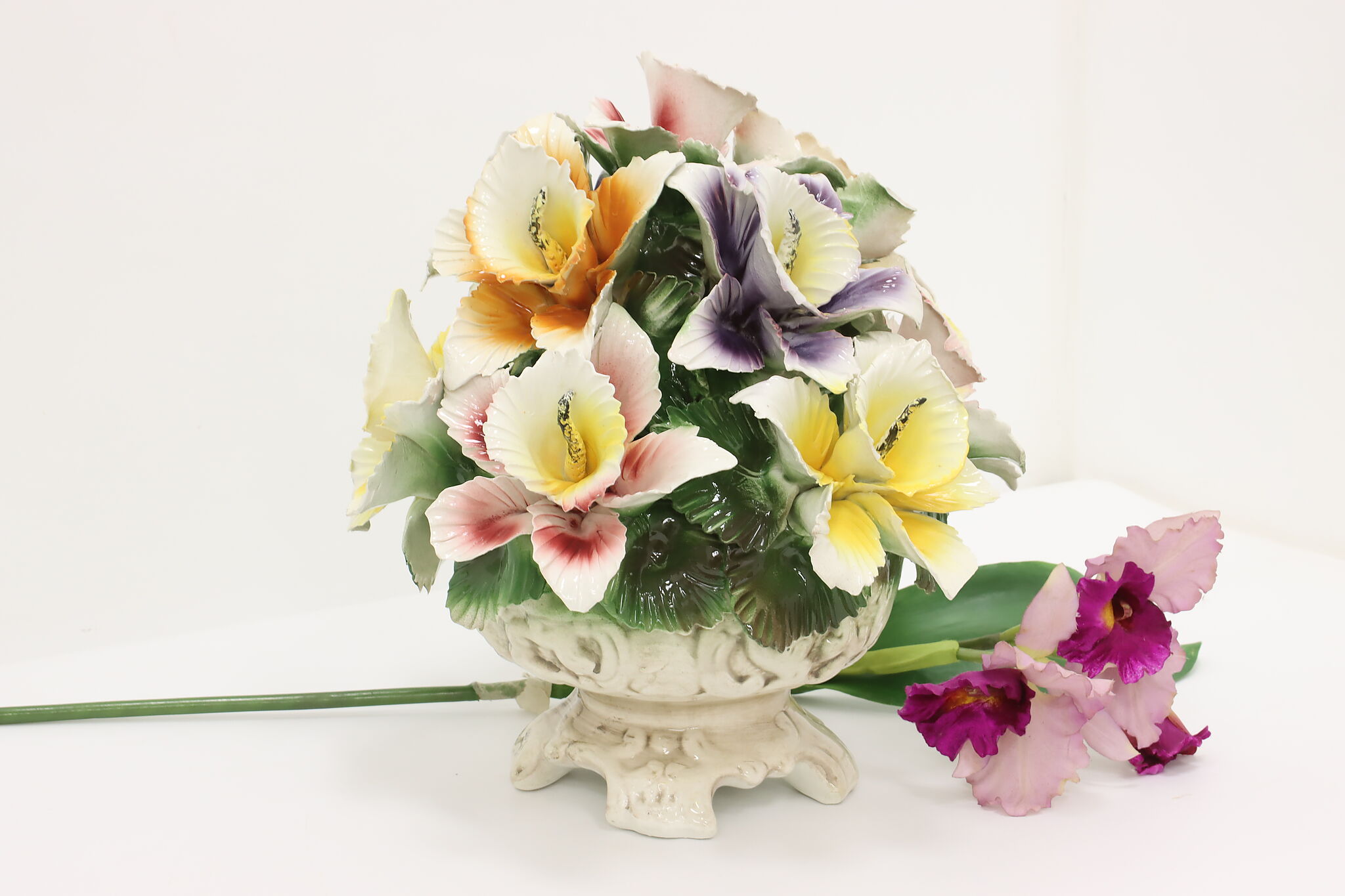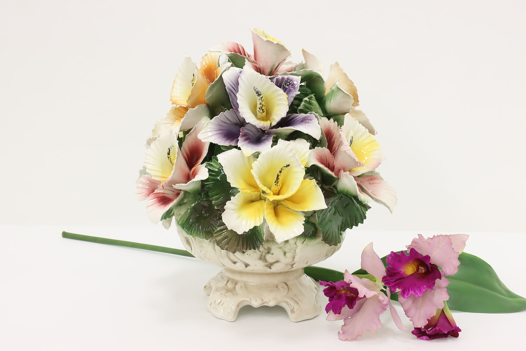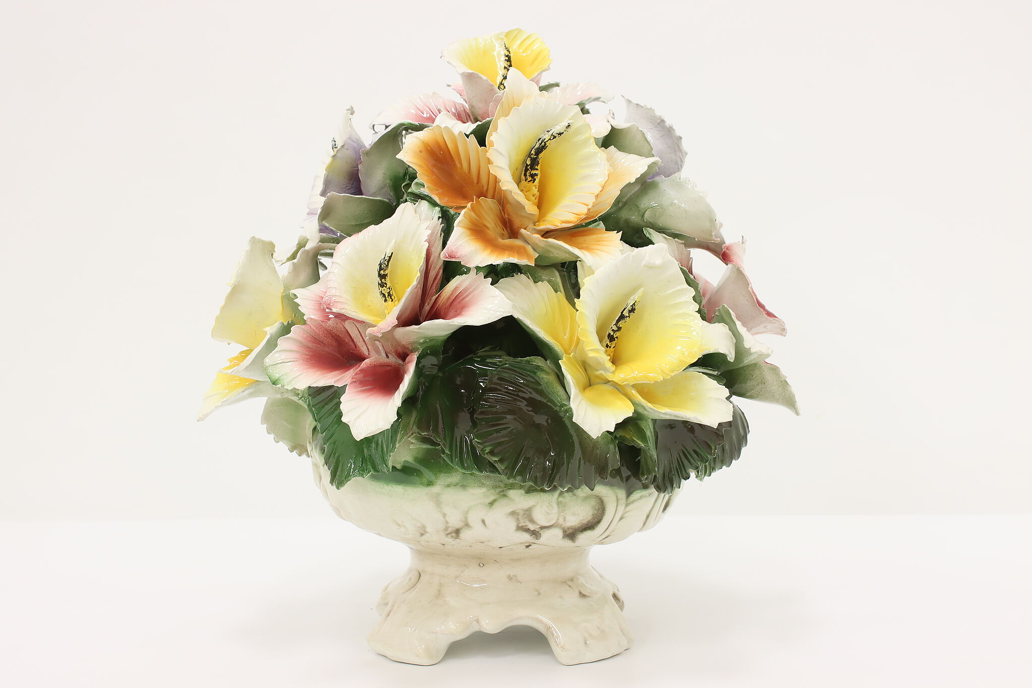This beautifully detailed and hand painted flower basket sculpture is traditional Italian Capodimonte porcelain.