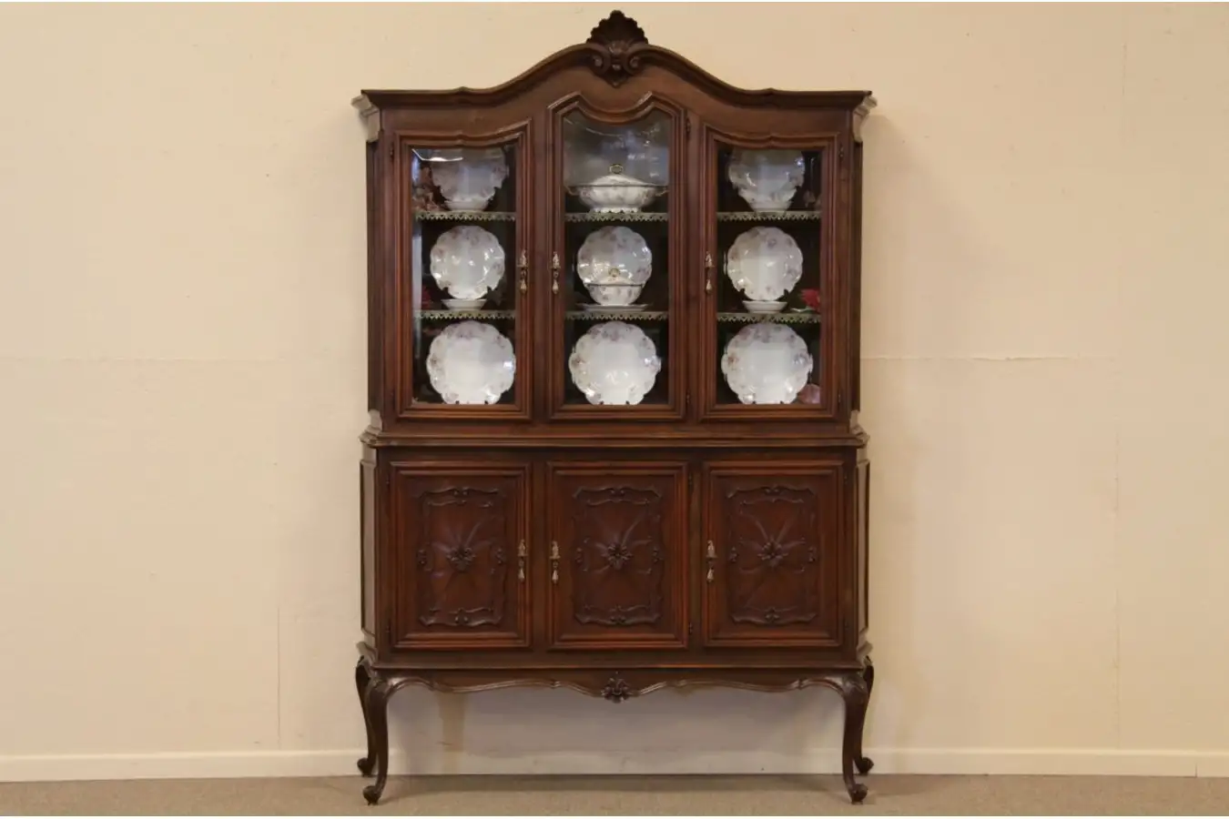 Hand-carved of walnut about 1930, this grand curio or china cabinet has great storage. The original warm brown finish is excellent, front and sides are gracefully curved. This beautiful cabinet has the original brass hardware including galleries on the shelves. There are also the original working locks plus shaped and beveled glass panes.
