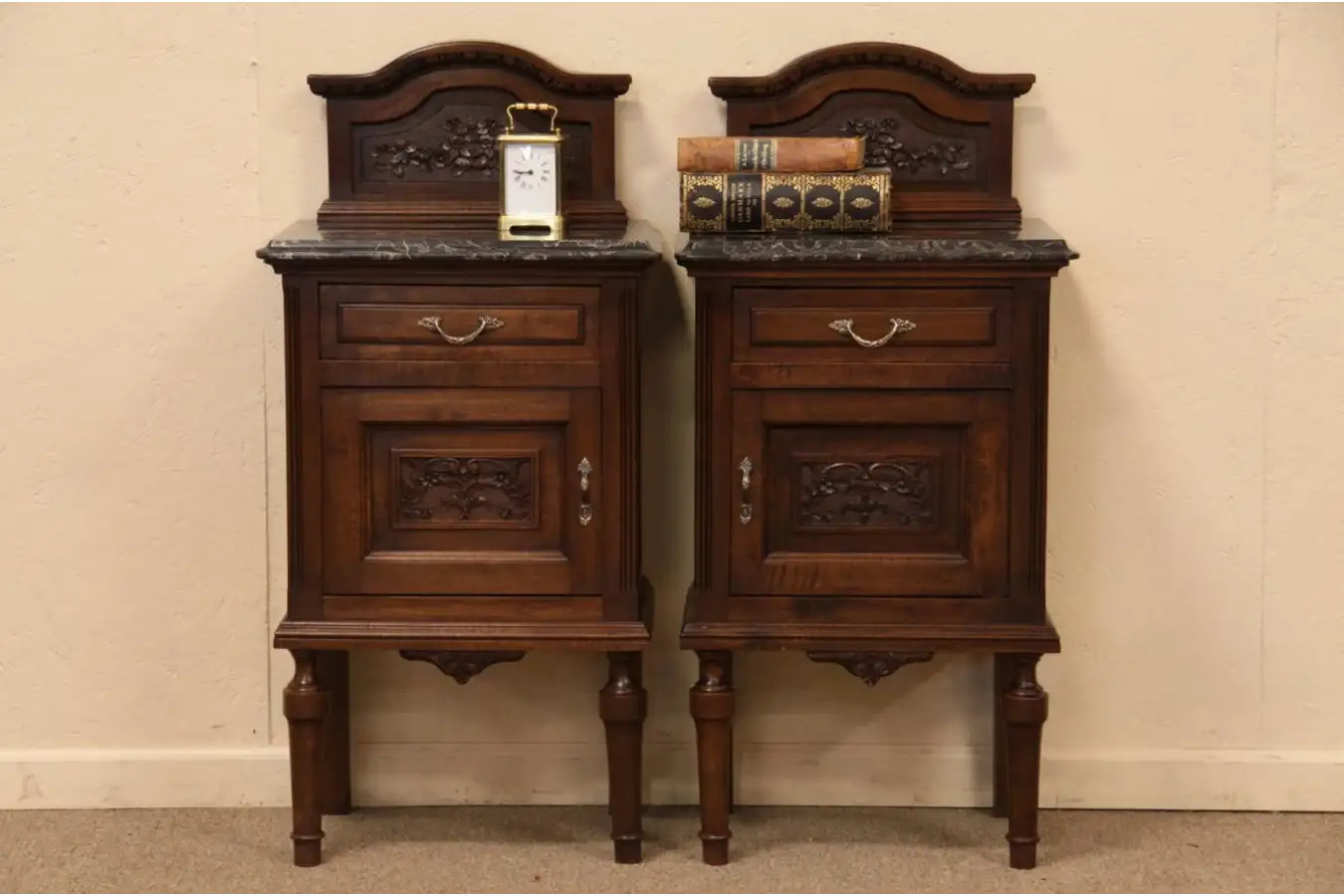 Elegantly hand carved in Northern Italy, these marble top bedside tables or nightstands are a true right and left pair.