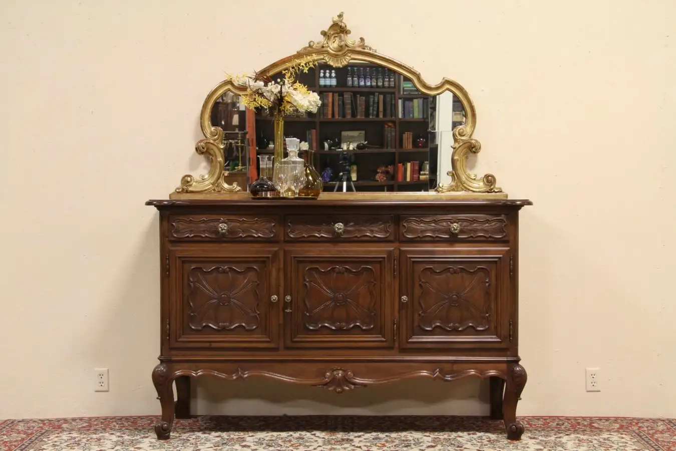 Hand-carved of walnut about 1930, this grand sideboard, server or hall console has a mirror with original gold leaf.