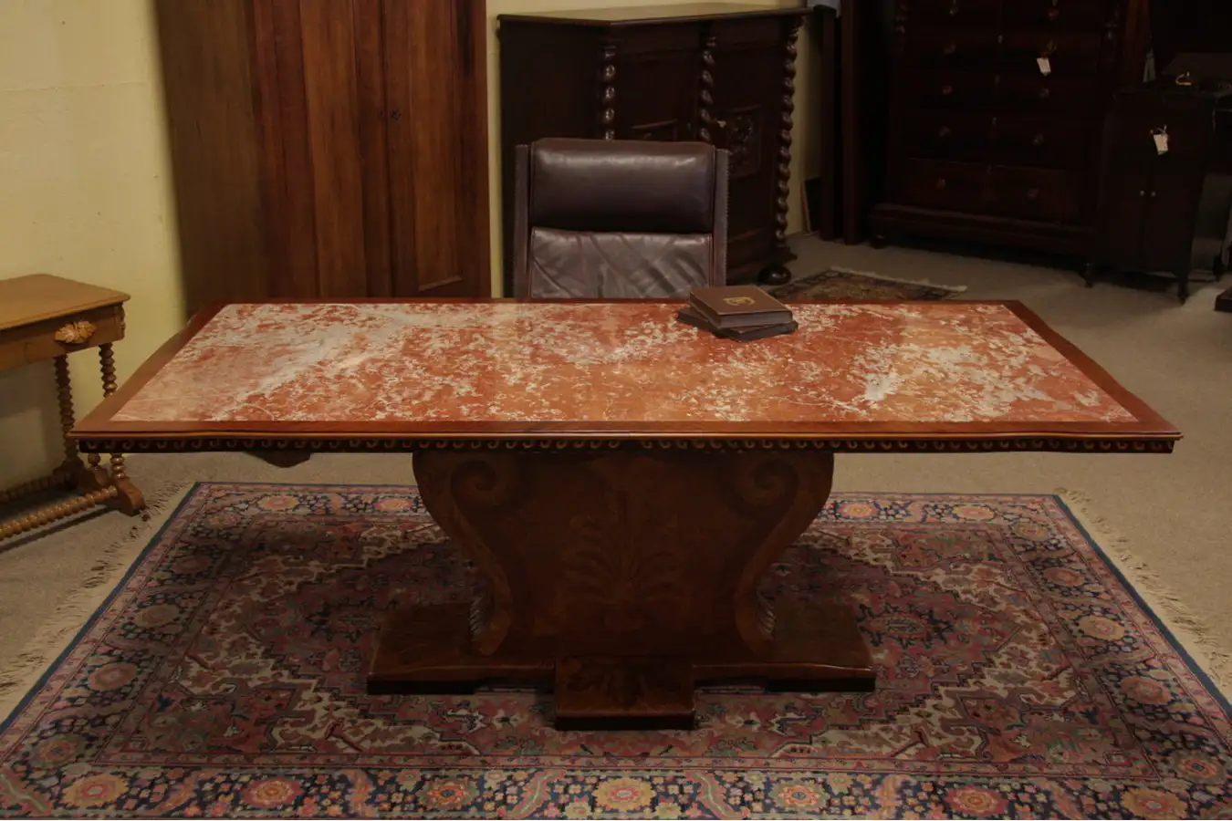 Spectacular in design and craftsmanship, an Italian table has lavish marquetry and a marble top. Whether used as a dining, hall or library table, or as a writing desk, this antique makes a strong and sophisticated statement.