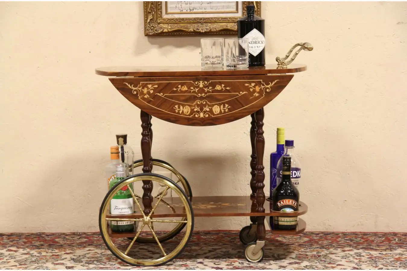 The glossy finish has only minor scratches and a touchup under the original finish, see photos. On the base are sockets for bottles or glassware. Sides are drop leaves that can be raised for extra space. Brass galleries surround the top, and there is a flat spot on one large wheel from sitting.
