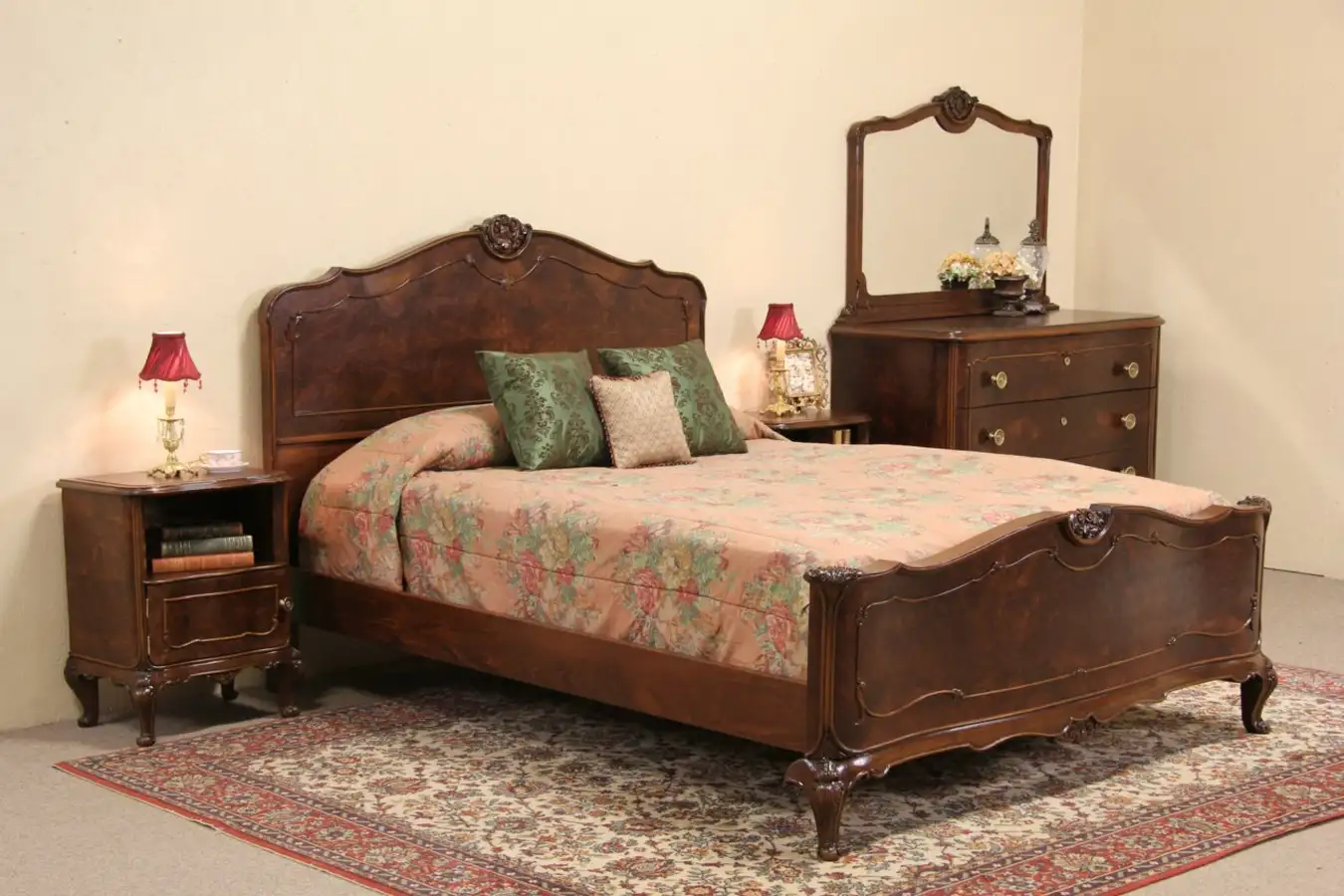 Hand carved in Italy about 1920, this sophisticated bedroom set includes a queen size bed, large dresser or chest and two nightstands.