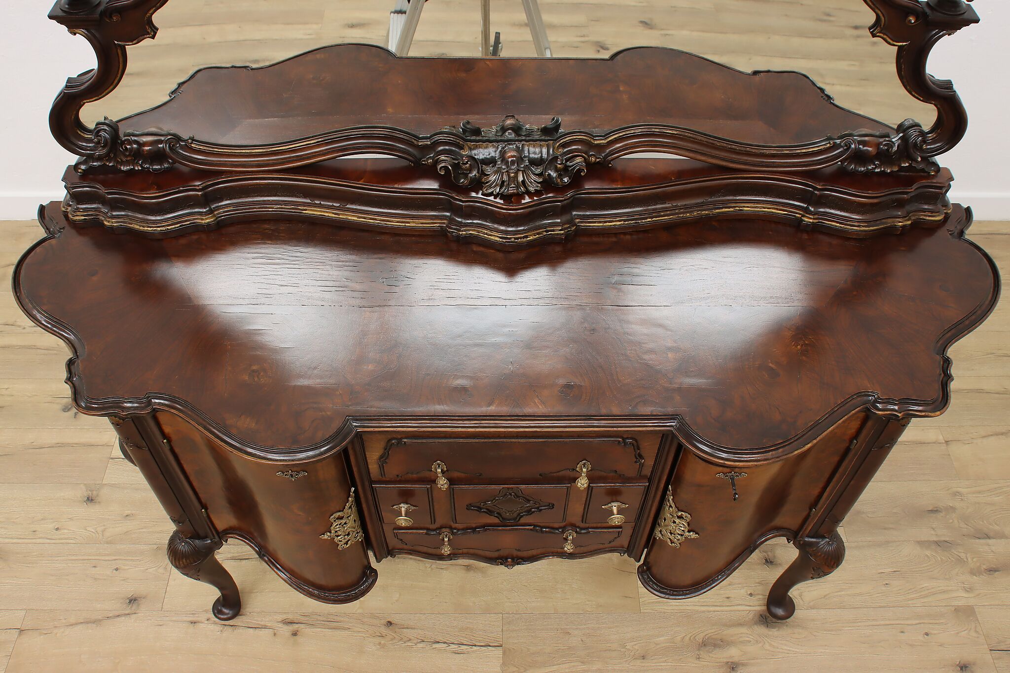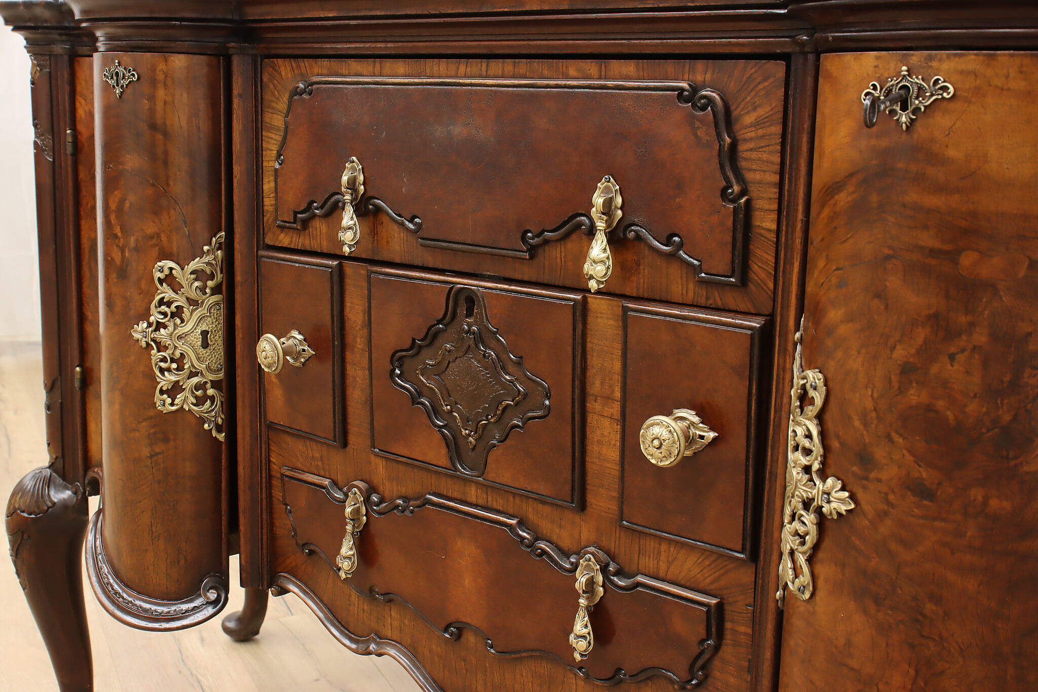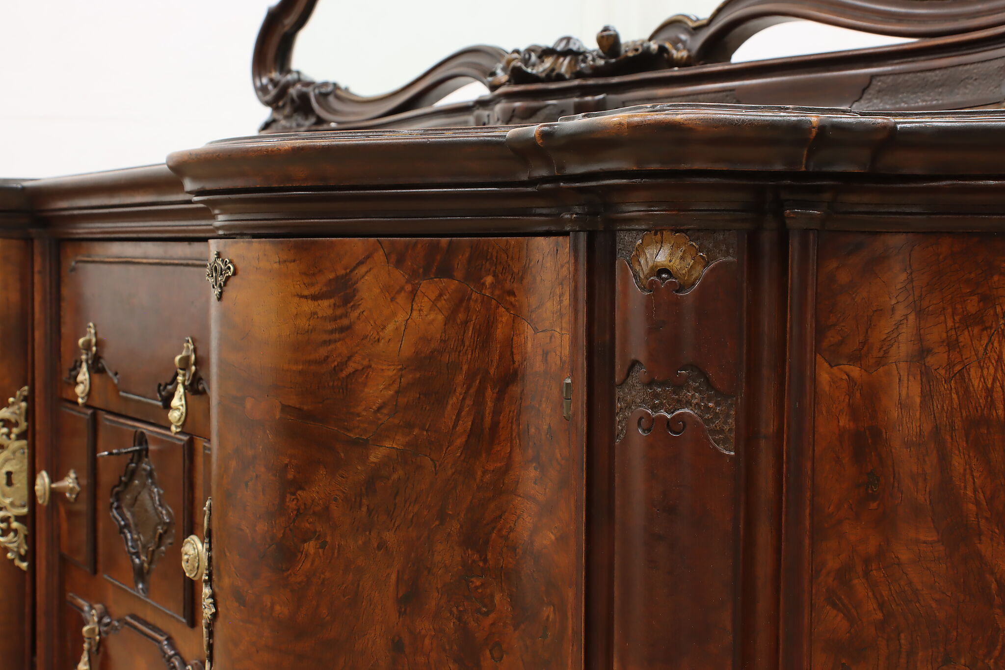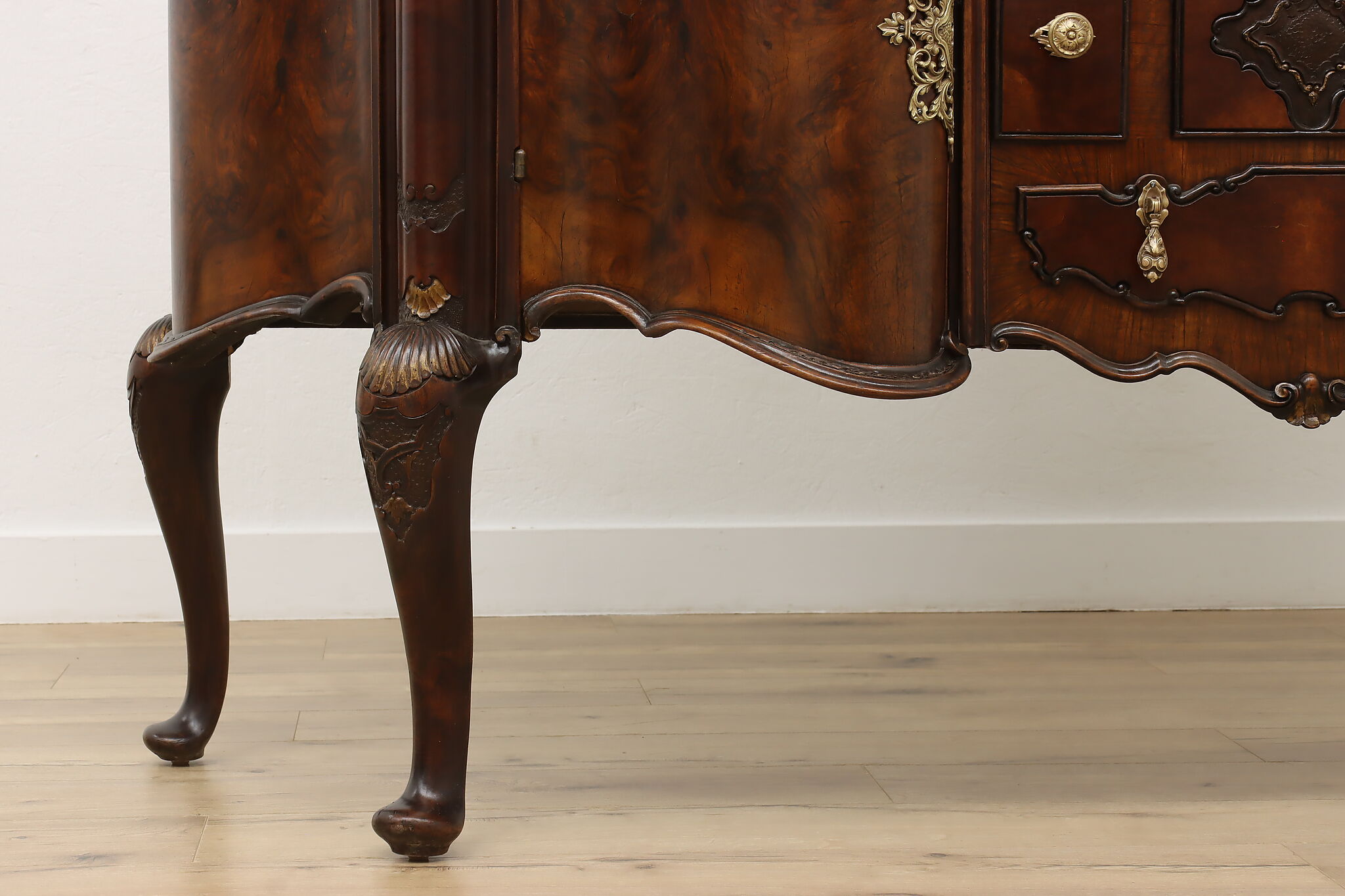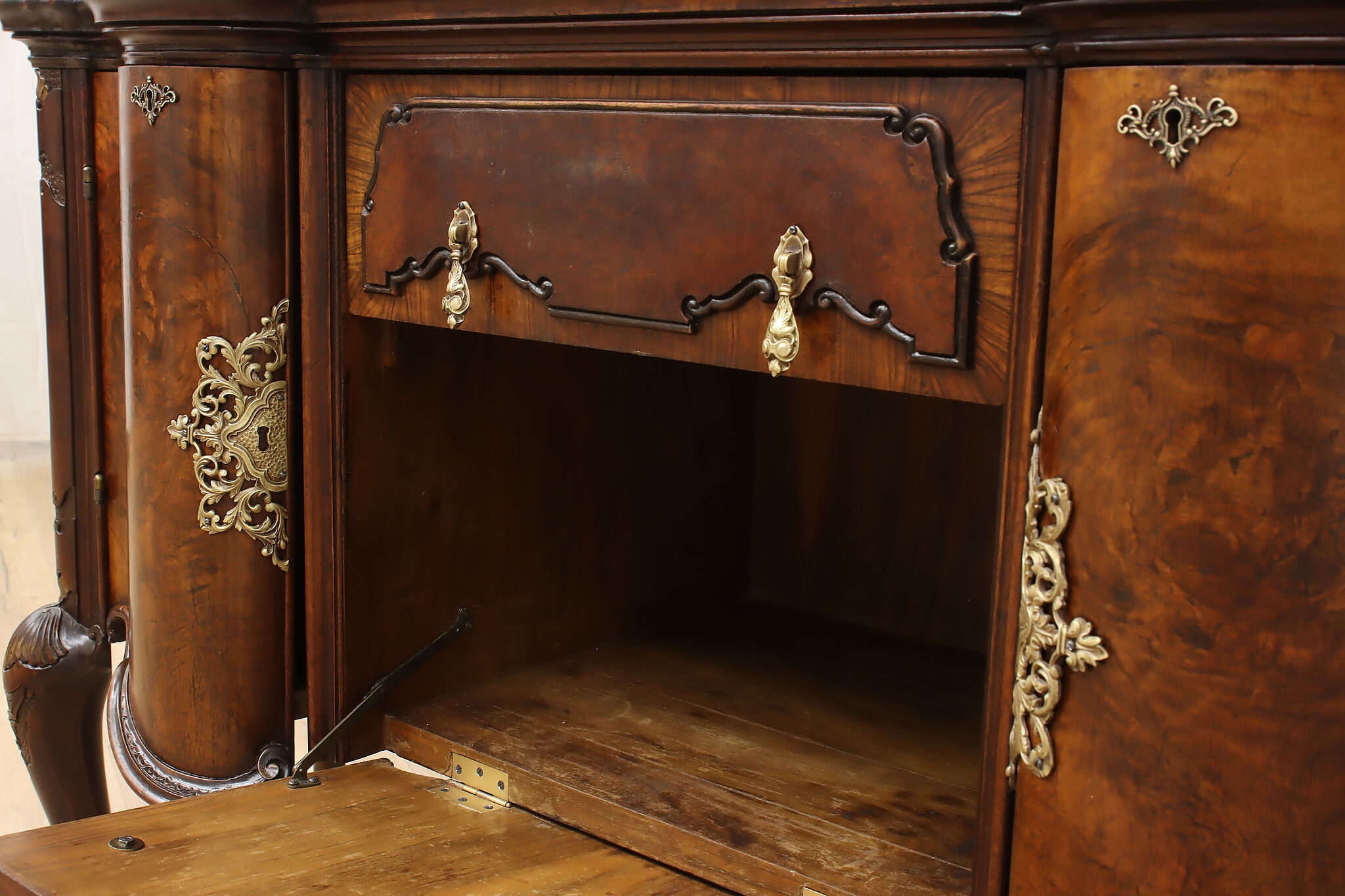 This extravagant Italian Rococo design sideboard, buffet or bar is a showstopping piece! With graceful curves and beautiful burl woods, this piece offers elegance and sophistication while commanding the attention of the room.