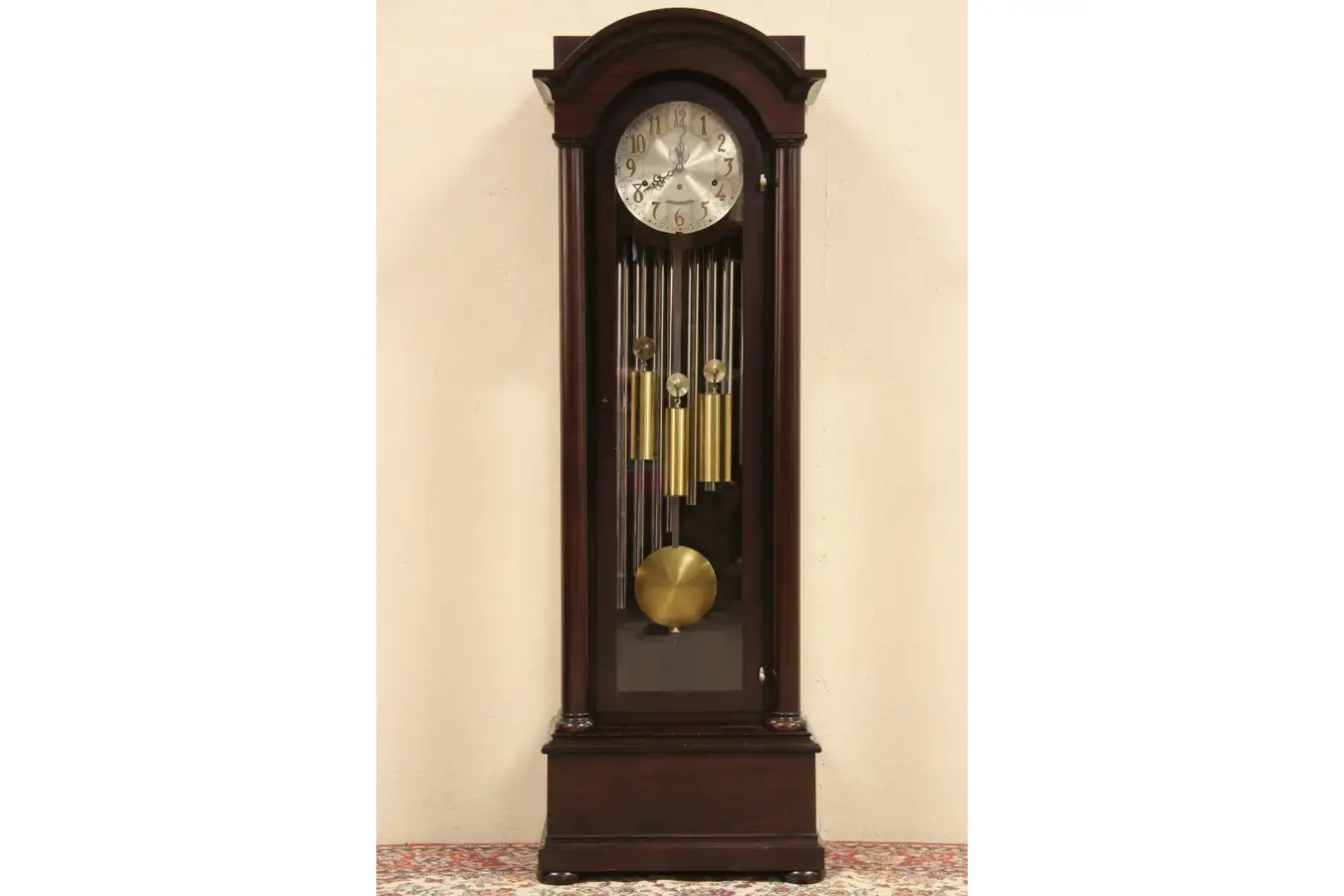 A classic tall case or grandfather clock from about 1910 softly plays a melody on 9 resonant chime tubes.