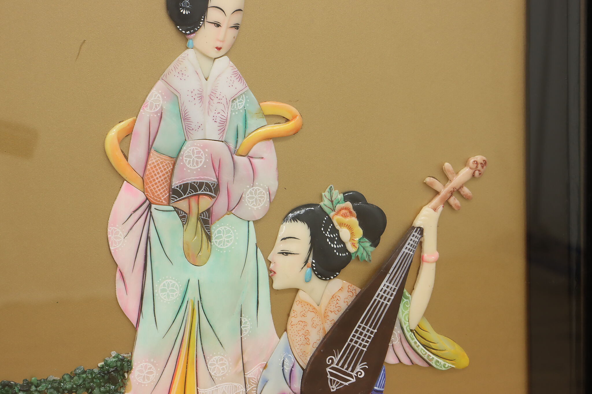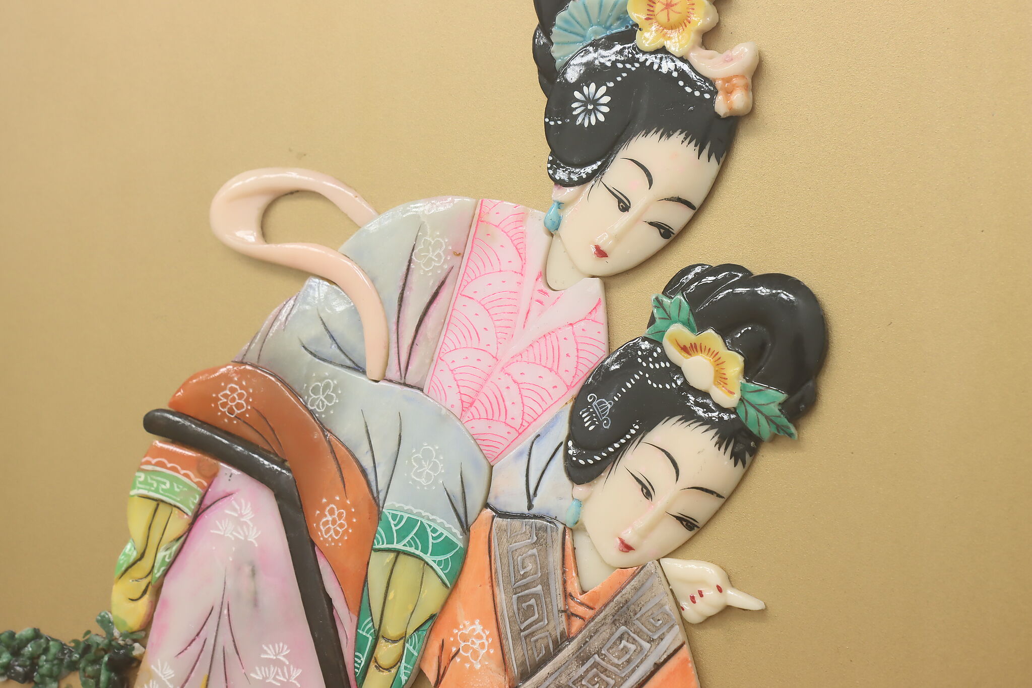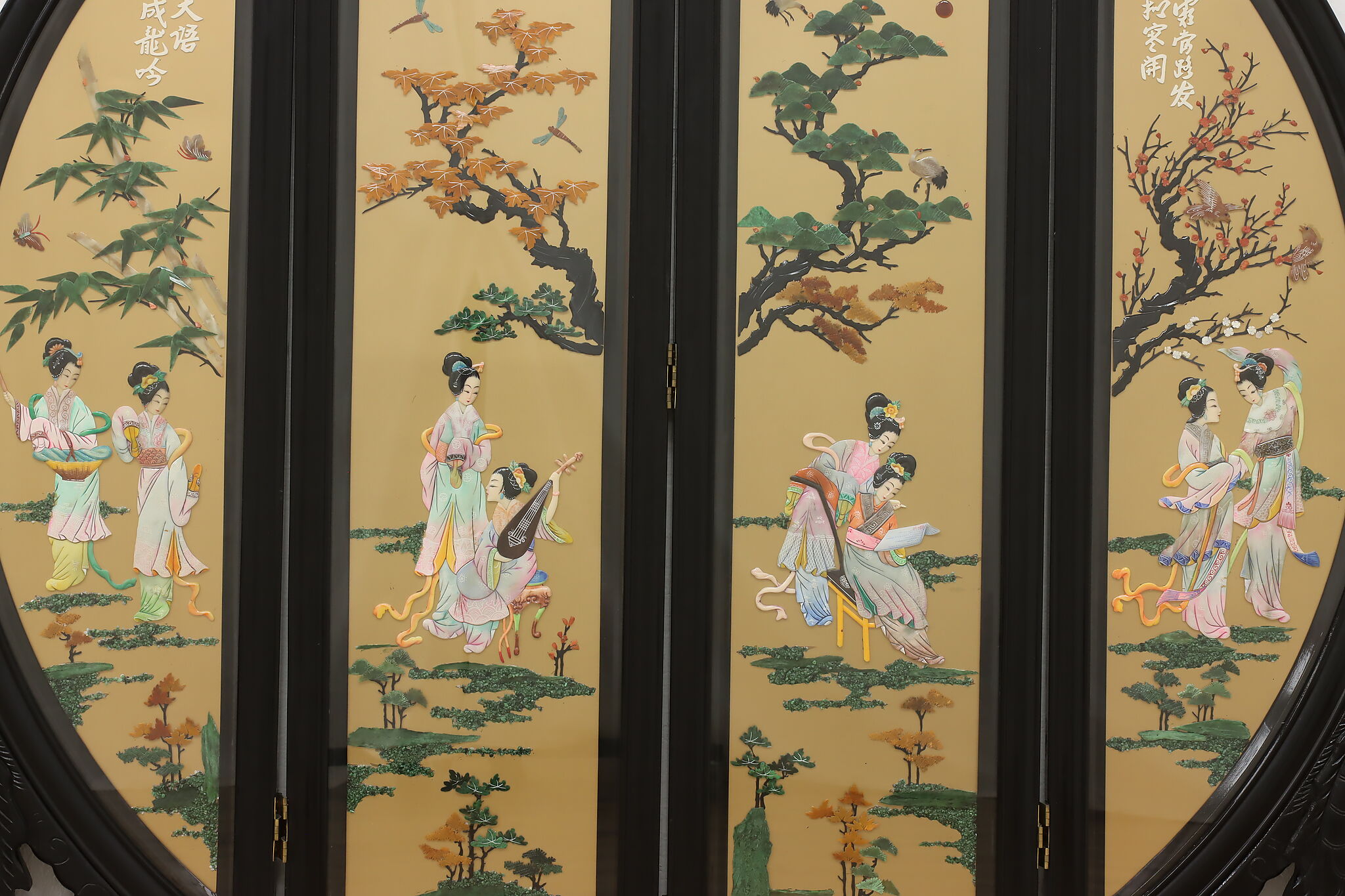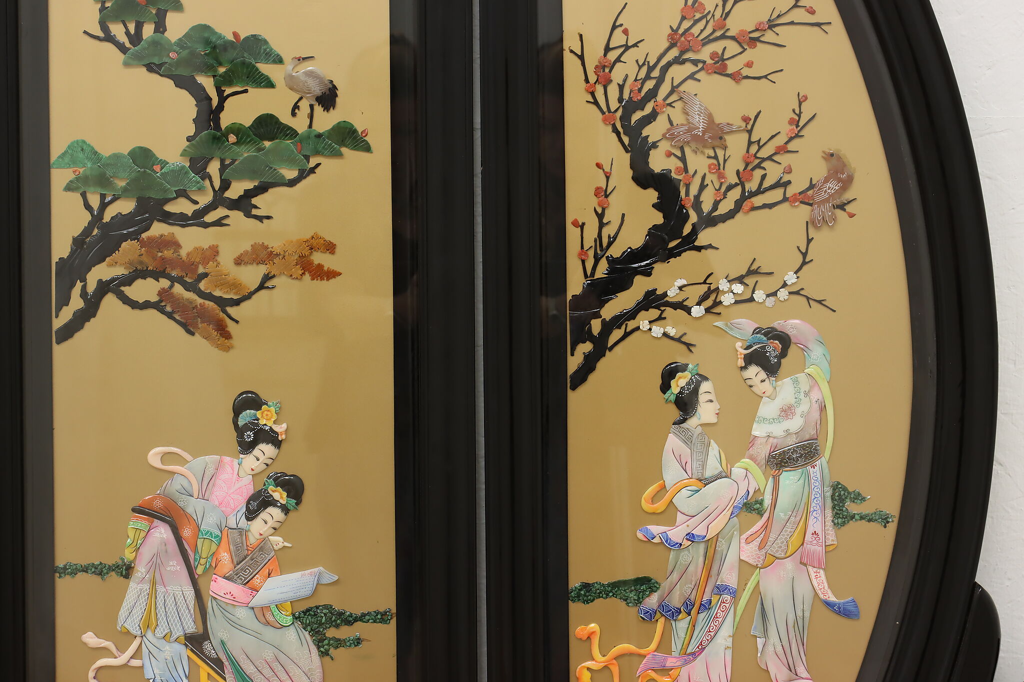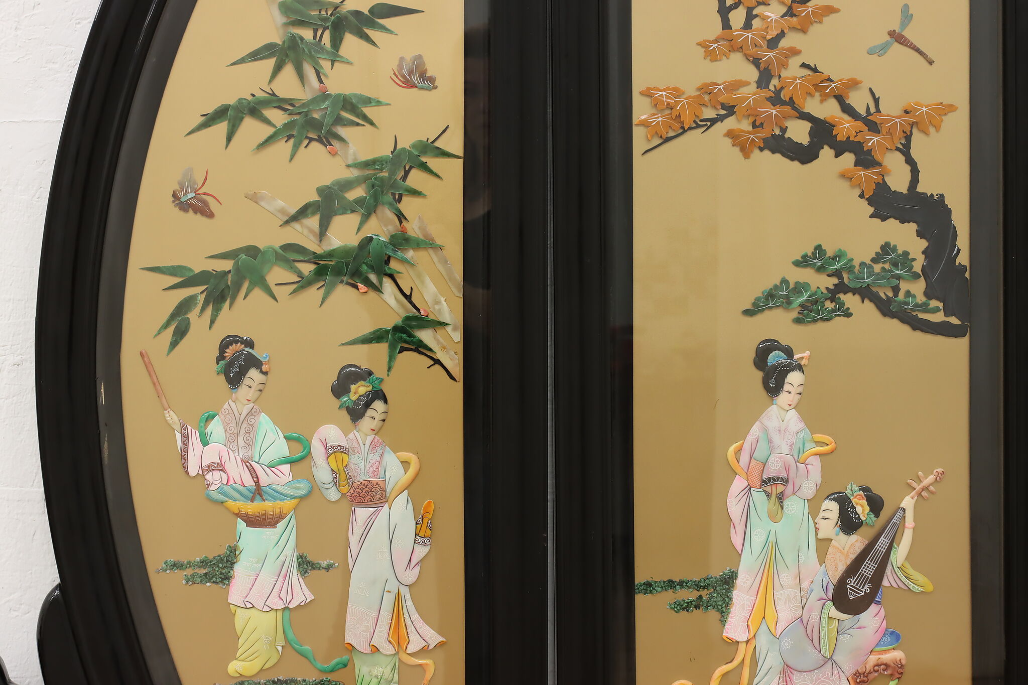 This beauty of a folding screen has hand-carved and engraved jade pieces that form scenes of traditional Japanese geisha women.