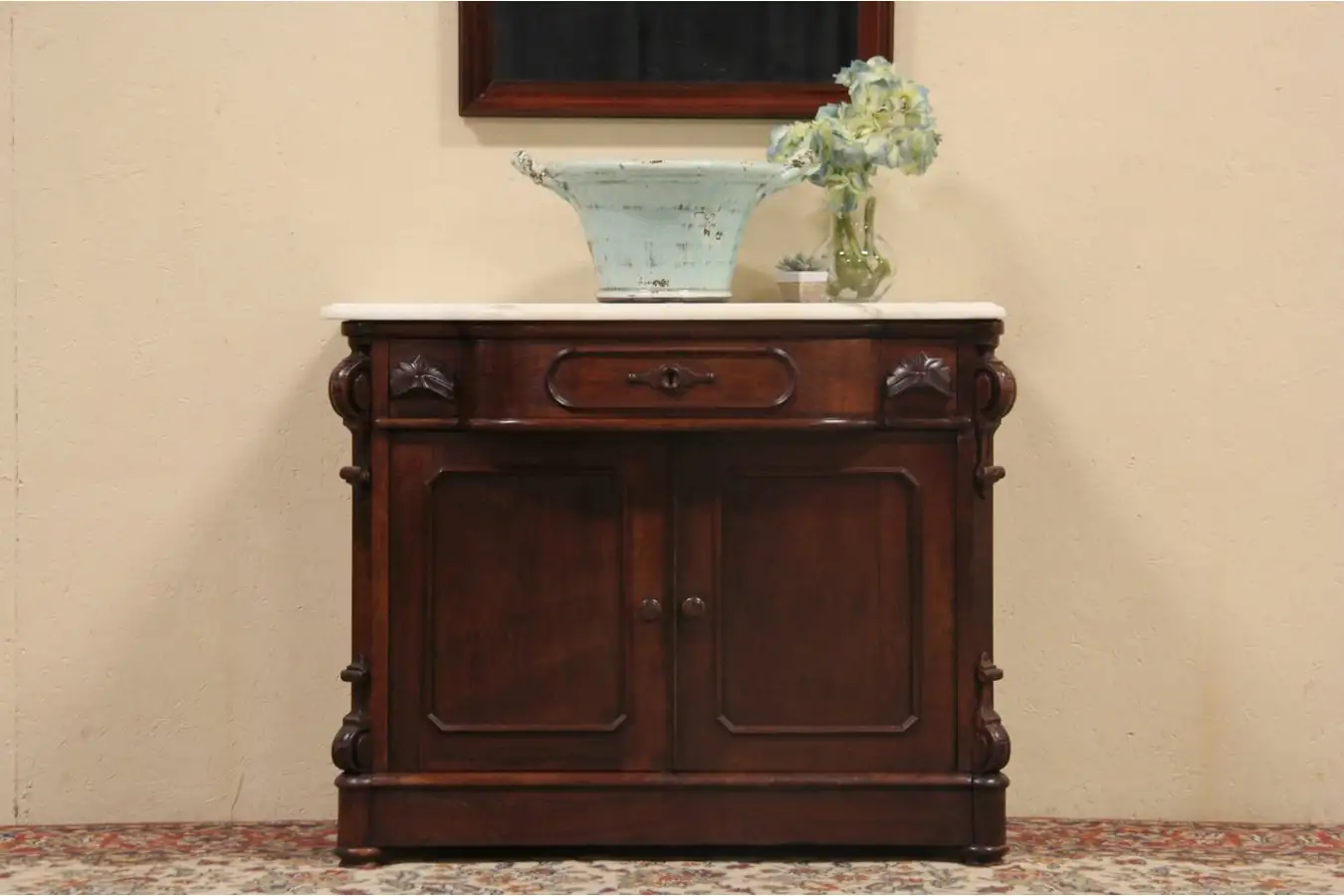 Signed by famous maker, "Jelliff" during the Victorian Renaissance period about 1870, this marble top chest or commode was used as a bedroom washstand - today it could be a vessel sink vanity or foyer console.