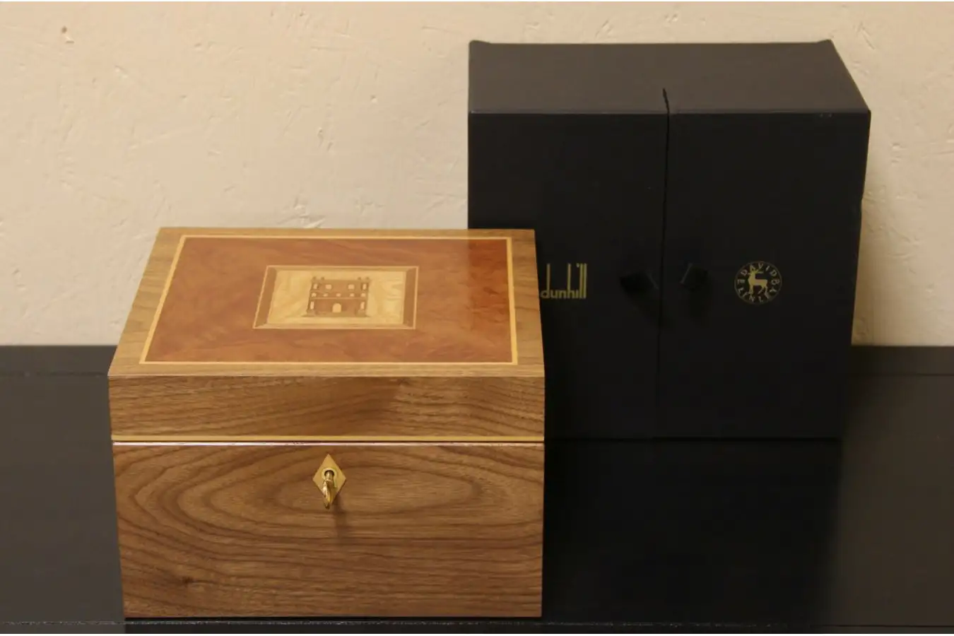 Never used, the original presentation case is included. The walnut box is inlaid with marquetry in elm, yew and burl, there are irregularities around the castle motif, see photos. Gold plated mounts include a lock and key. Inside are three lift out padded velvet jewelry trays, which are removable, and the mahogany lined case can be used as a humidor.